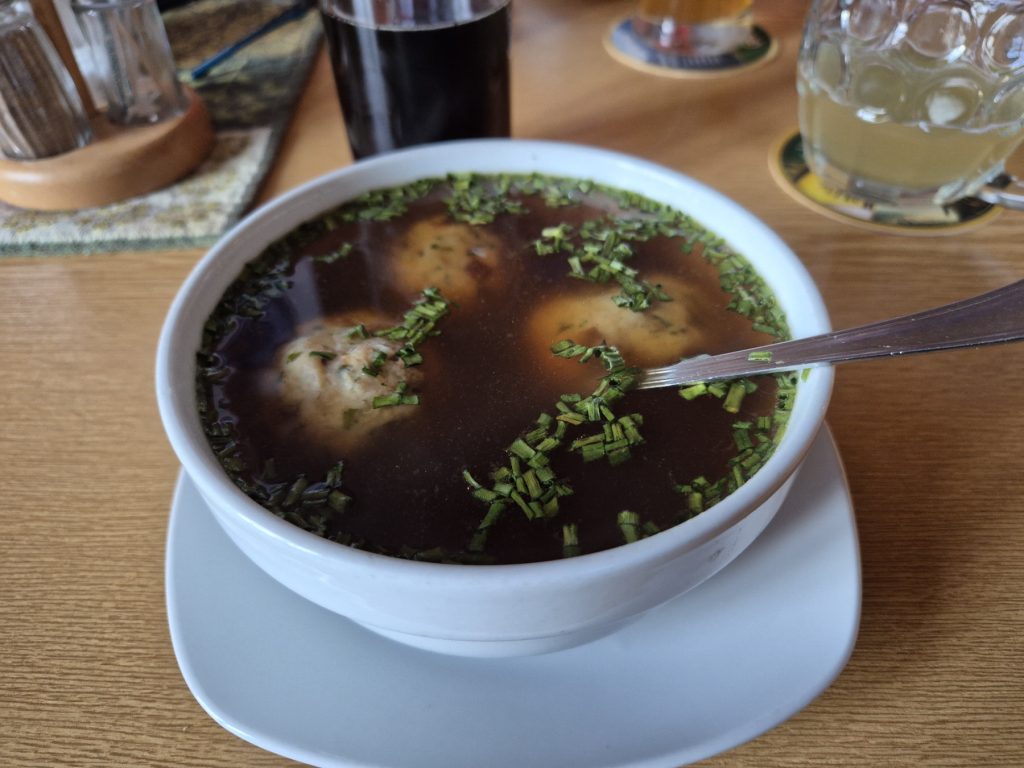 Der Tag war zwar schon weit fortgeschritten, aber die Einkehr zum Auffüllen der Energiespeicher – vor allem mit viel Flüssigkeit – war jetzt höchst notwendig. Der Heinrich wird jetzt keine Freude haben, wenn er erfährt, dass es statt der von uns verzehrten Tirolerknödelsuppe auch einen Schweinsbraten mit Sauerkraut und Knödel geben hätte. Aber auf diesen hätten wir 20 Minuten länger warten müssen. Und diese Zeit hatten wir definitiv nicht.