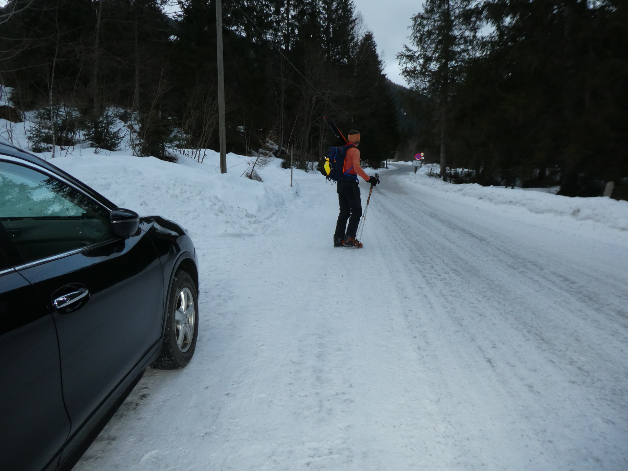 Nach der Tour auf die Seekoppe am Samstag habe ich sehr gerne das Angebot der Wirtsleute vom GH Grobbauer angenommen und mich am Sonntag telefonisch über die von den Hausgästen rückgemeldeten Verhältnisse am Hochrettelstein erkundigt. Diese waren so positiv, dass wir am heutigen Tag abermals nach Oppenberg aufgebrochen sind. Vom großen Parkplatz sind wir anfangs neben der Straße und nach dem Schranken auf der zwar geräumten, aber nicht gestreuten Forststraße in die Gulling gestartet.