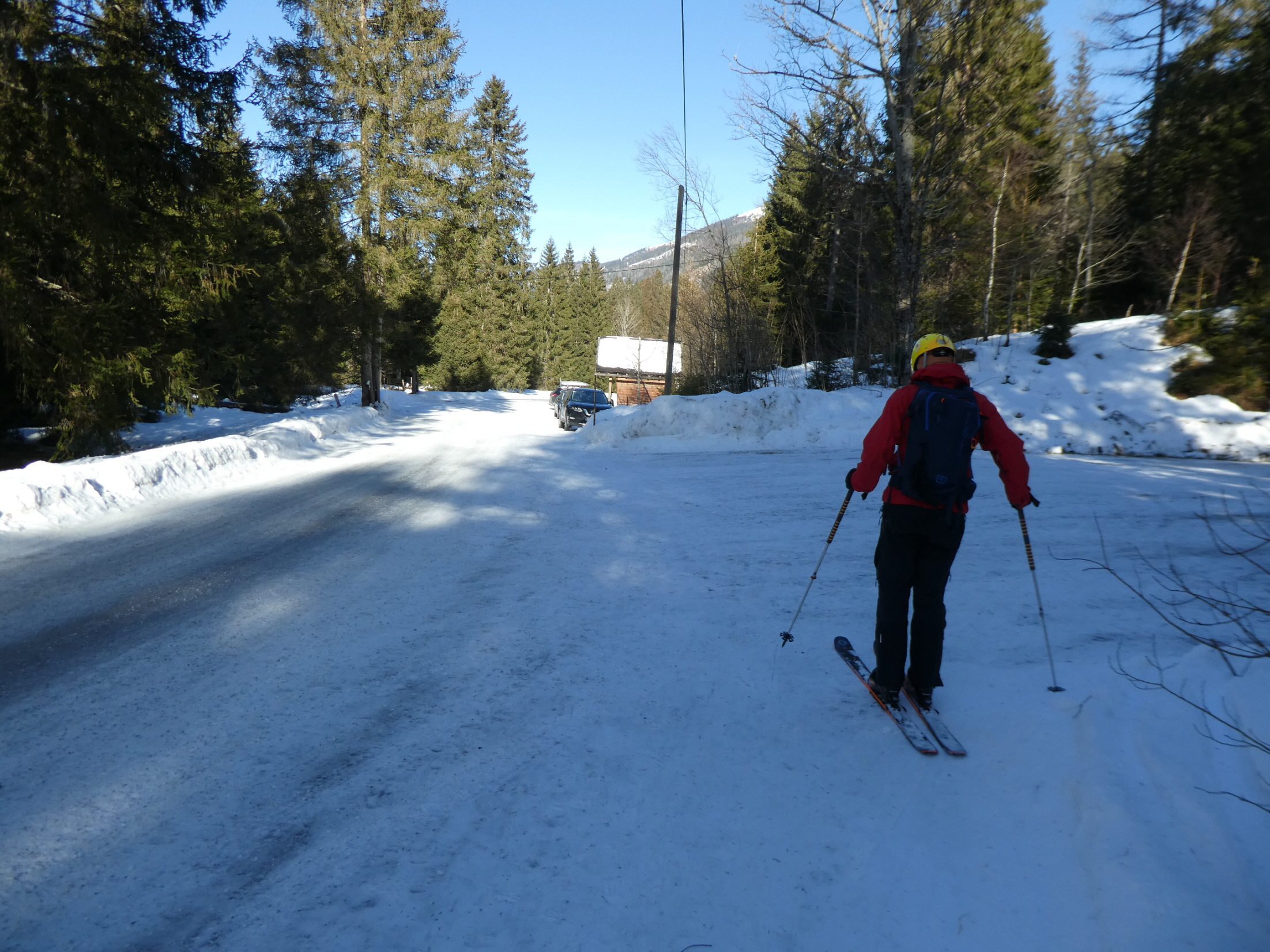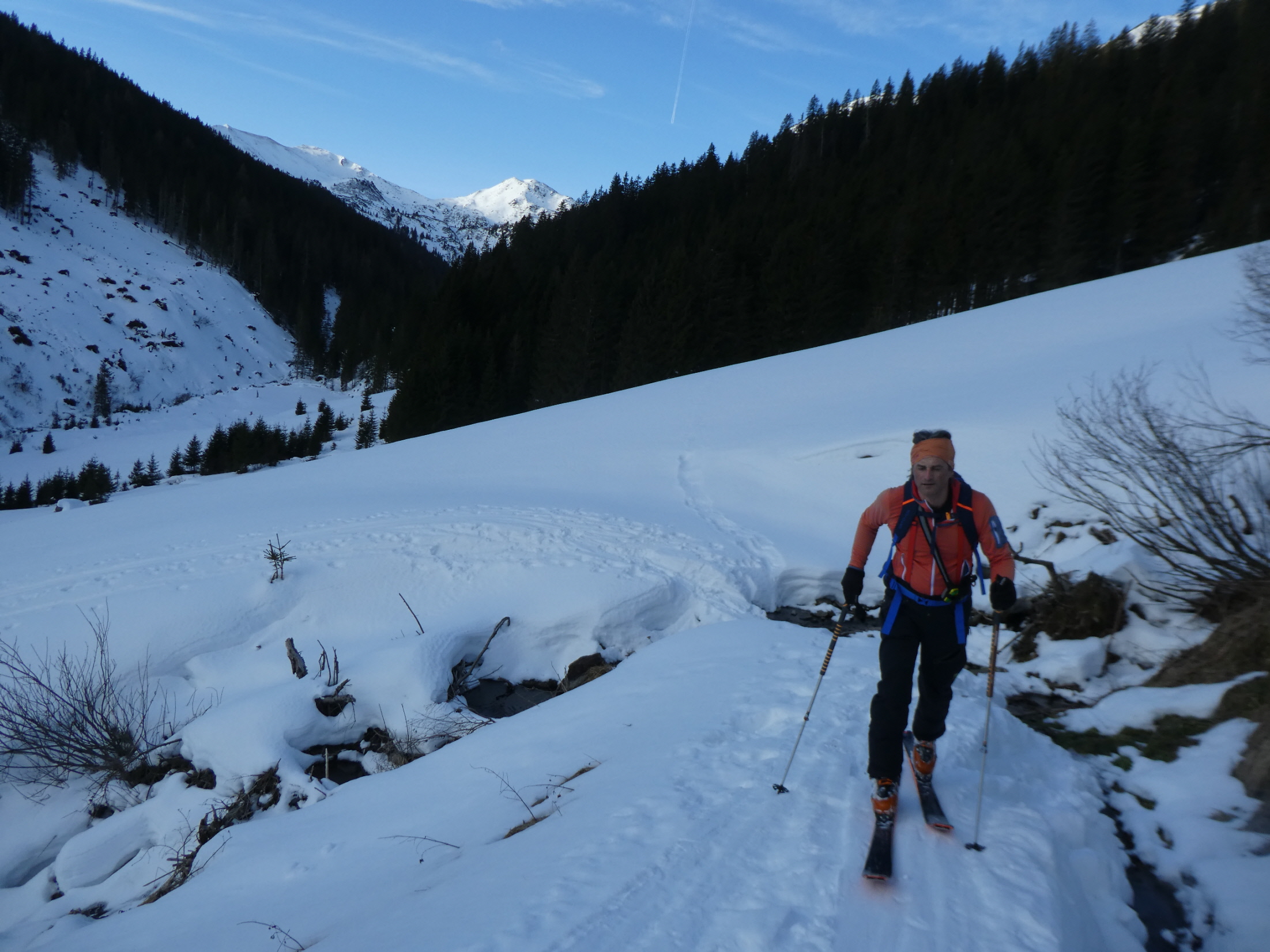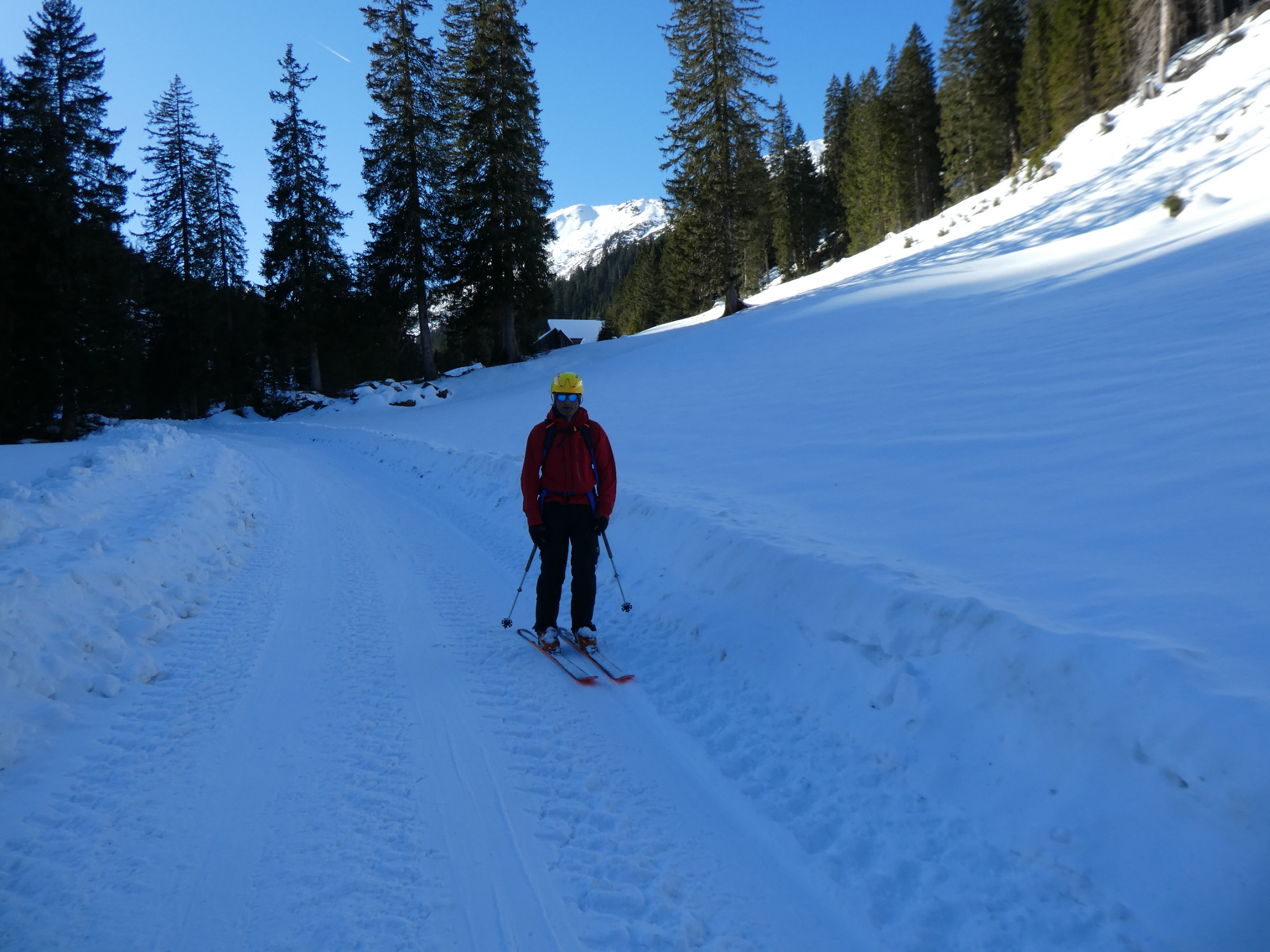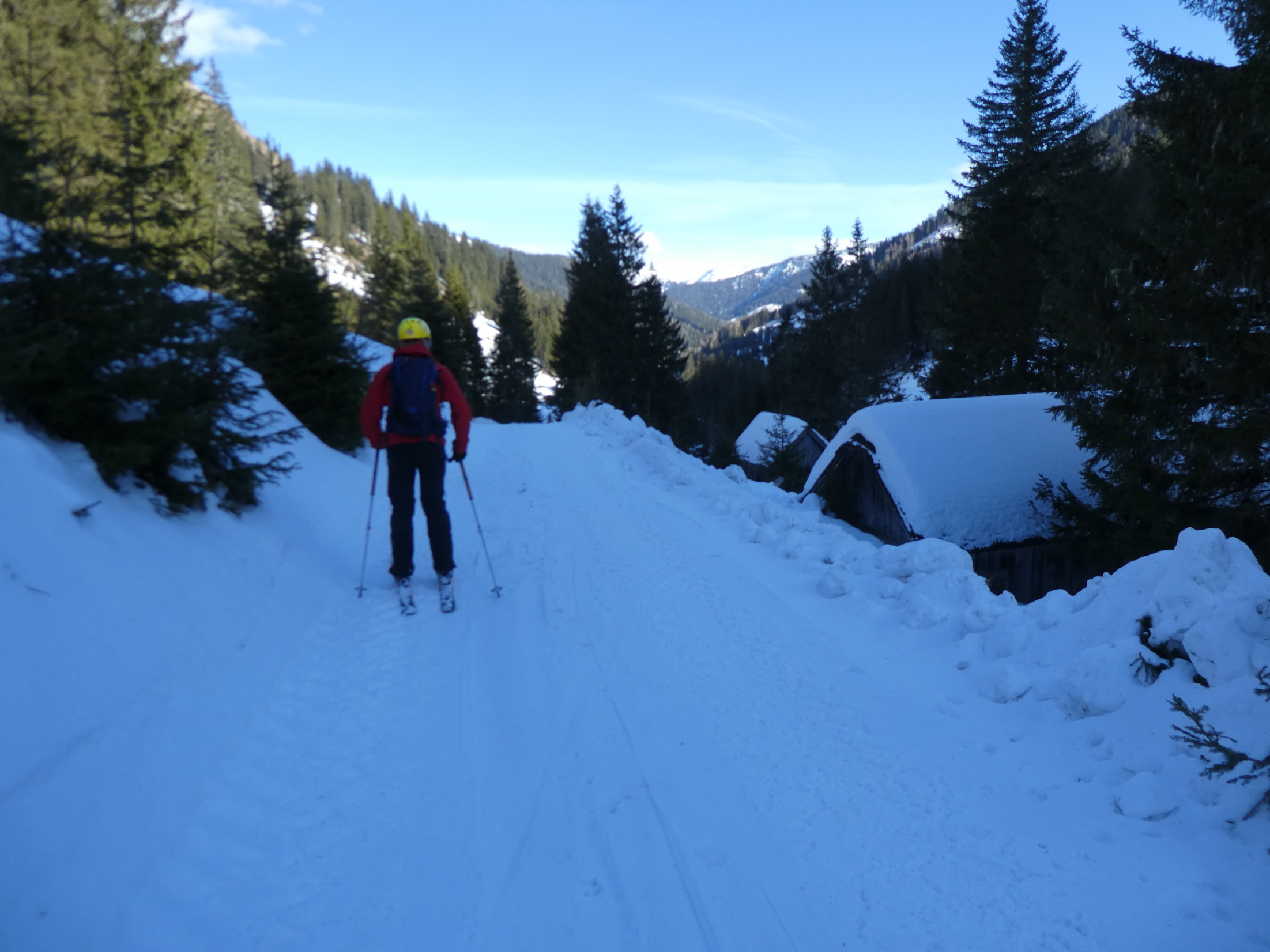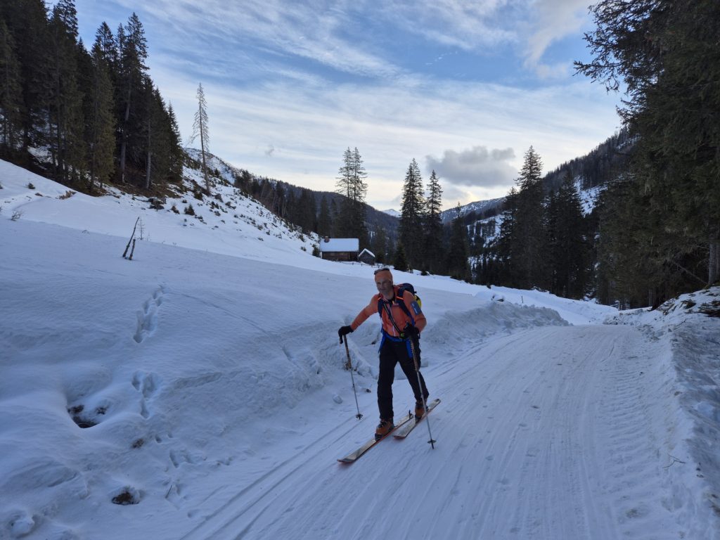 Mit Ausnahme einer Geländestufe, in der die Schneebänder zwischen den ausgeaperten Flächen ziemlich dünn, aber zum Hinunterrutschen immer noch breit genug waren, gab es im Vergleich zur Aufstiegsroute ausreichend Schnee. So haben wir auch den Rest der Abfahrt bis hinunter zum Forsthaus noch sehr genussvoll absolviert.