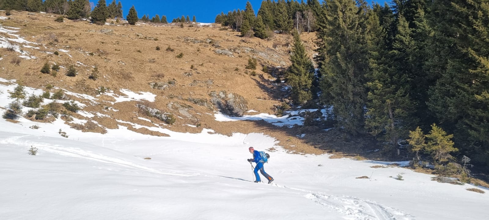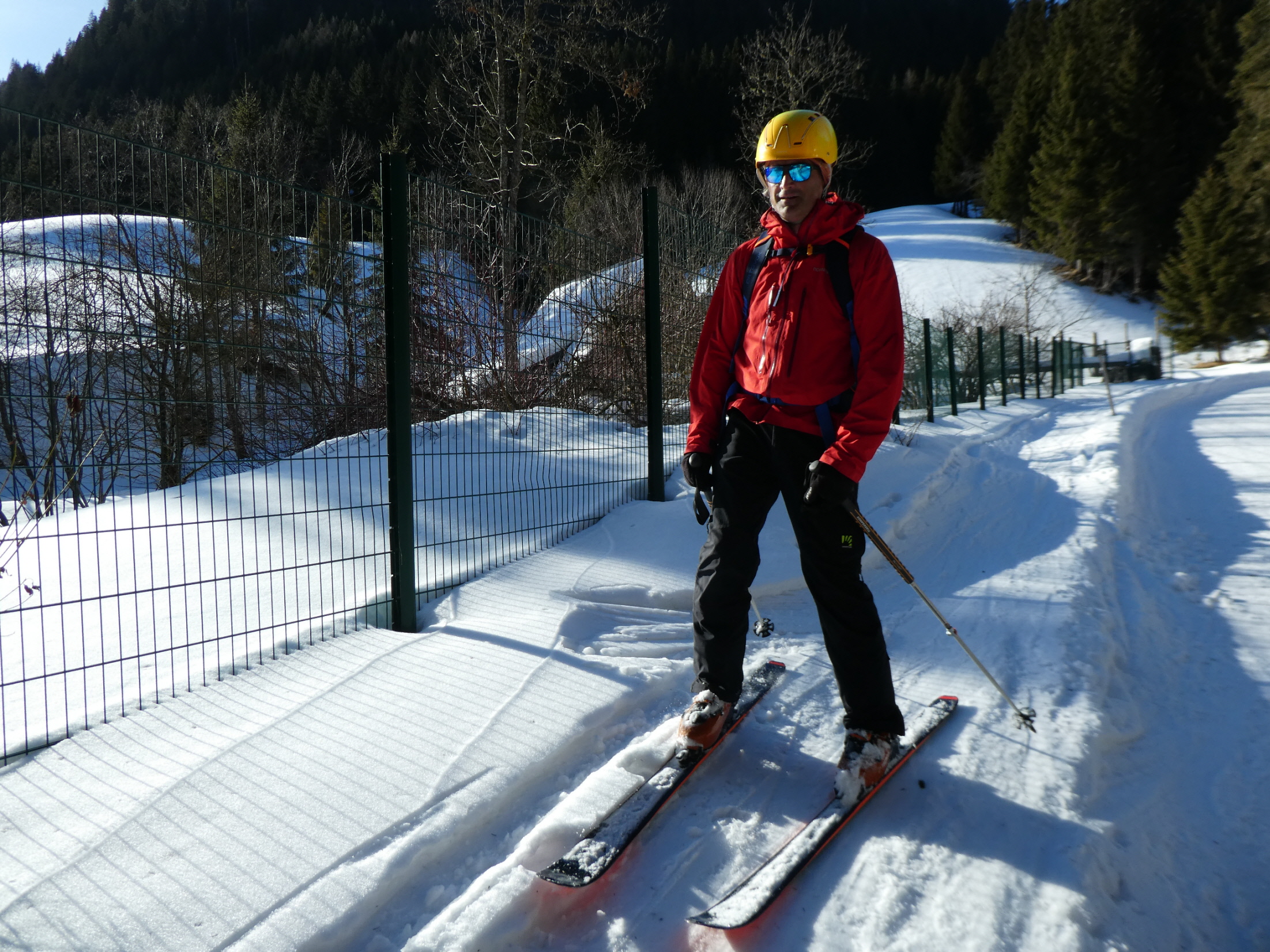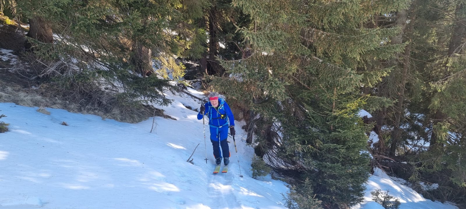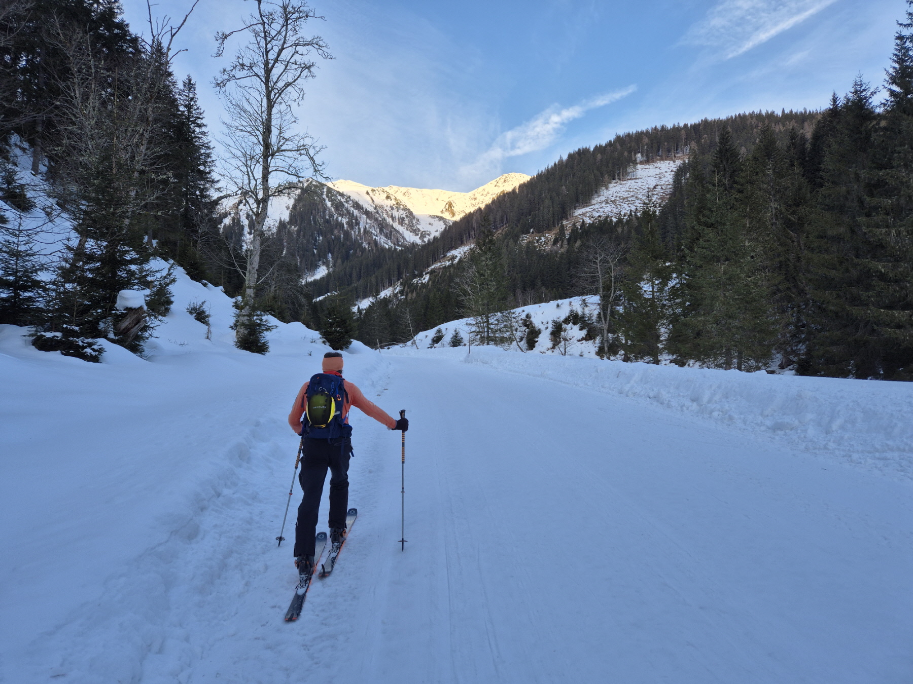 Mit Ausnahme einer Geländestufe, in der die Schneebänder zwischen den ausgeaperten Flächen ziemlich dünn, aber zum Hinunterrutschen immer noch breit genug waren, gab es im Vergleich zur Aufstiegsroute ausreichend Schnee. So haben wir auch den Rest der Abfahrt bis hinunter zum Forsthaus noch sehr genussvoll absolviert.