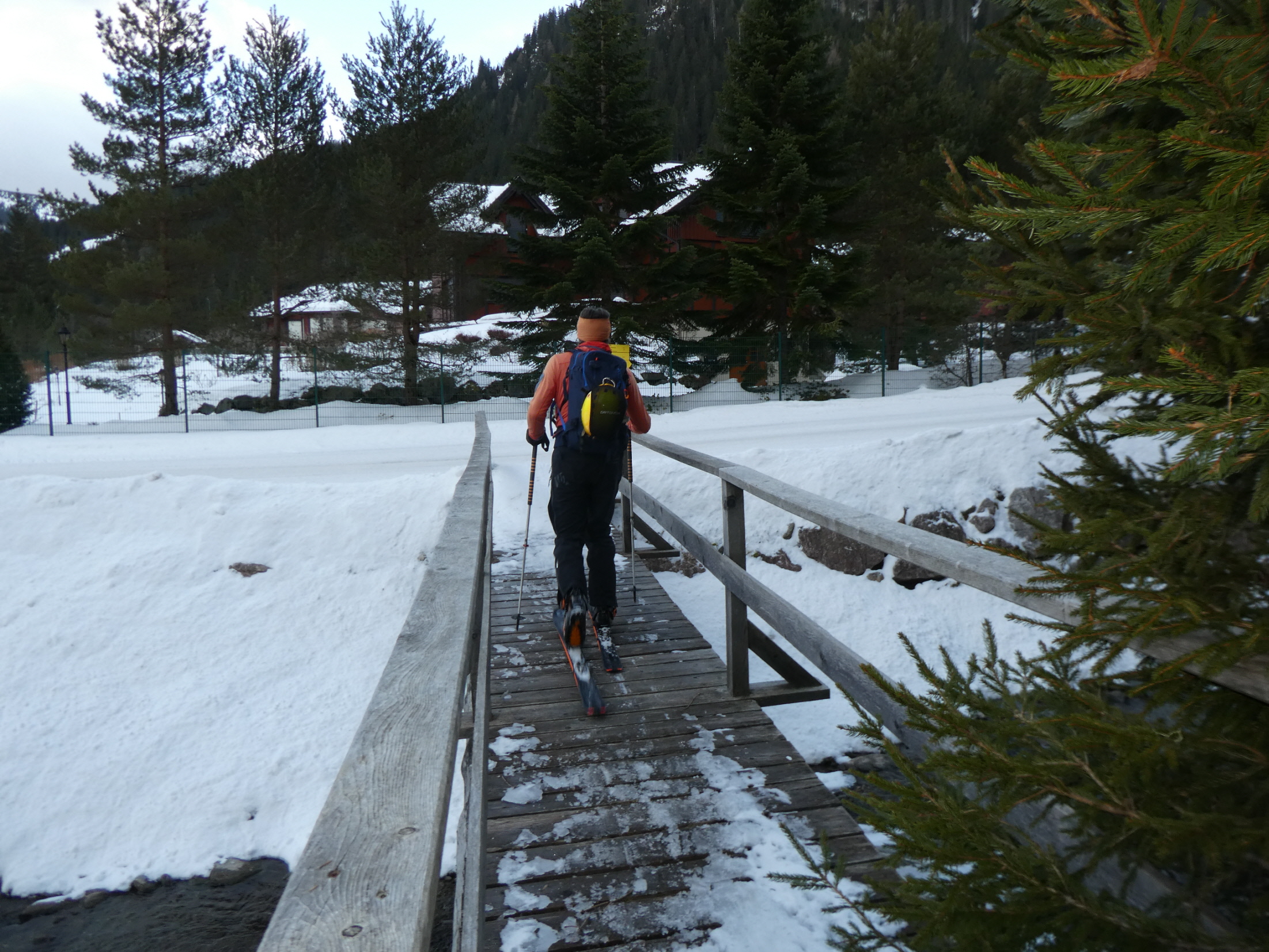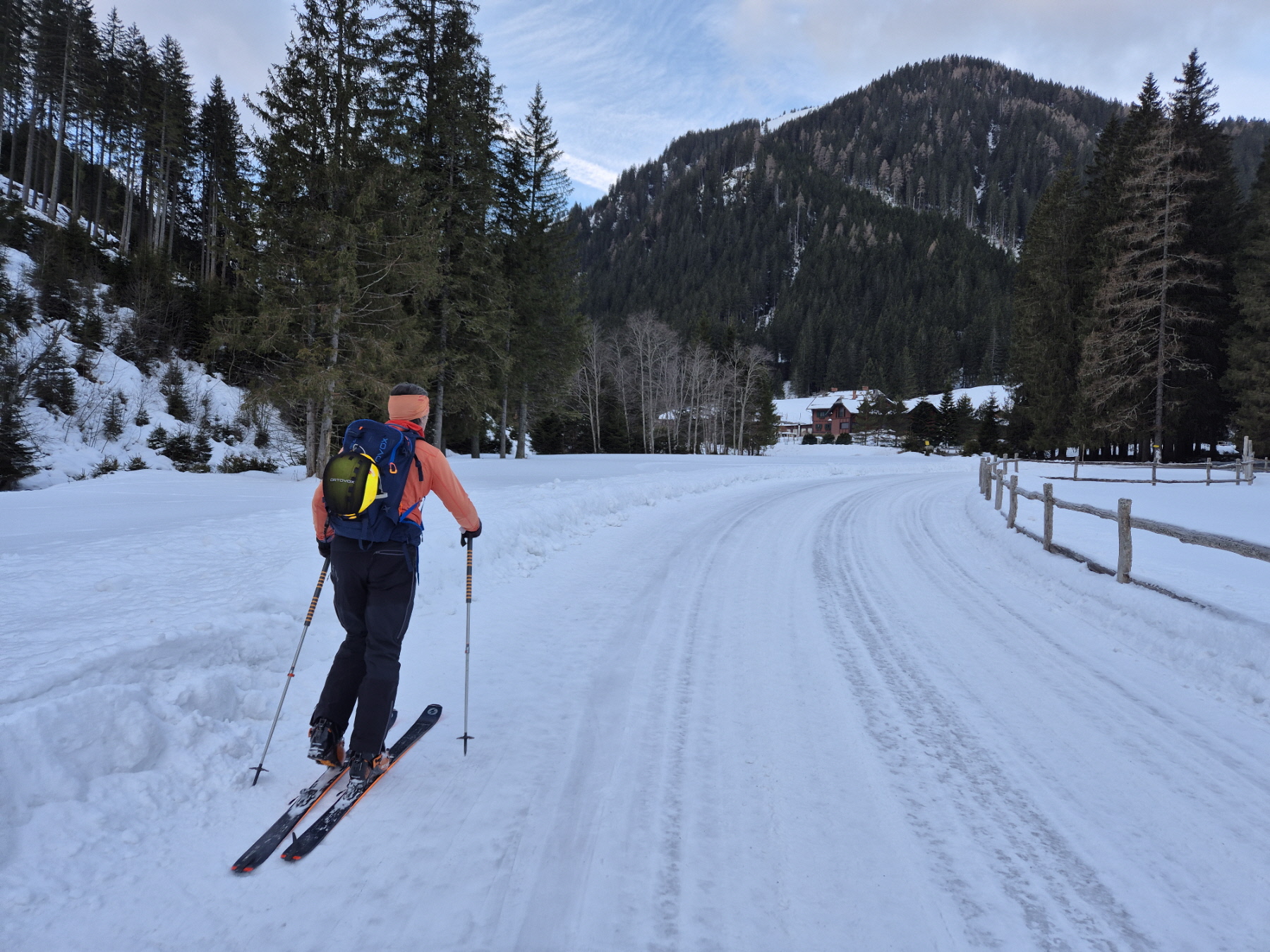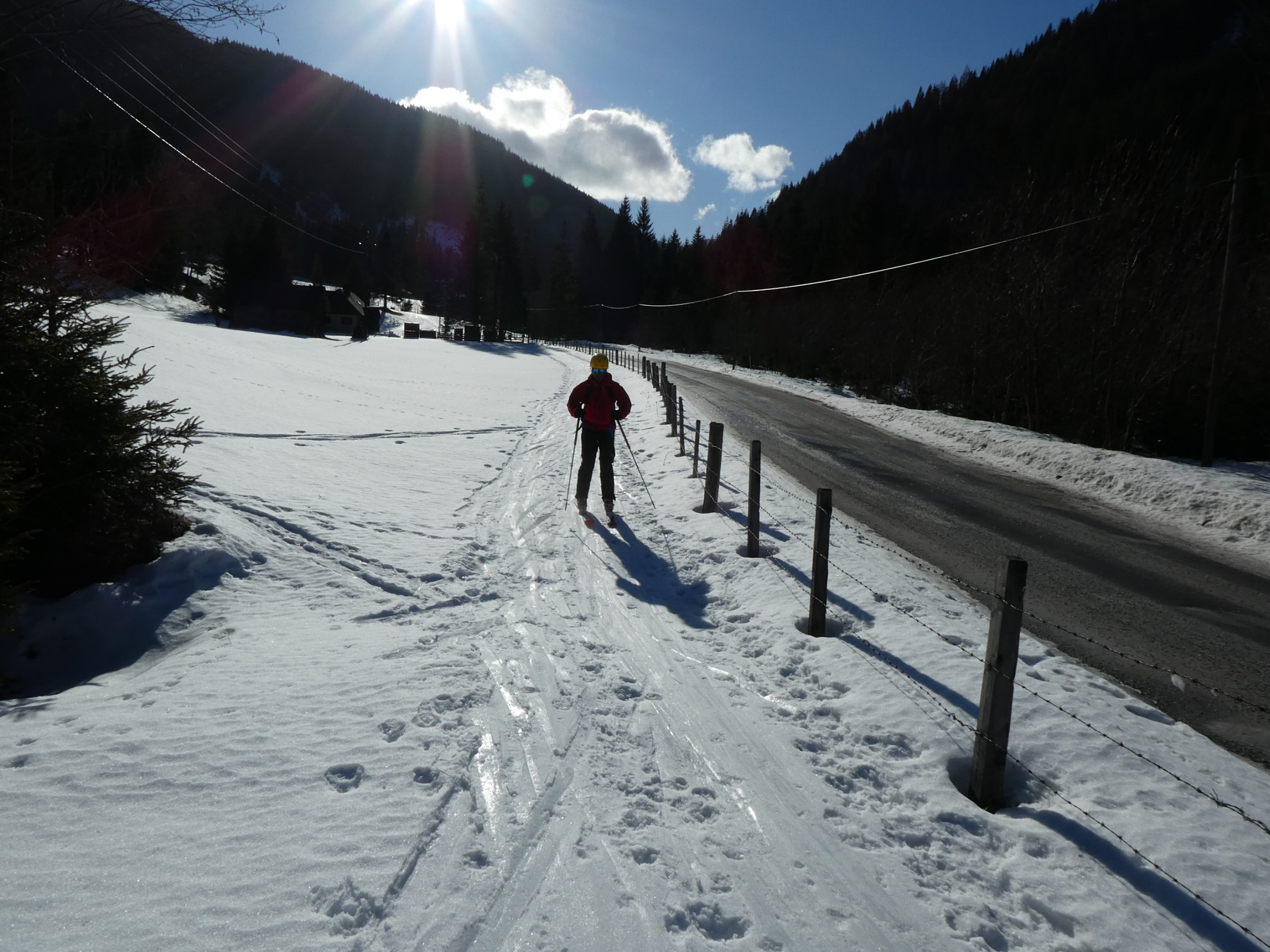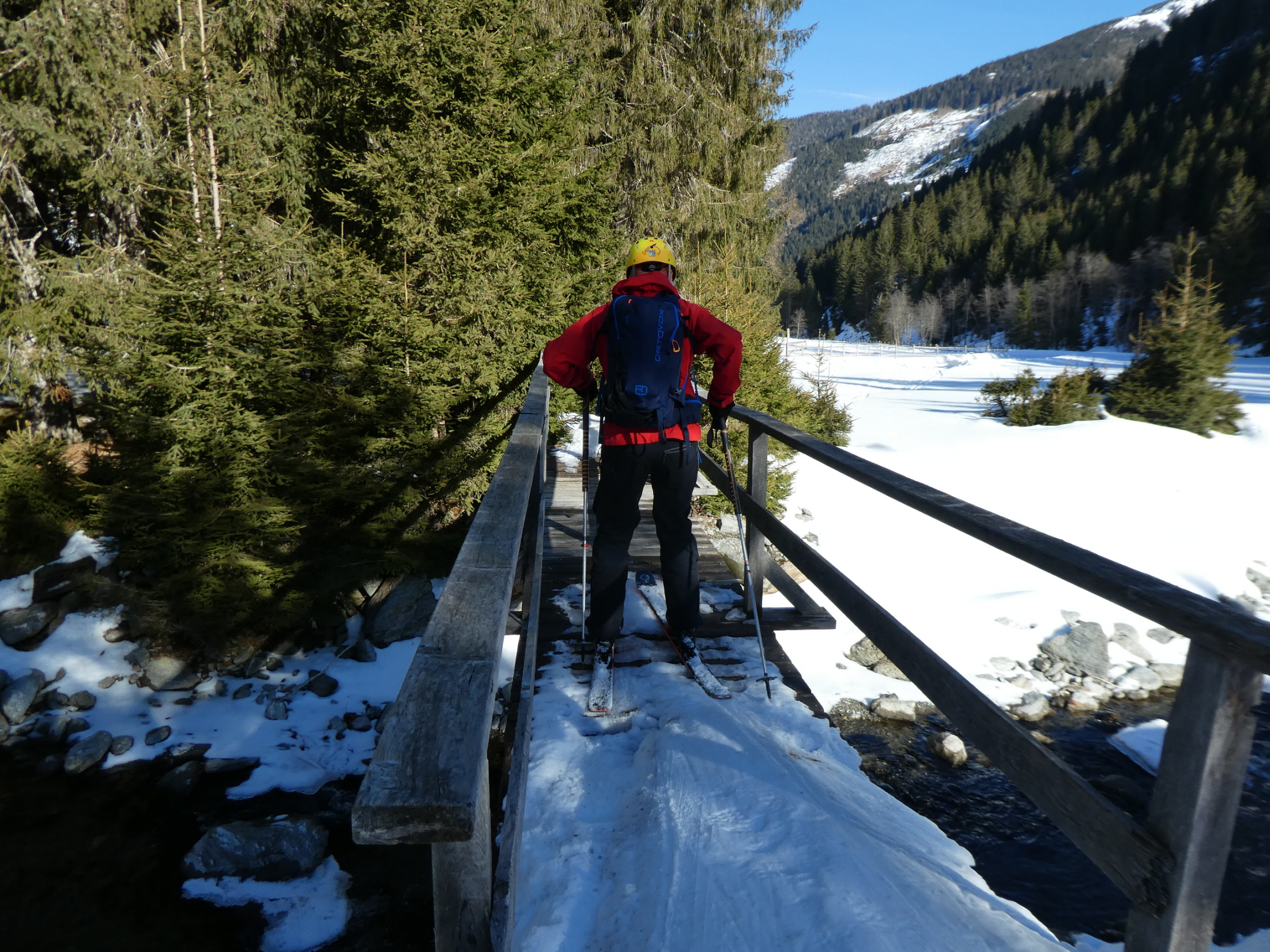 Mit Ausnahme einer Geländestufe, in der die Schneebänder zwischen den ausgeaperten Flächen ziemlich dünn, aber zum Hinunterrutschen immer noch breit genug waren, gab es im Vergleich zur Aufstiegsroute ausreichend Schnee. So haben wir auch den Rest der Abfahrt bis hinunter zum Forsthaus noch sehr genussvoll absolviert.