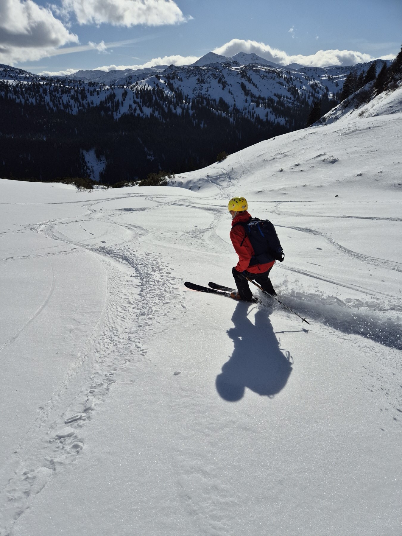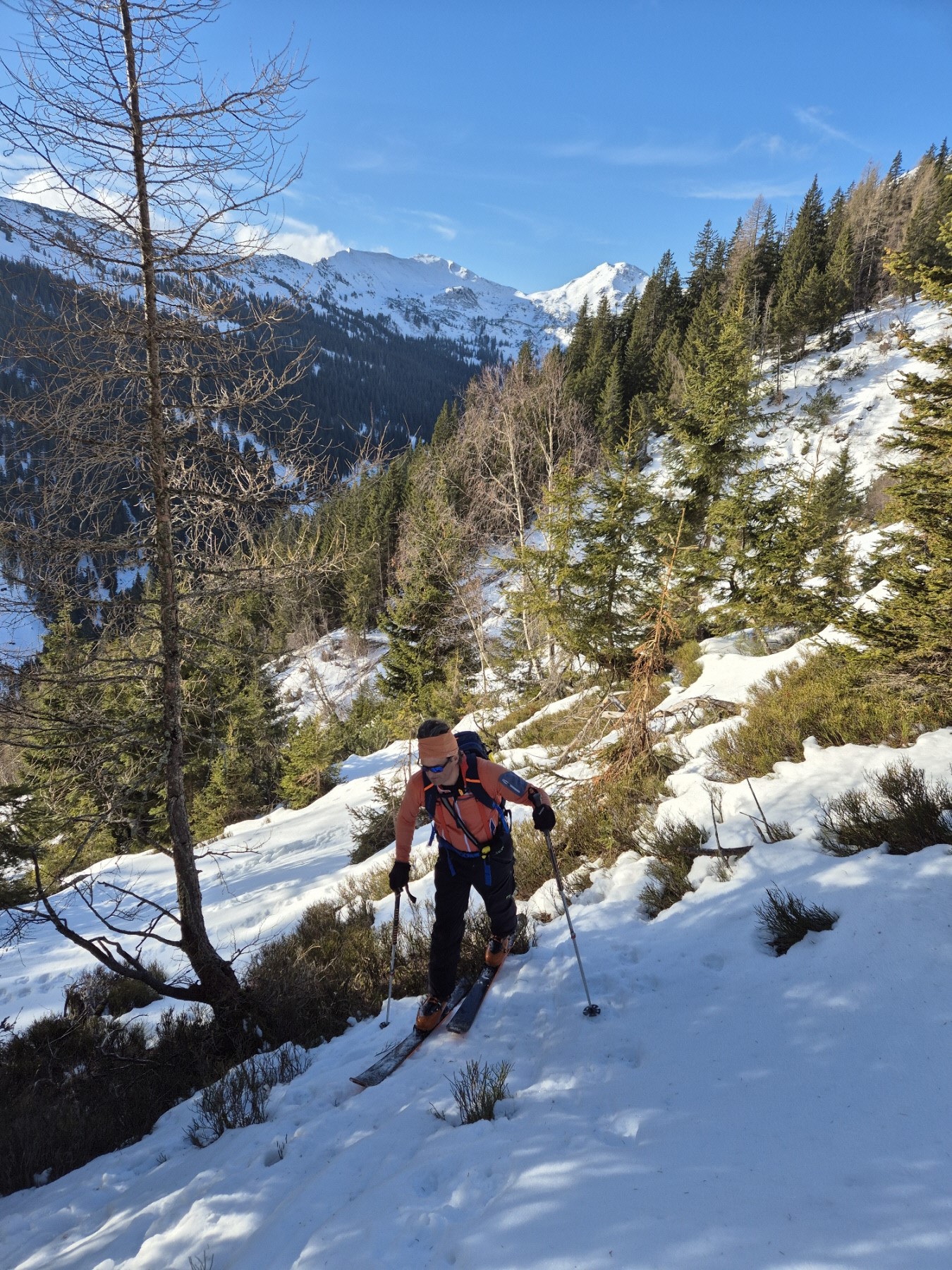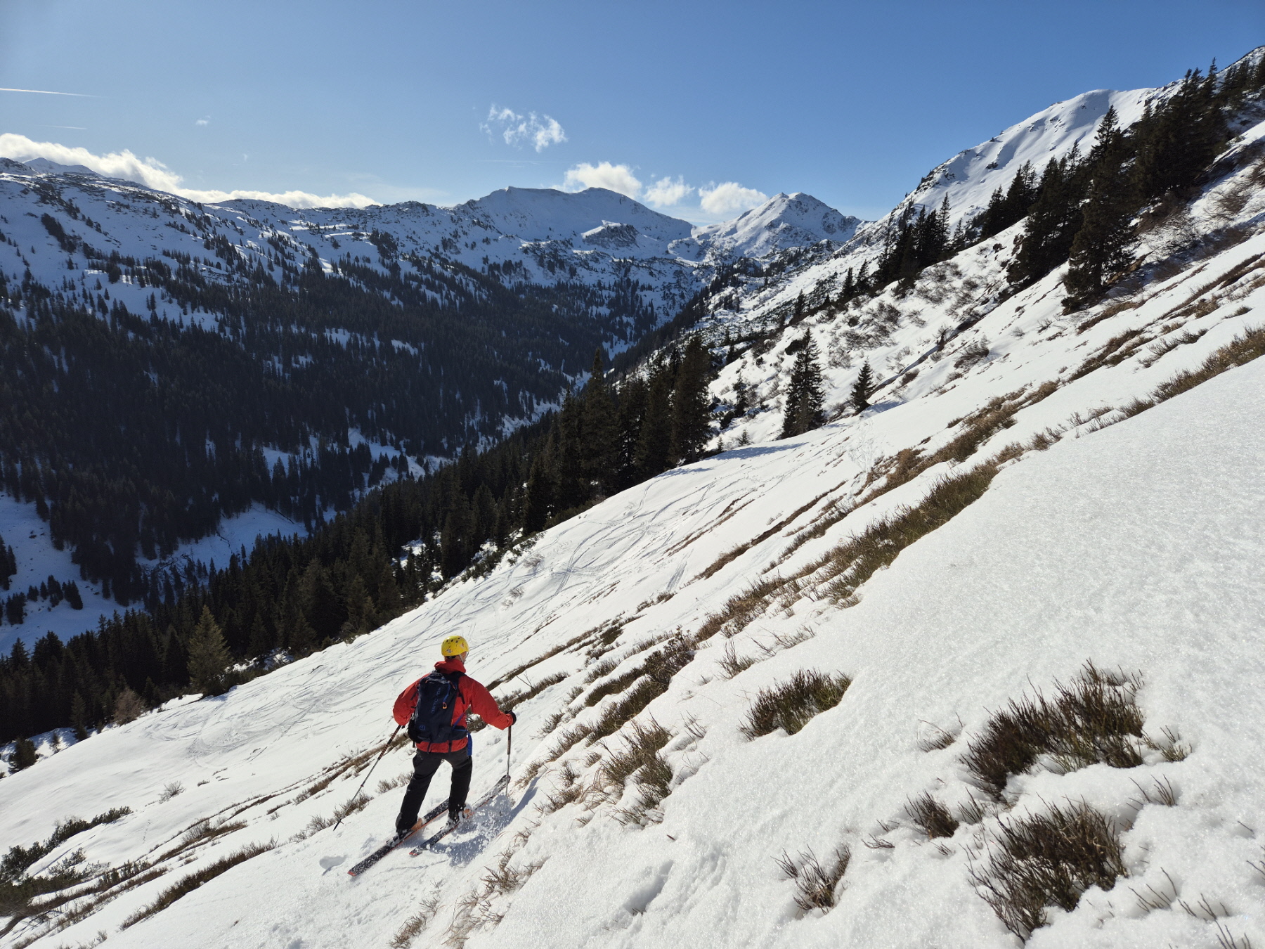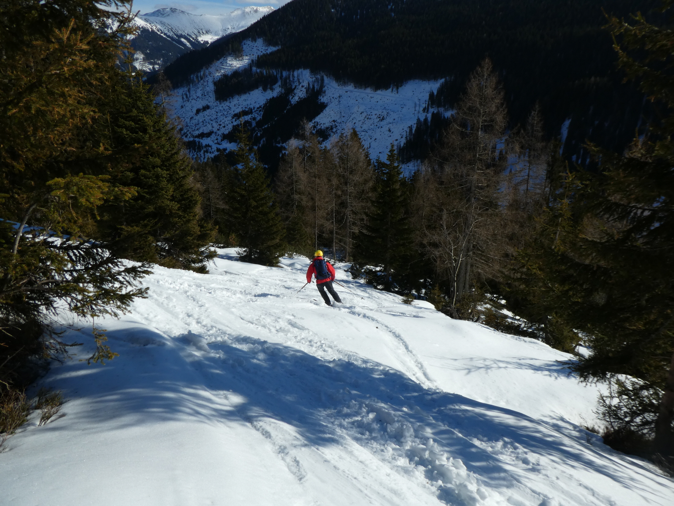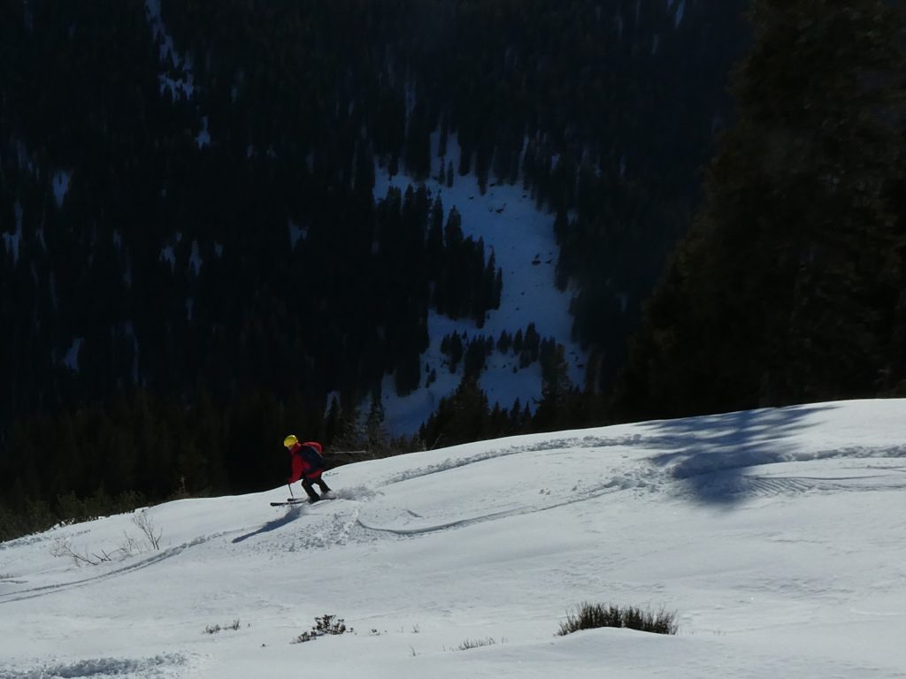 Schließlich haben wir unsere Aufstiegsspur links liegen gelassen und sind einigen Abfahrtsspuren in westliche Richtung, also taleinwärts gefolgt.  Über Schläge bzw. lockeren Baumbestand ging es dort weiter abwärts. Der bereits umgewandelte Schnee ist in der Sonne aufgegangen und war auch gut fahrbar.