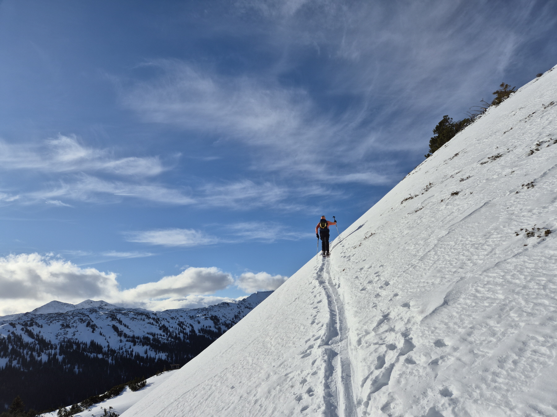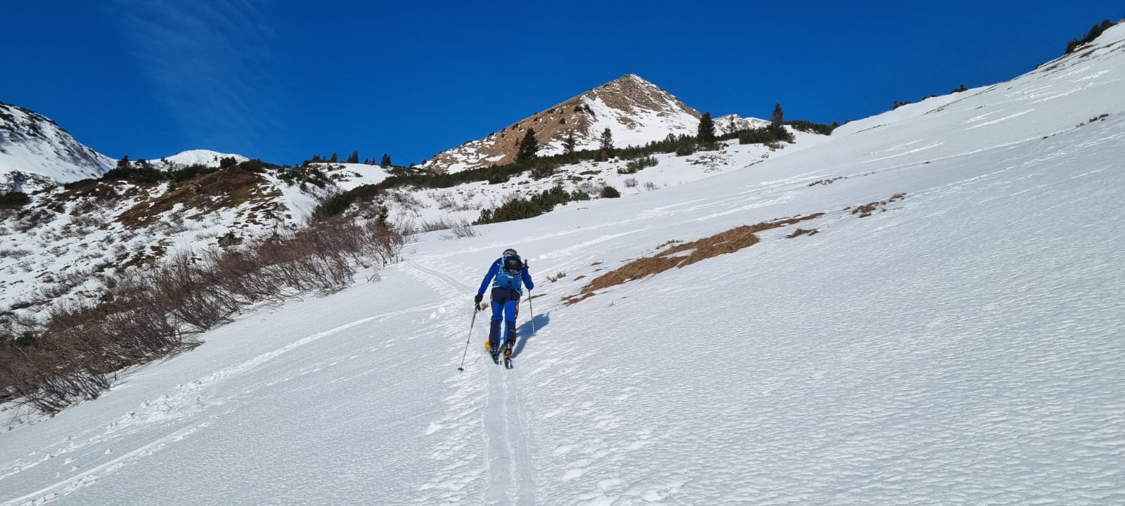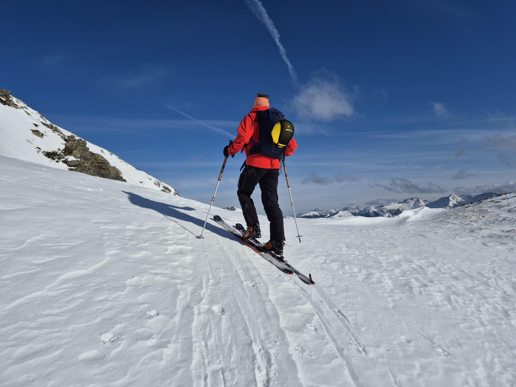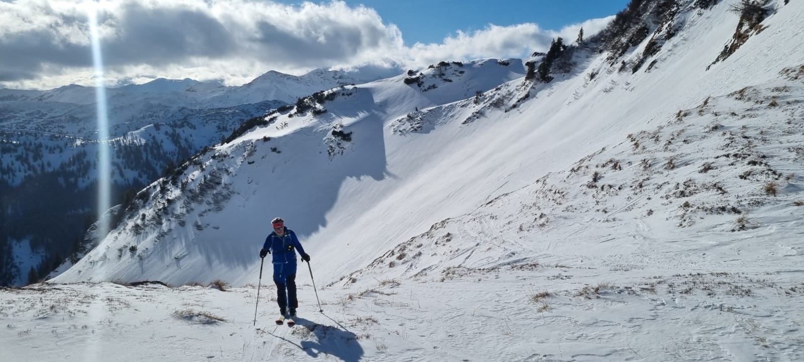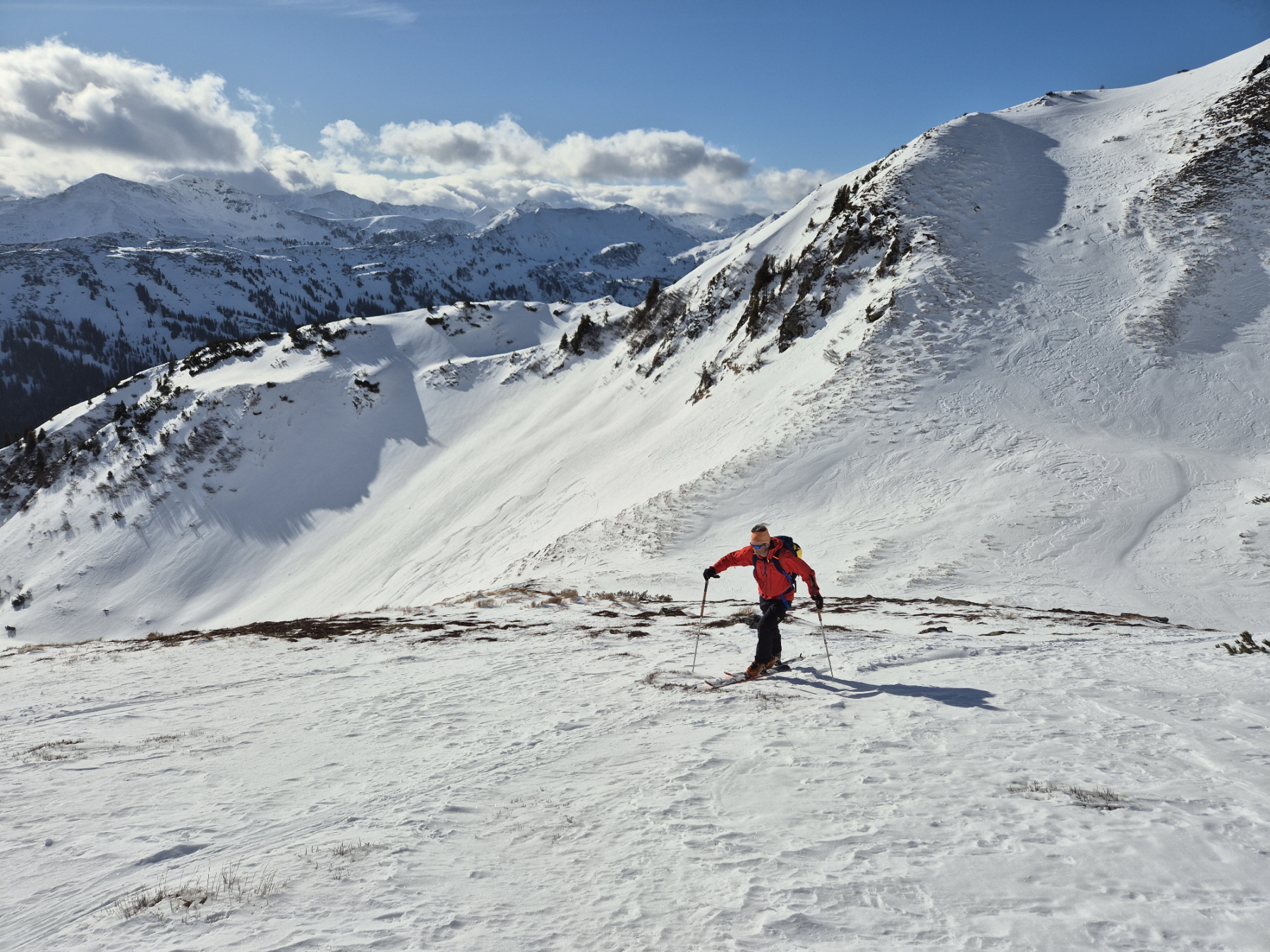 Nach einer kurzen Zwischenabfahrt und einer anschließenden Steilstufe sind wir dann ins weite Kar der klassischen Plientenabfahrt hinein gequert und in diesem weiter angestiegen. Eine frische Brise hat uns bei einer Trinkpause dazu veranlasst, die Oberbekleidung zu ergänzen. In vielen weiteren Kehren sind wir  am rechten Rand des Kars weiter angestiegen. Knapp vor dem Ausstieg zum Vorgipfel haben meine Felle stark angestollt. Beim Versuch, die Knollen auf dem harten Untergrund abzuklopfen hat sich eine meiner Bindungen geöffnet. Dem hinunterkollernden Ski musste ich nachsteigen und nach dem Anschnallen einige Höhenmeter daher doppelt absolvieren.