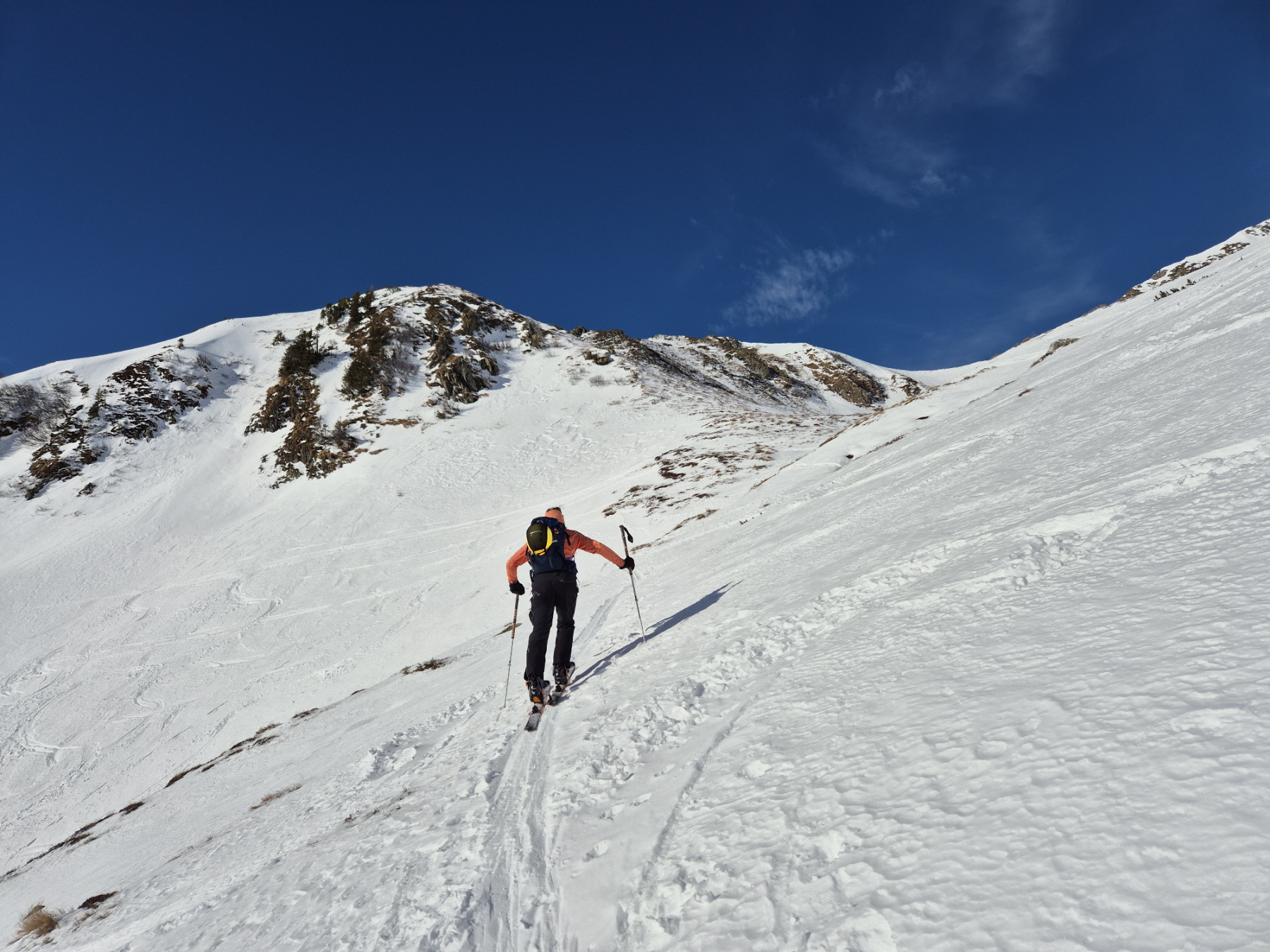 Jetzt sind wir aber mit geschulterten Skiern entlang des Grats in Richtung Westen bis zum oberen Ende des durchgehenden Schneebandes abgestiegen. Ein Hoch auf denjenigen, der mitgedacht und davor am Gipfel seine Skischuhe noch nicht in den Abfahrtsmodus getrimmt und fest zugeknallt hat – so wie ich 😉.