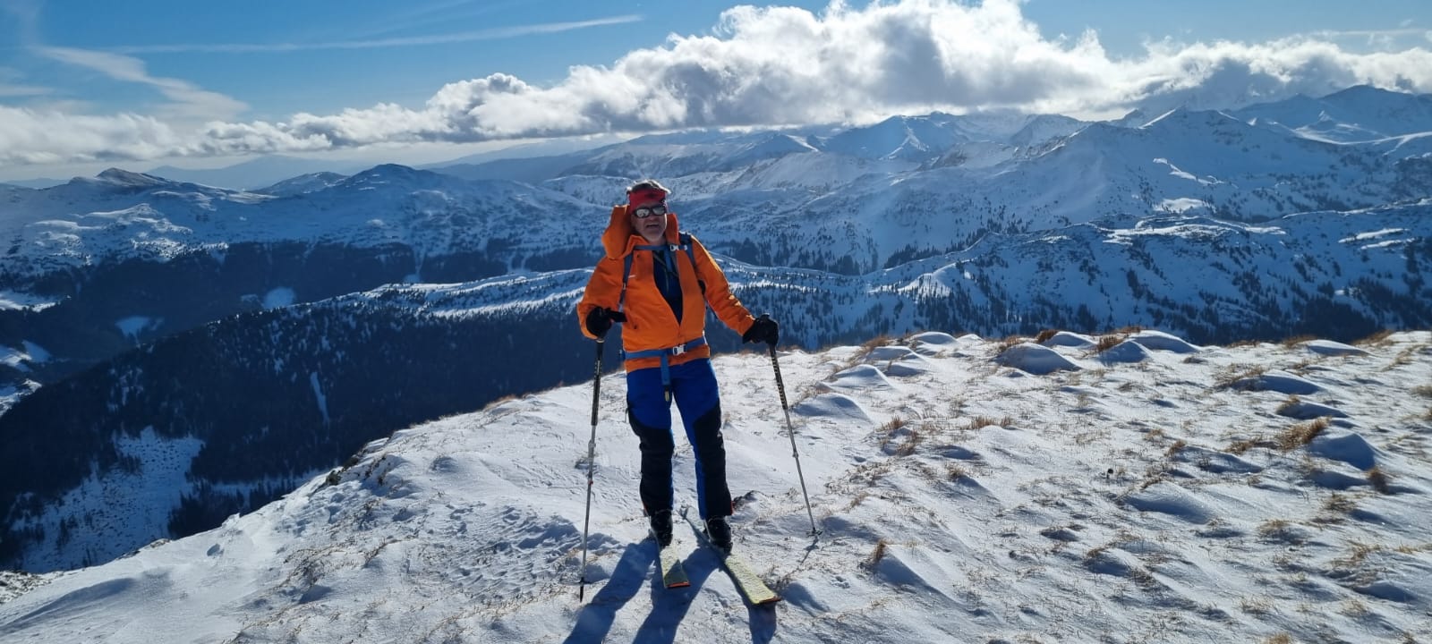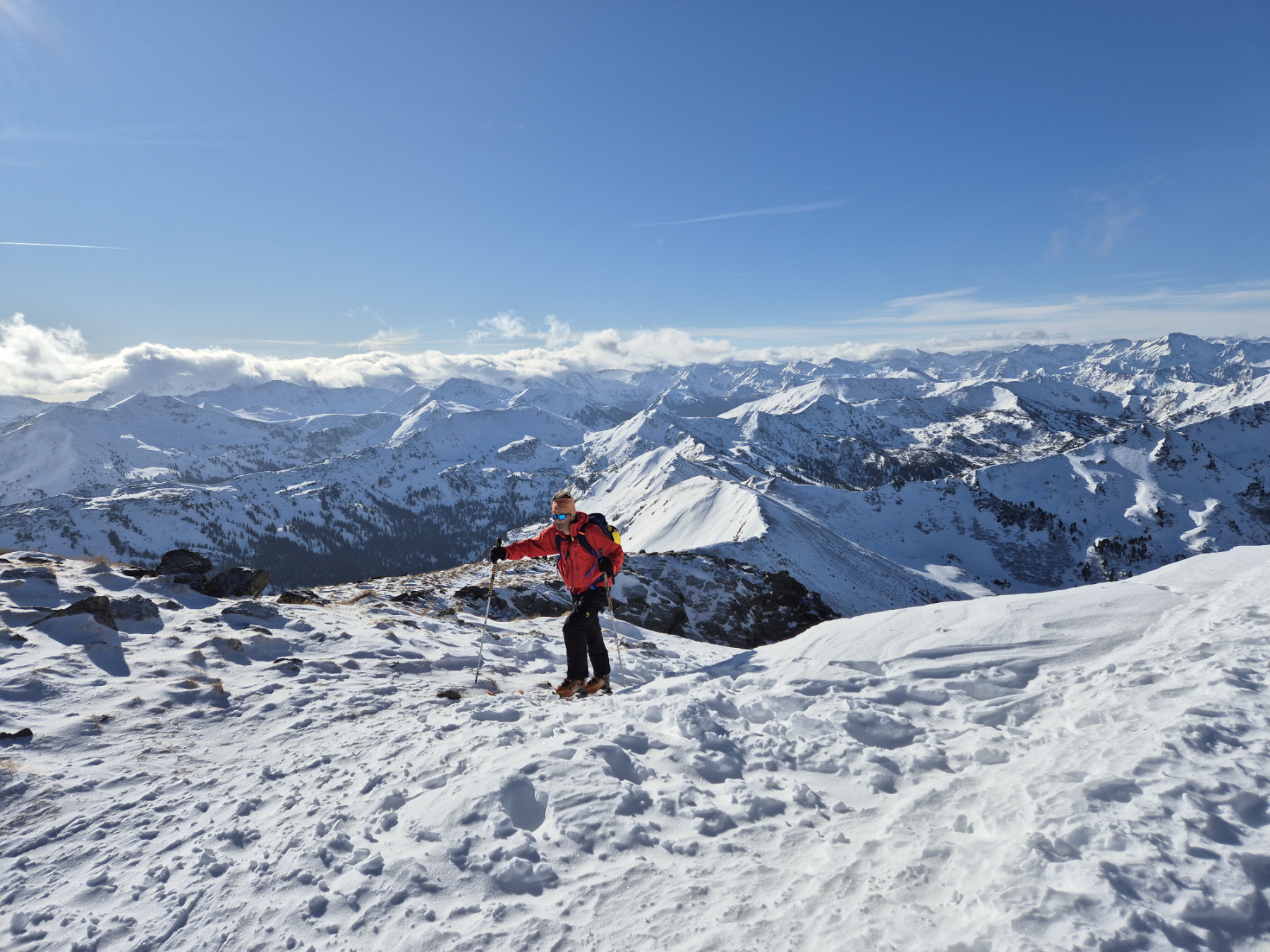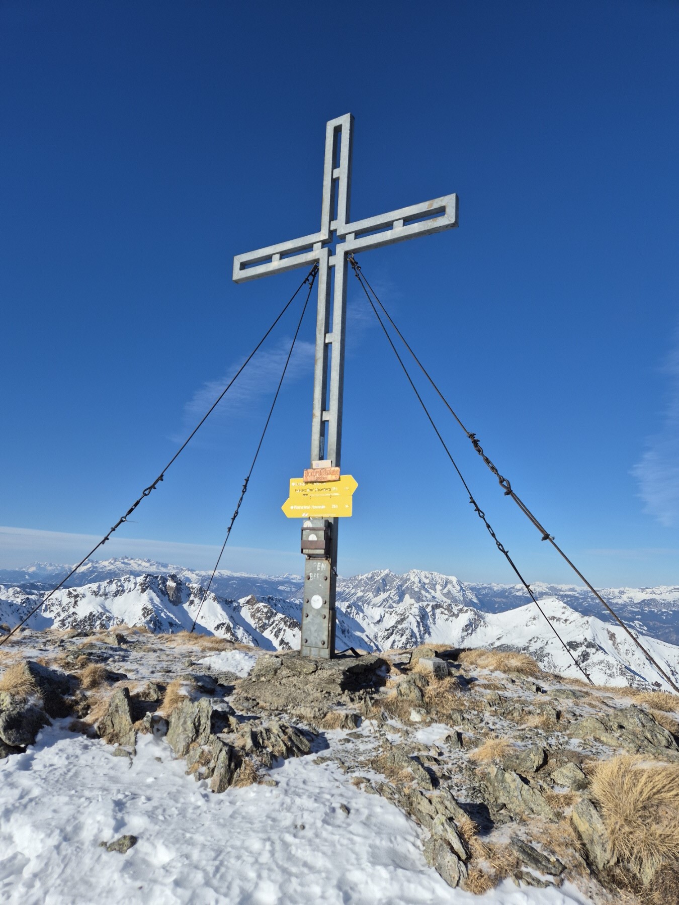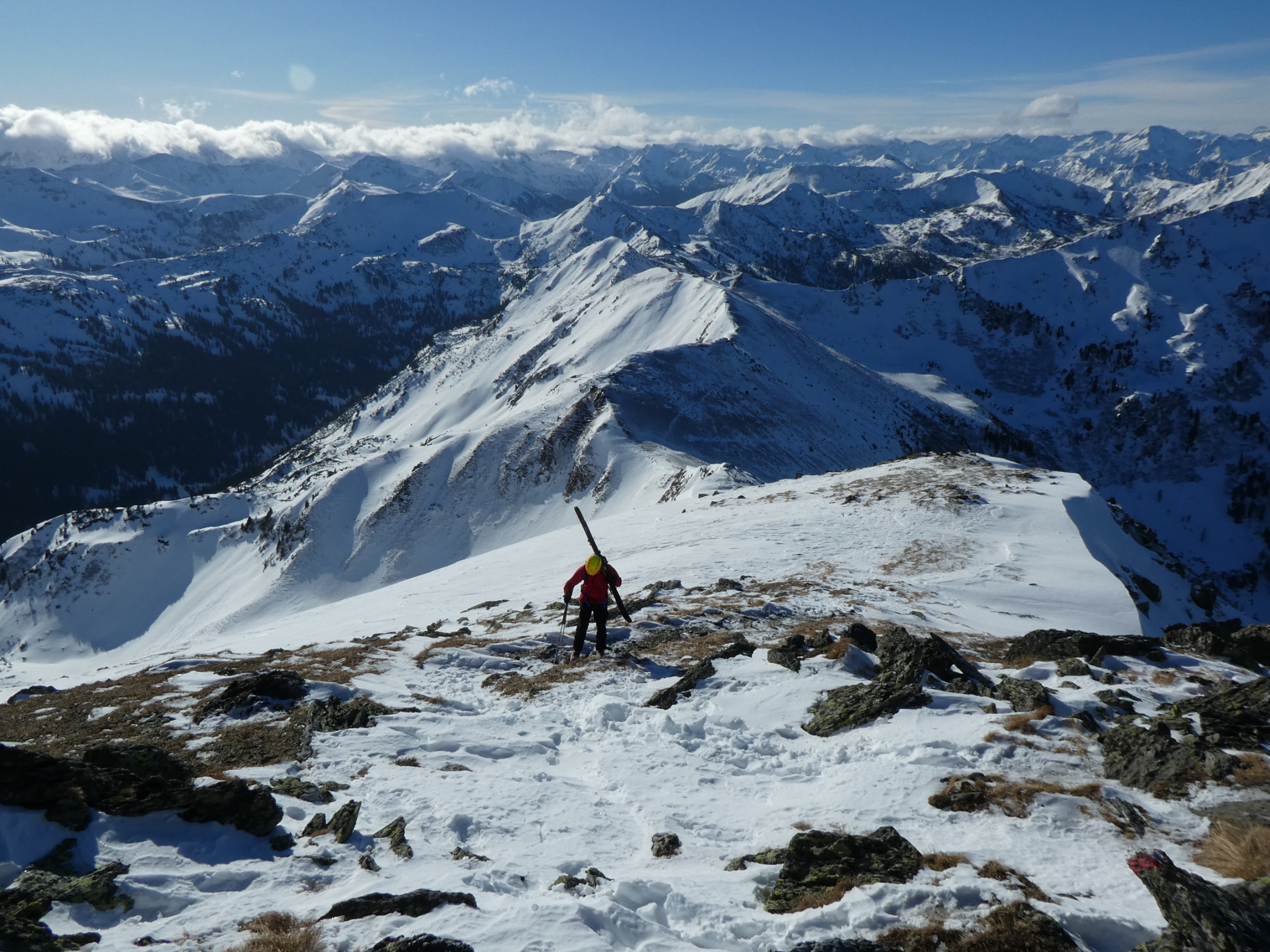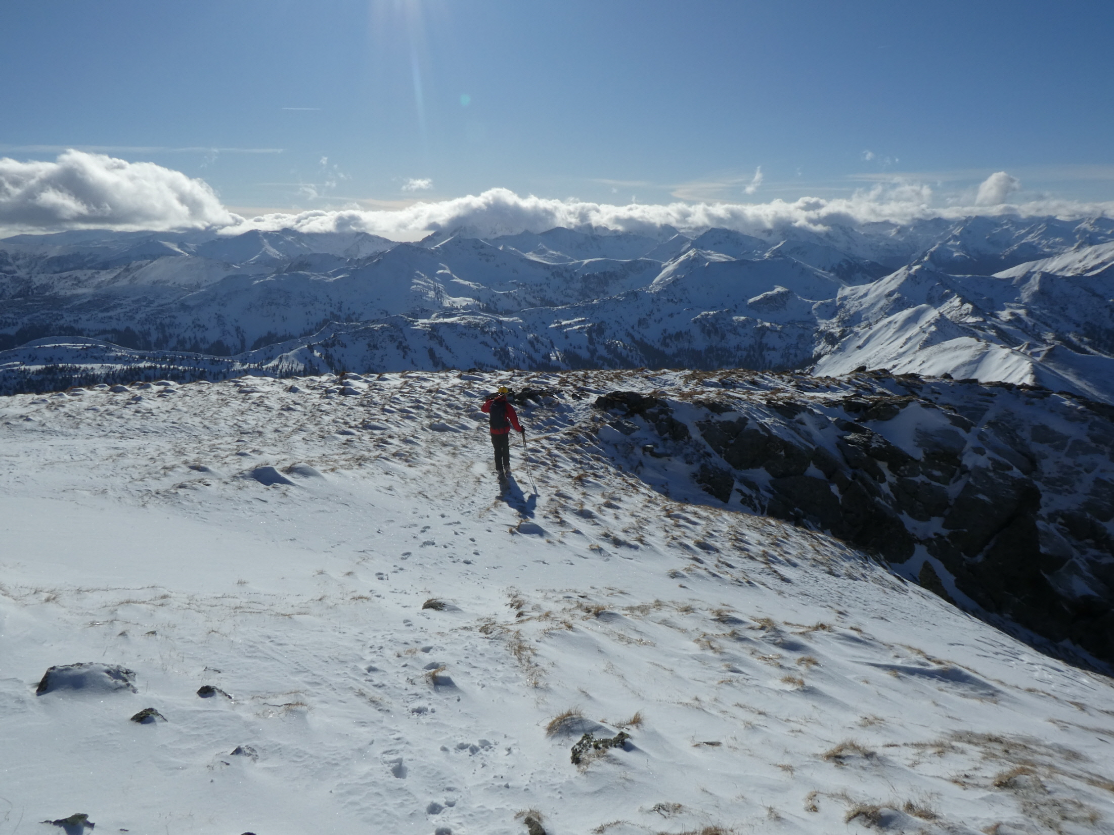 Über den etwas abgeblasenen Gipfelaufbau sind wir schließlich bis zum großen Kreuz auf diesem fantastischen Aussichtsberg angestiegen. Weil auch hier oben die frische Brise aus dem Süden, die zu unserem Glück die Feuchtigkeit bereits an den etwas südlicher gelegenen Gipfeln angestaut hatte, geweht hat, haben wir uns trotz ungetrübtem Sonnenschein recht bald für die Abfahrt bereit gemacht.