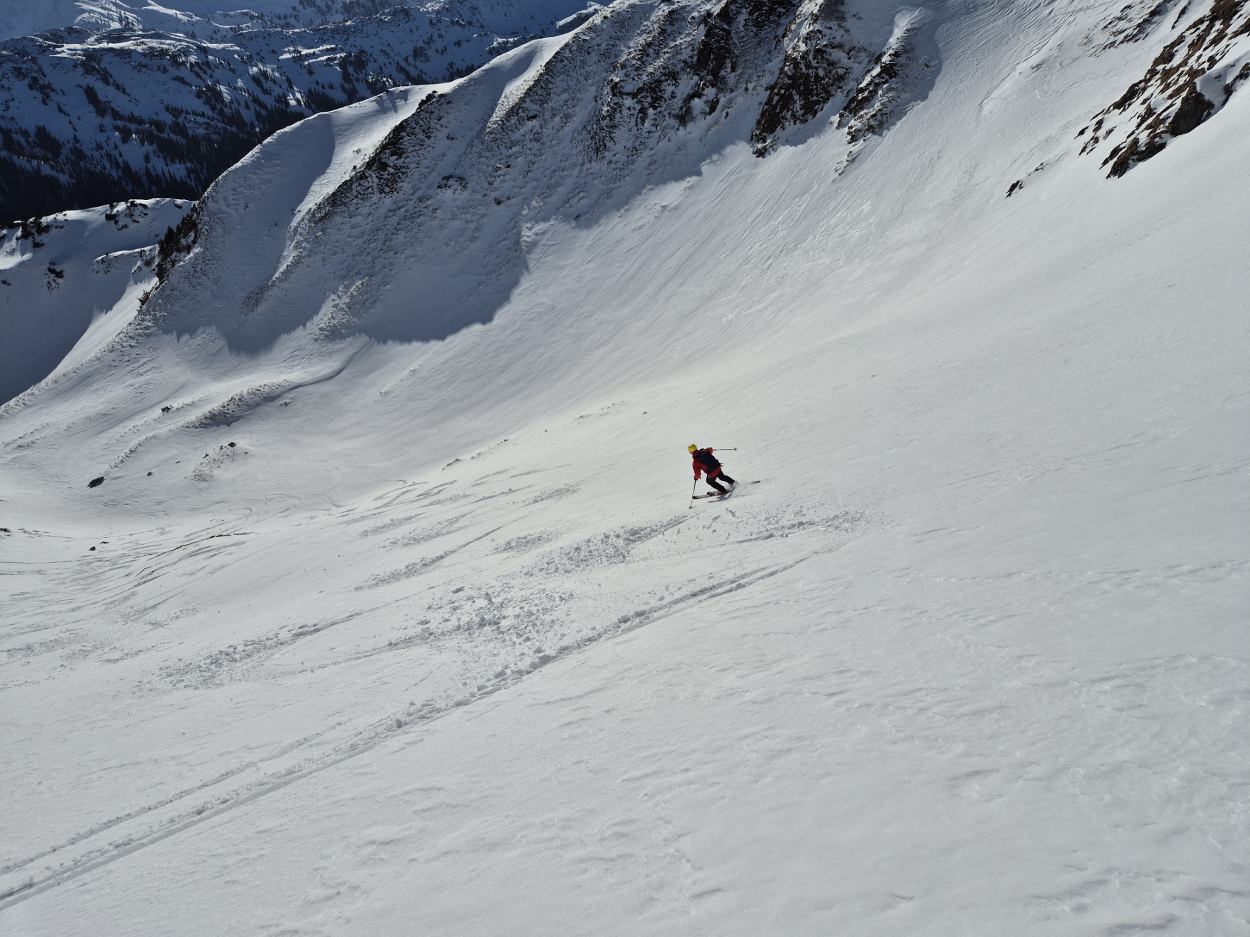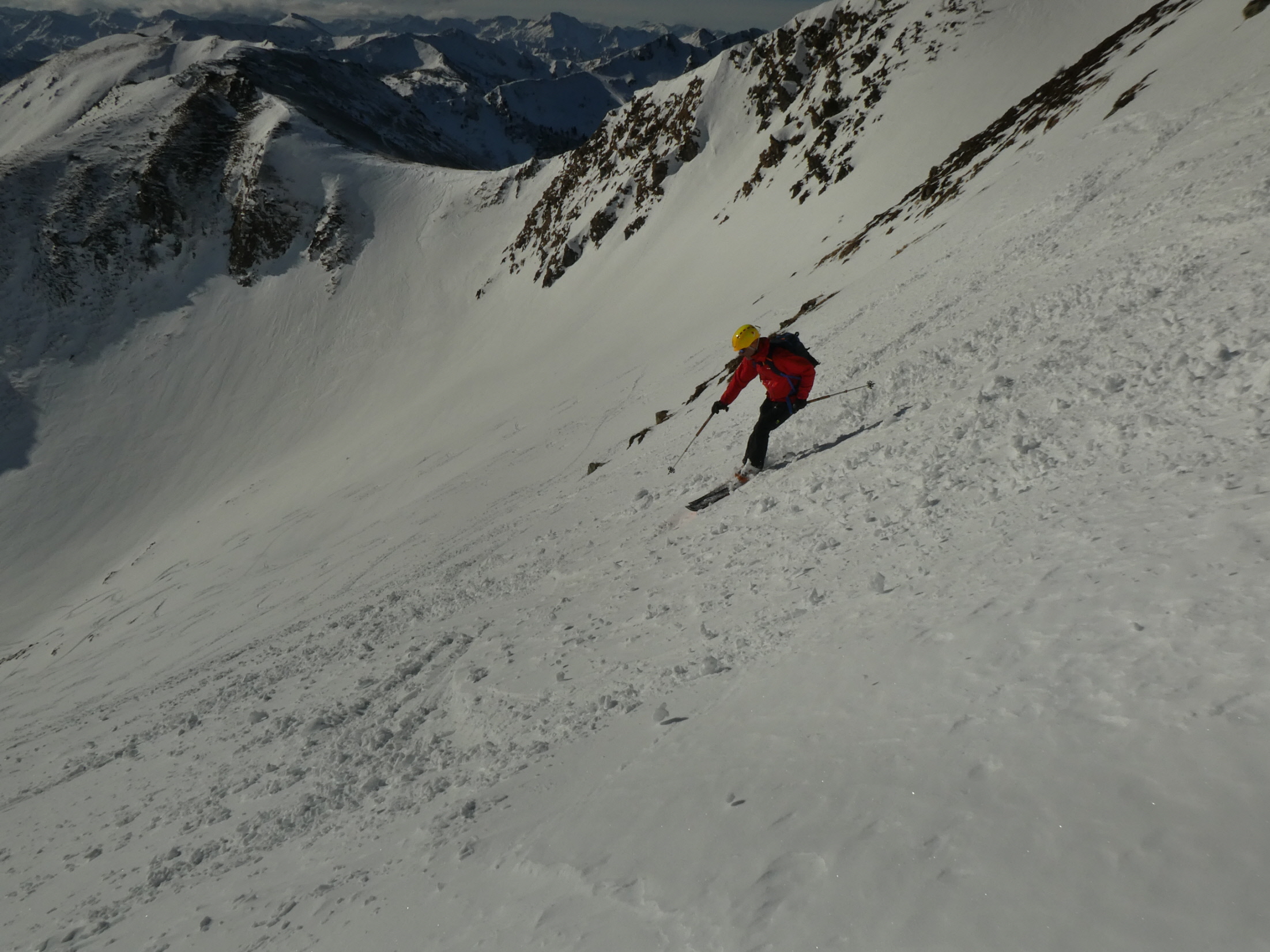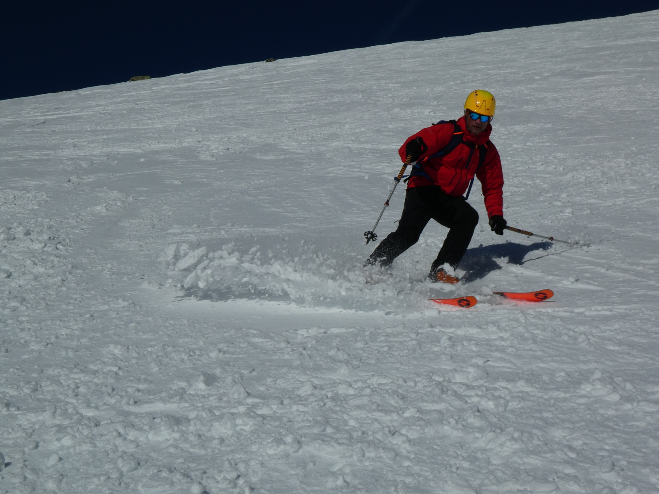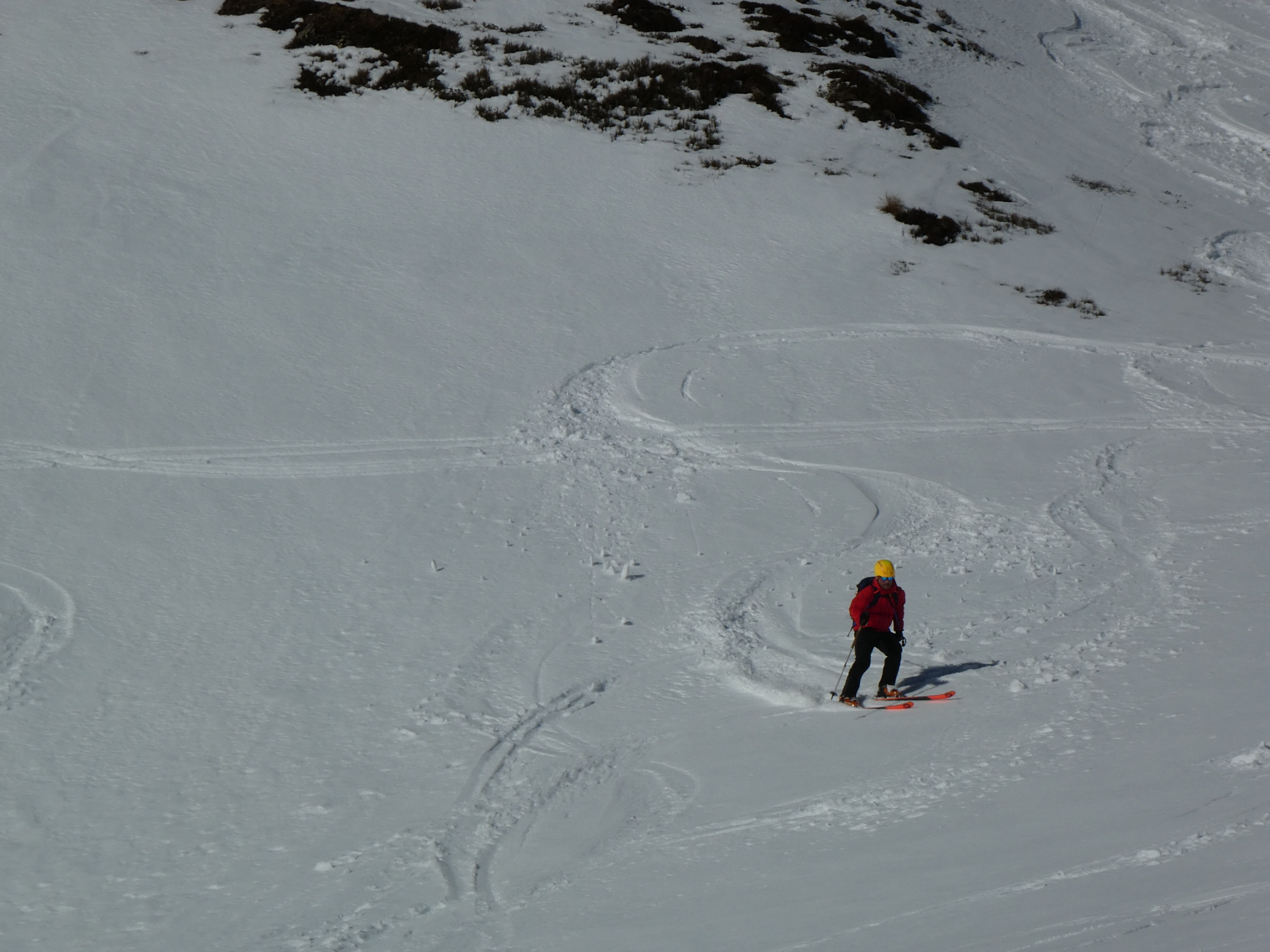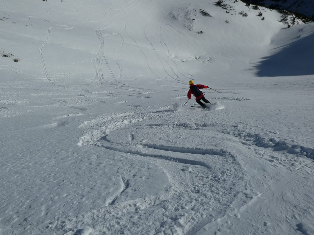 Vom ersten Meter an war der Schnee bestens fahrbar und auch die Skiwahl im Vorfeld der Tour hat sich als perfekt herausgestellt. Über die folgenden 500 Höhenmeter gibt es außer viel Jubel beim Spiel mit den Hangexpositionen nicht viel zu sagen. Einfach ein Genuss! Jede Geländestufe war ein Abfahrtserlebnis für sich.