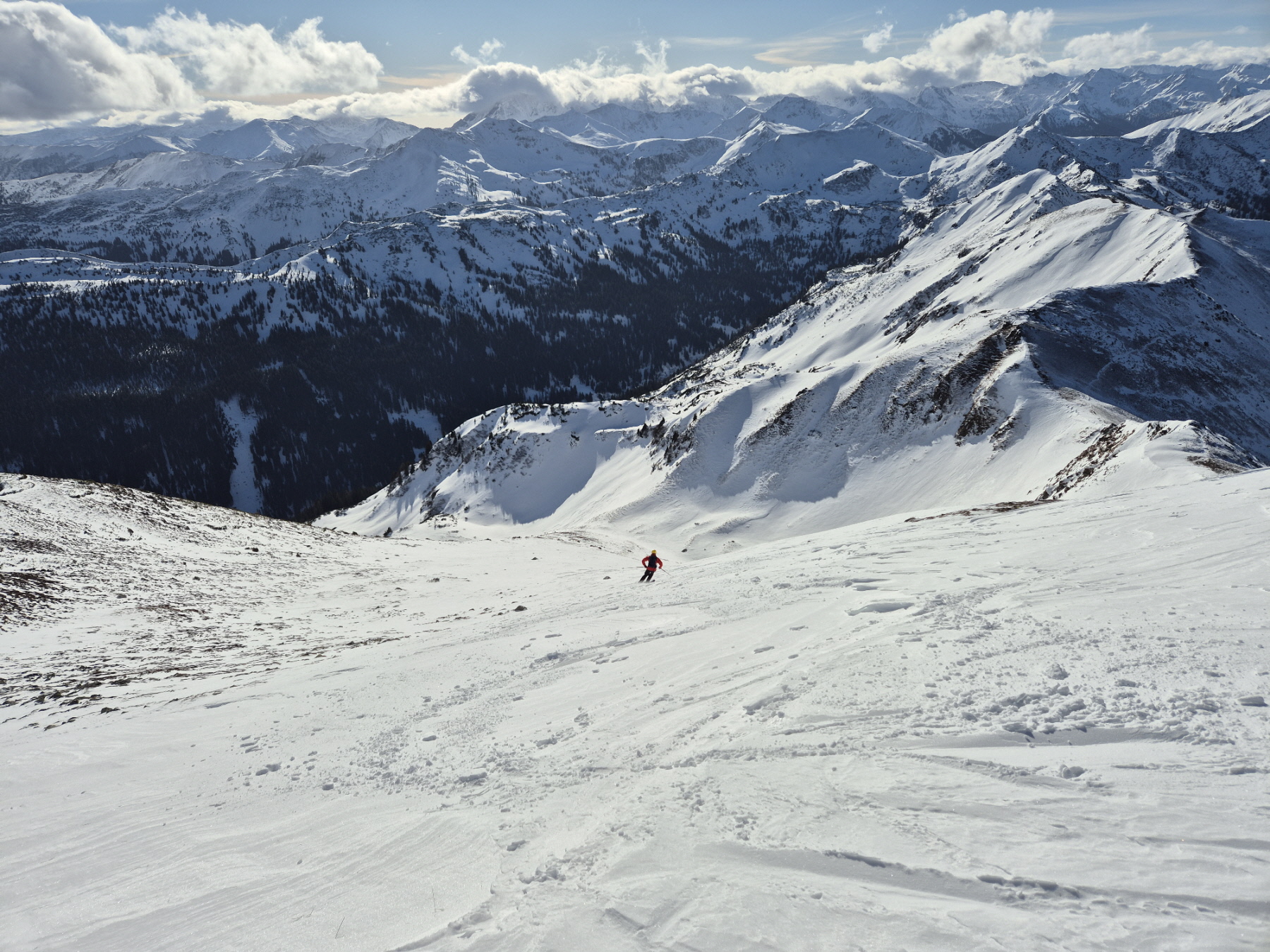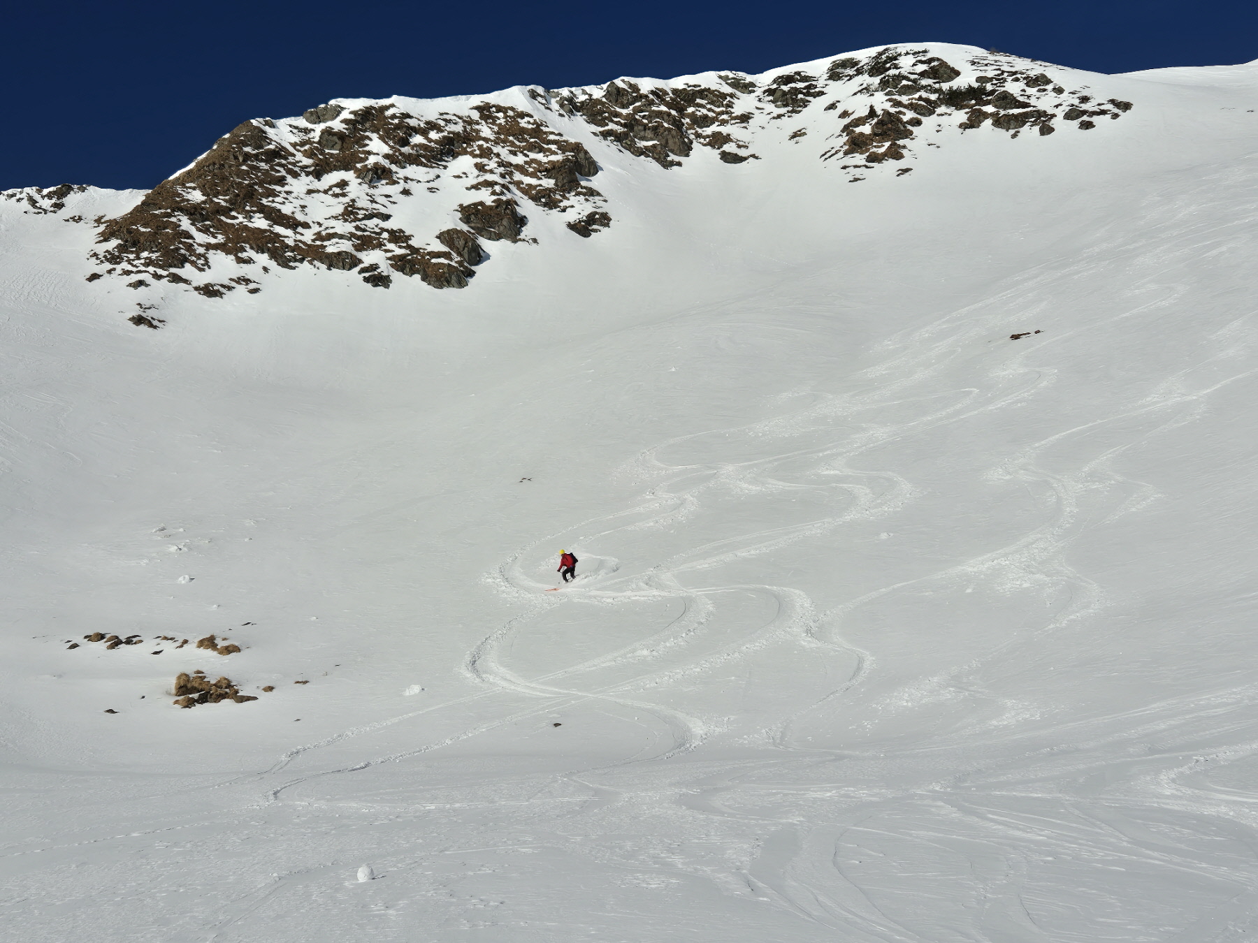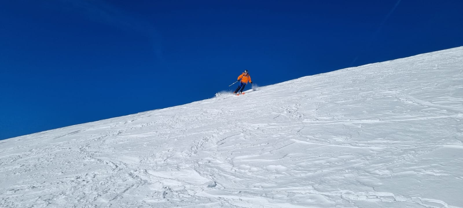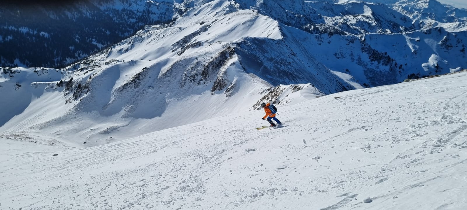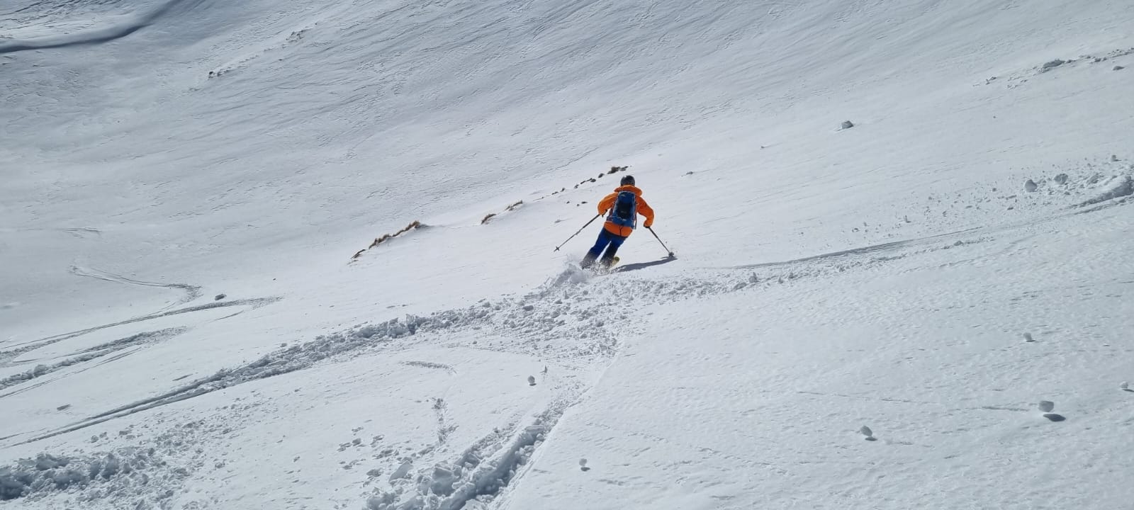 Vom ersten Meter an war der Schnee bestens fahrbar und auch die Skiwahl im Vorfeld der Tour hat sich als perfekt herausgestellt. Über die folgenden 500 Höhenmeter gibt es außer viel Jubel beim Spiel mit den Hangexpositionen nicht viel zu sagen. Einfach ein Genuss! Jede Geländestufe war ein Abfahrtserlebnis für sich.
