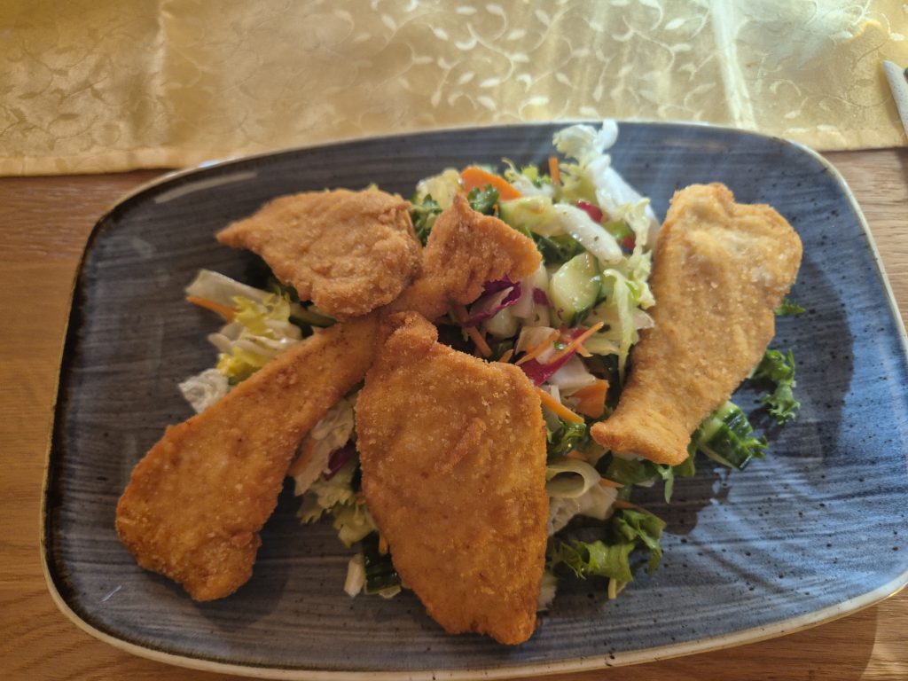 Für die diesbezügliche Vorinformation sage ich an dieser Stelle noch einmal „Danke!“ an die Familie Grobbauer/Beichler, der an dieser Stelle noch ein weiterer Dank dafür gebührt, dass wir trotz Ruhetags auch noch in ihrem Haus kulinarisch versorgt wurden. Auch das hatten sie uns schon im Vorfeld der Tour versprochen, weil ihr Haus ohnedies mit Übernachtungsgästen belegt war. Dem Heinrich sei noch verraten, dass ich mich abermals für den Backhendlsalat entschieden habe und Andreas diesmal das Gulasch mit Knödel und Spiegelei zum Auffüllen der Energiespeicher gewählt hat.
