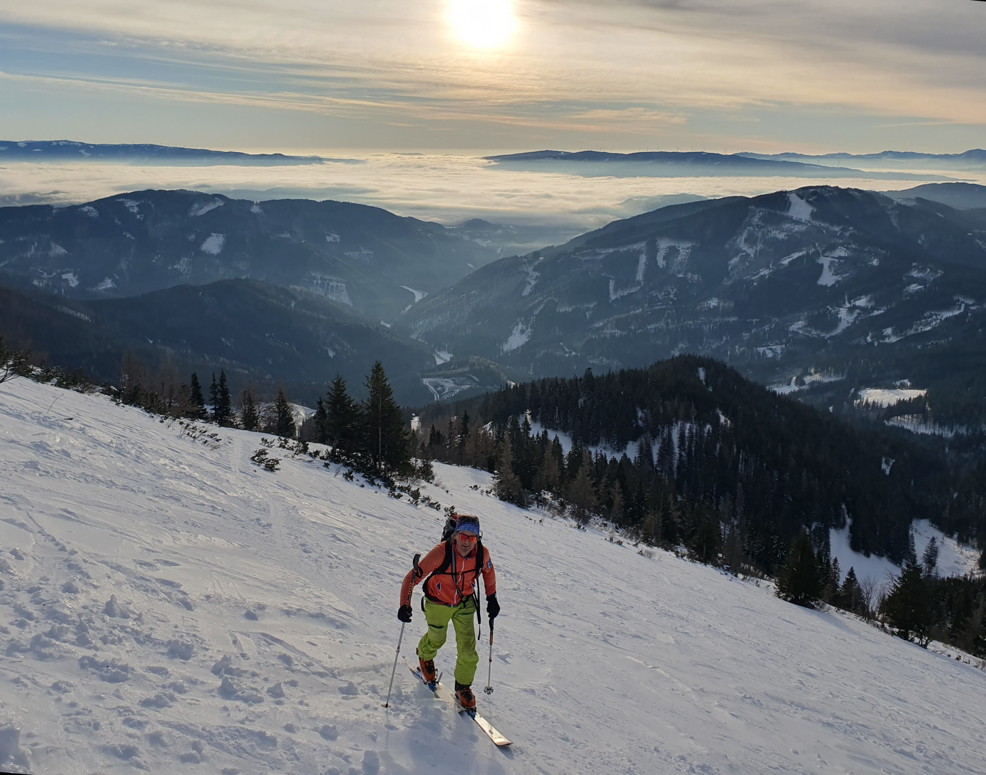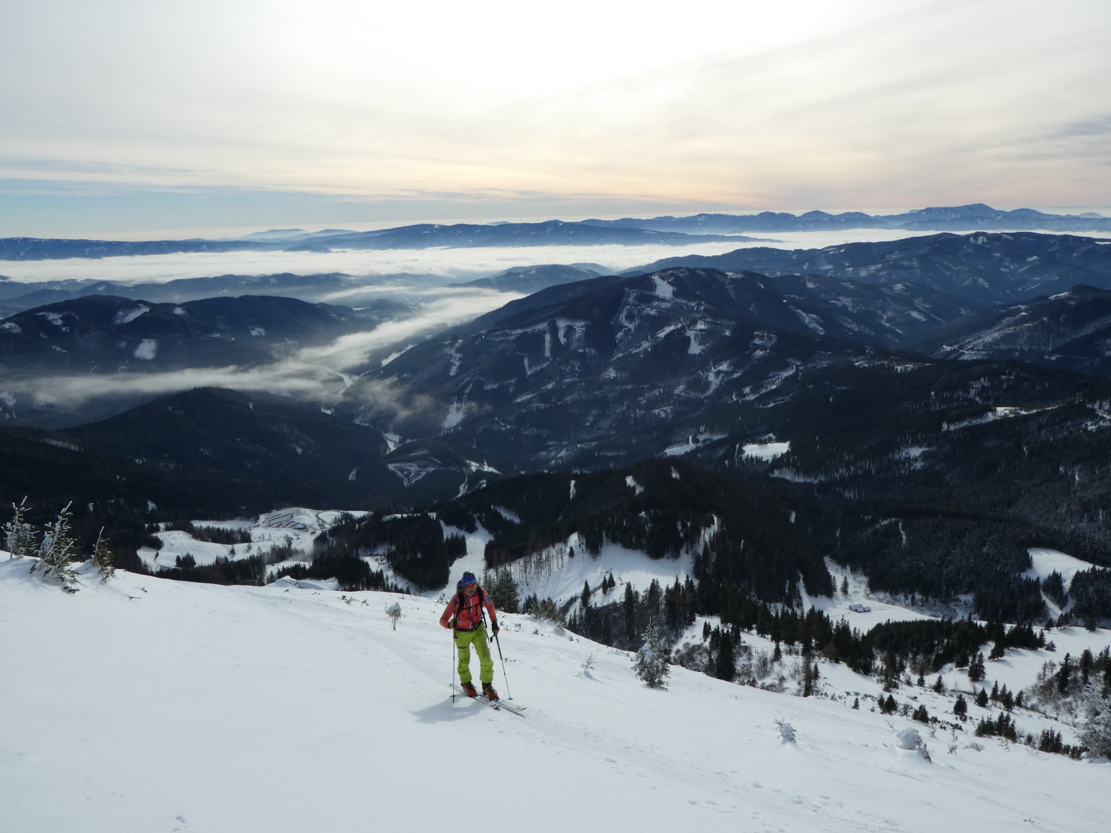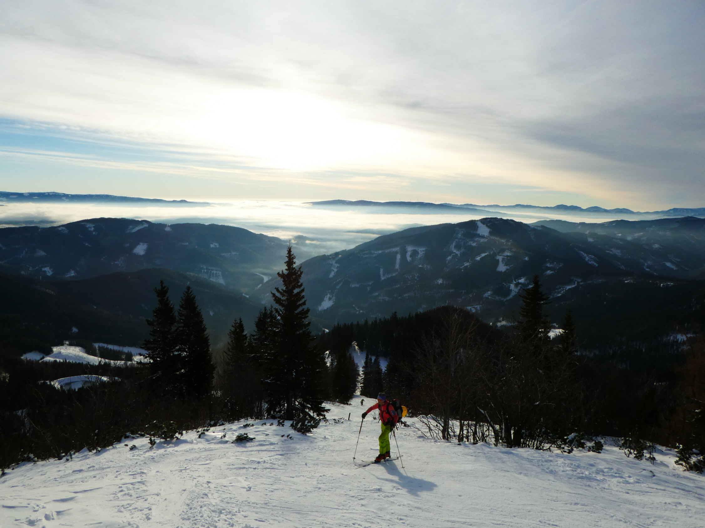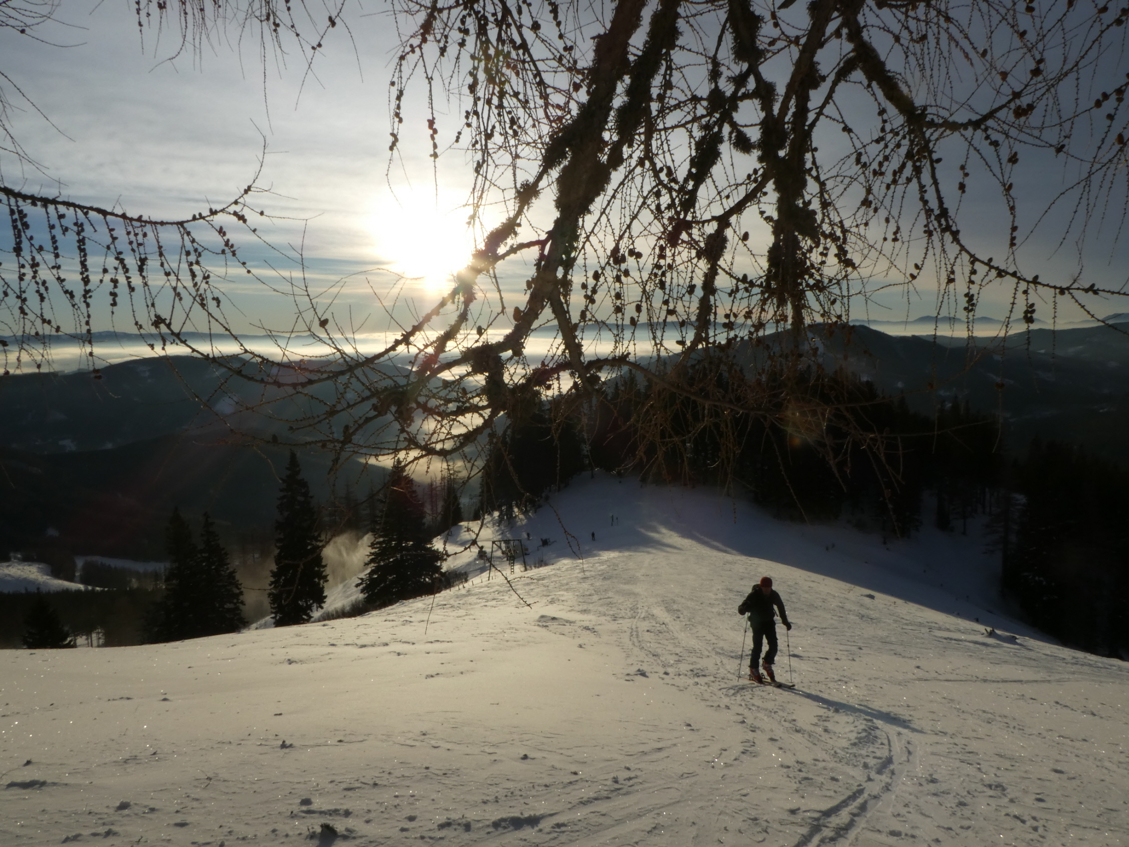 Den Marienfeiertag versuche ich schon seit Jahrzehnten weitab von Einkaufstempeln in der freien Natur zu verbringen. Wenn dann auch noch das Wetter mitspielt, so ist einer grandiosen Skitour der Weg bereitet. Vom Scheikl auf der Brunnalm sind wir bei minus 9 Grad entlang der ausgeschilderten Aufstiegsroute zum Sonnkogel angestiegen. Die Morgensonne im Rücken hat in Verbindung mit dem Hochnebel über dem Mürztal schon hier unten für eine ganz besondere Stimmung gesorgt.