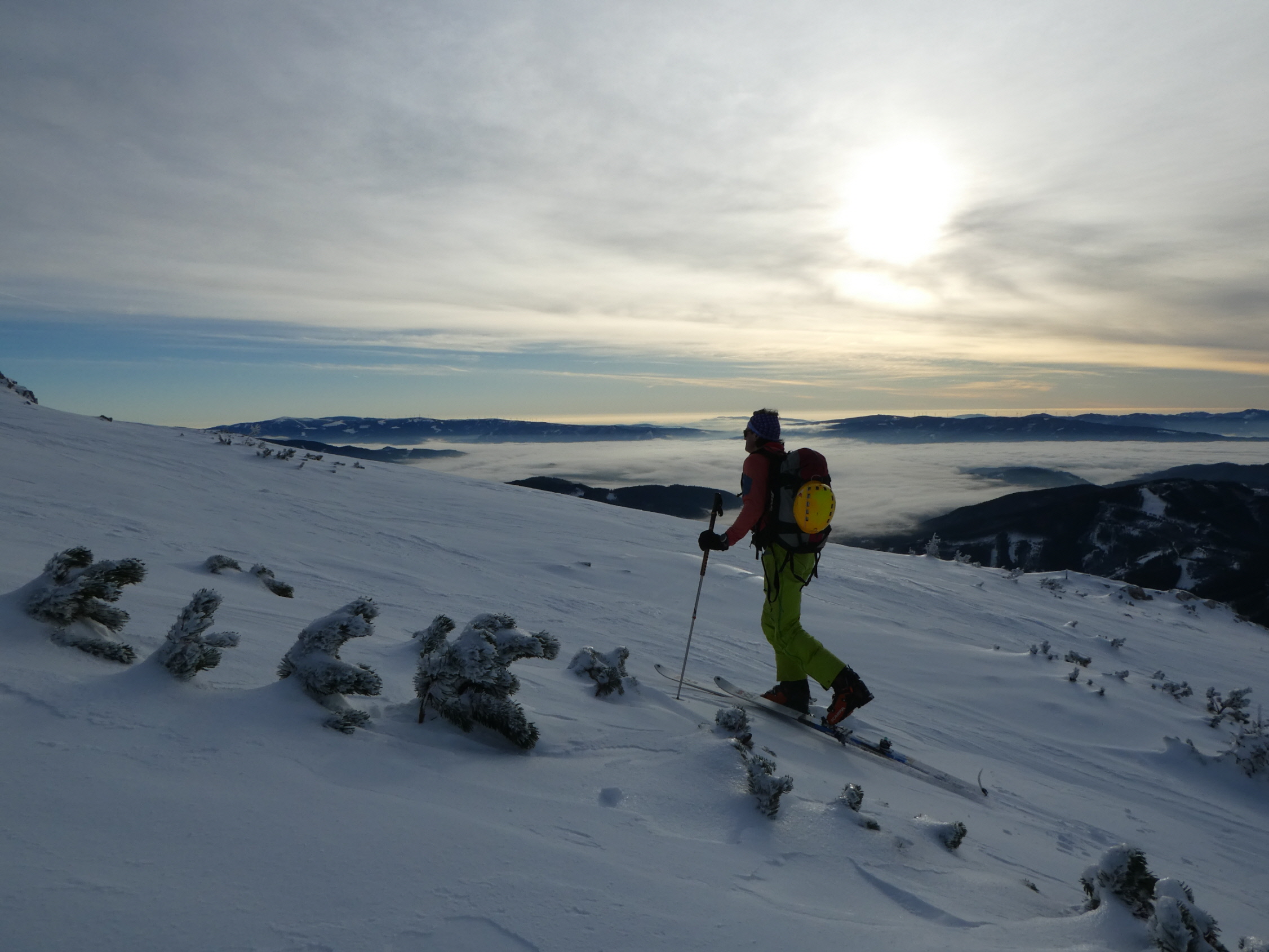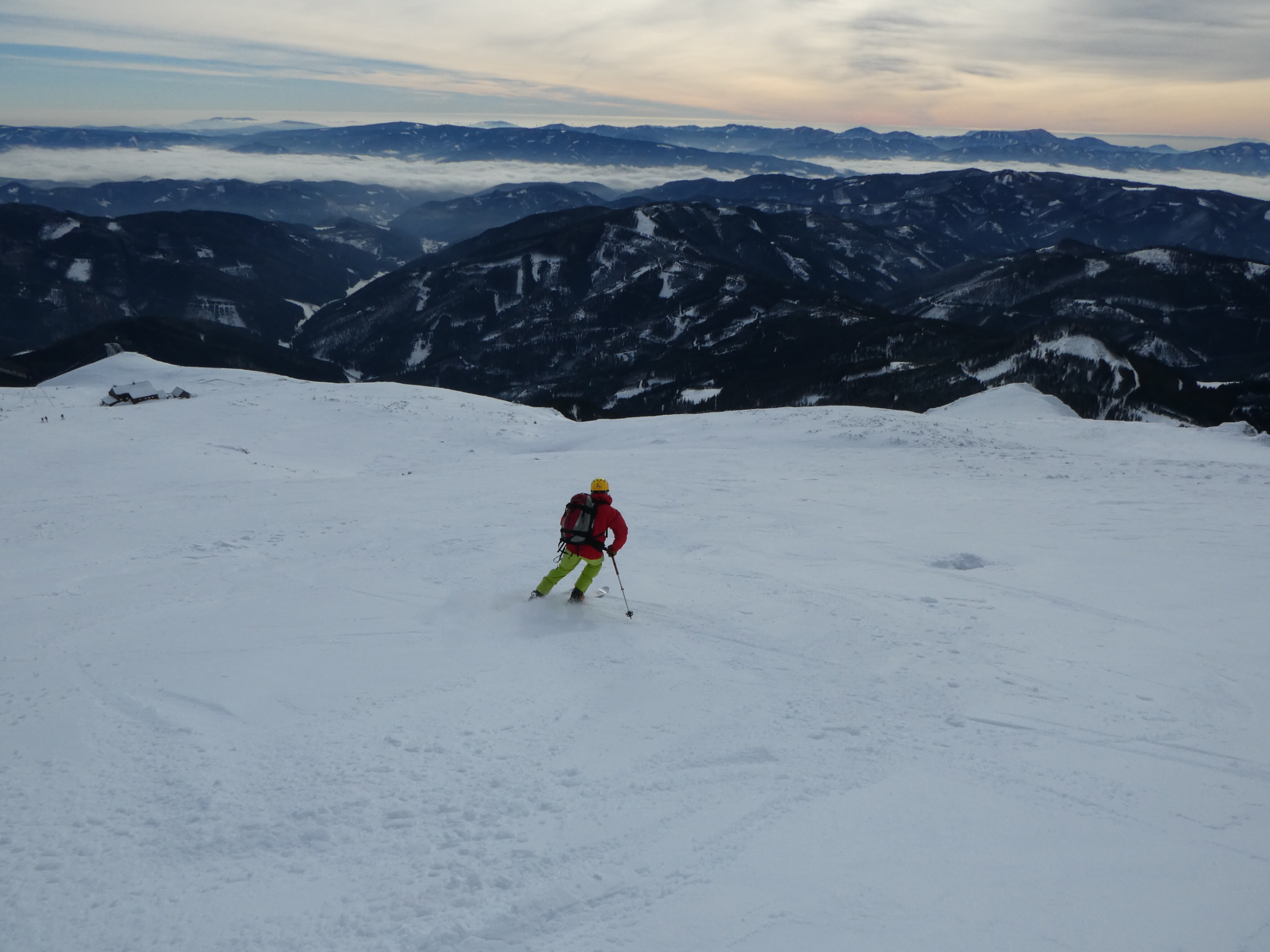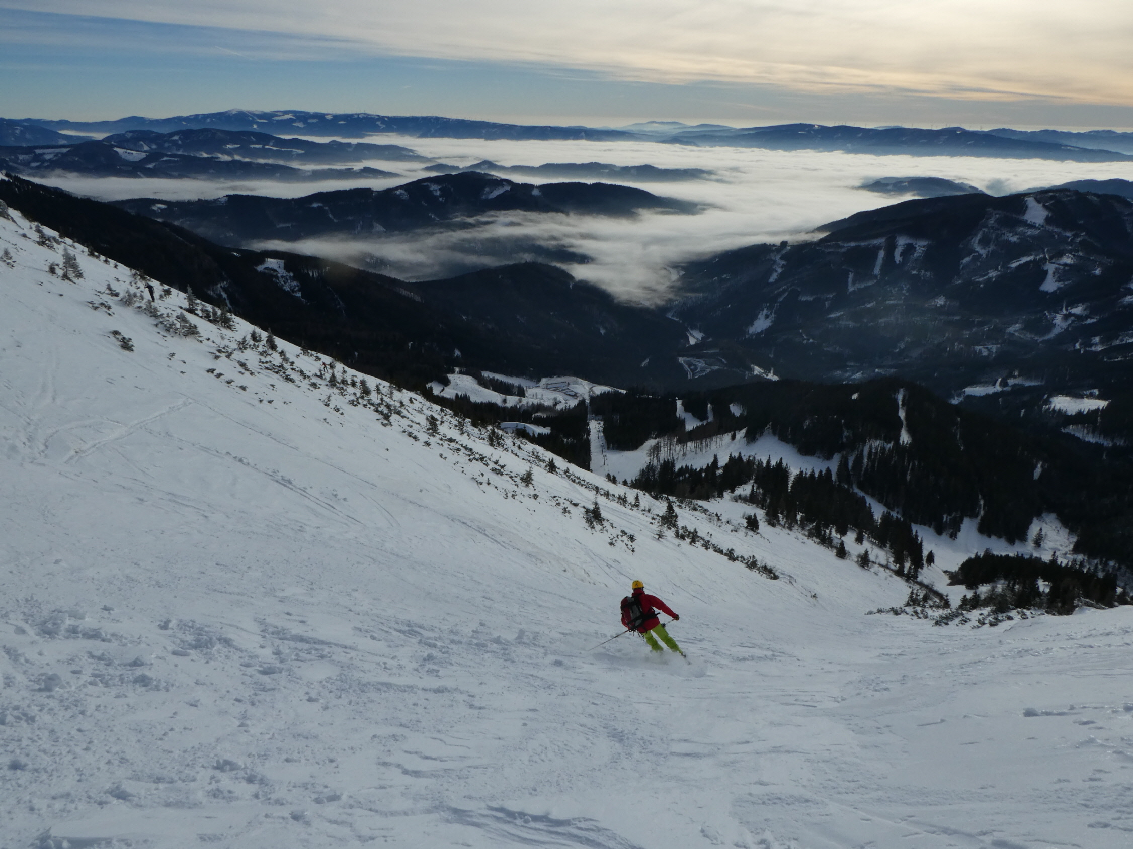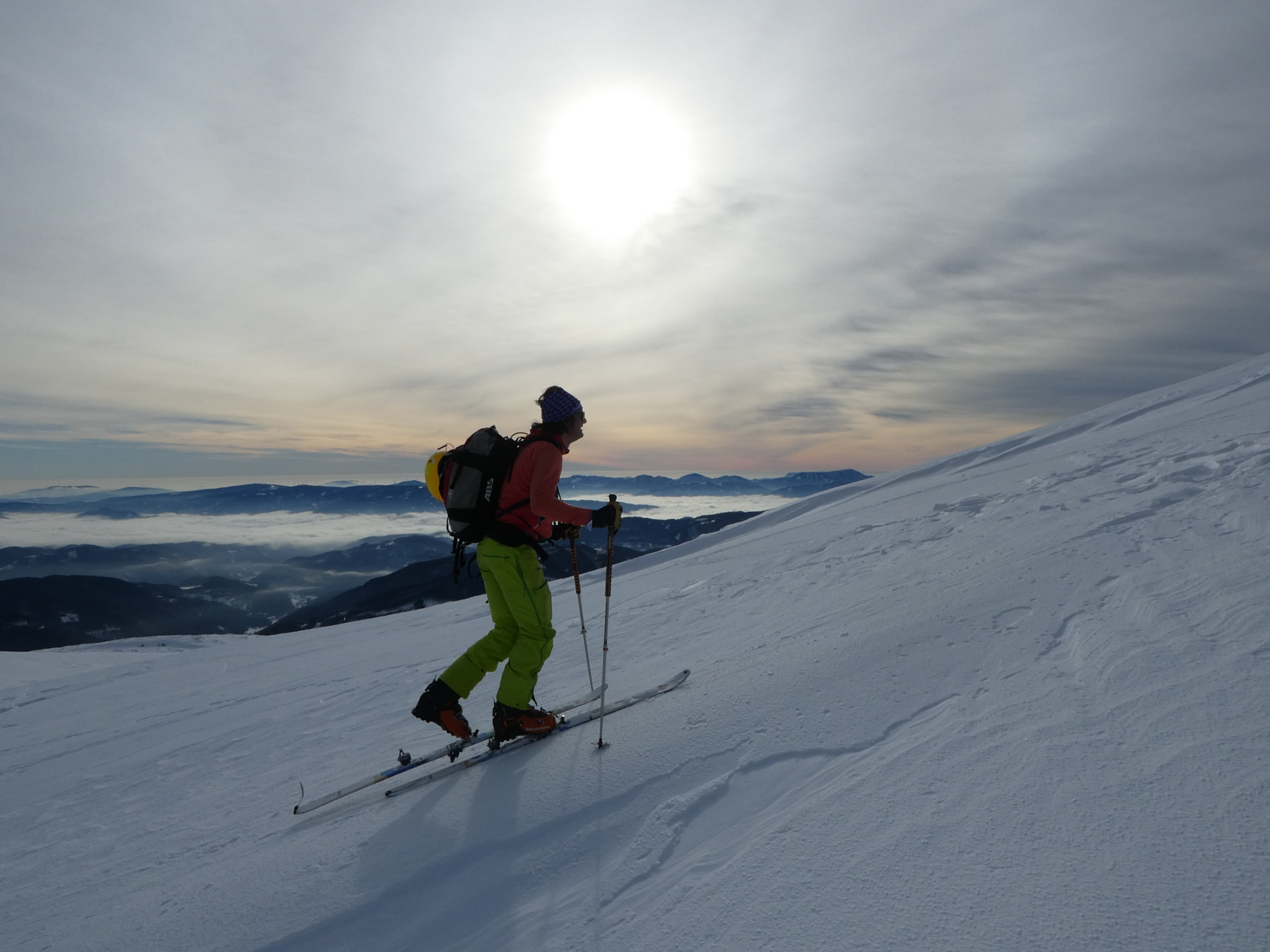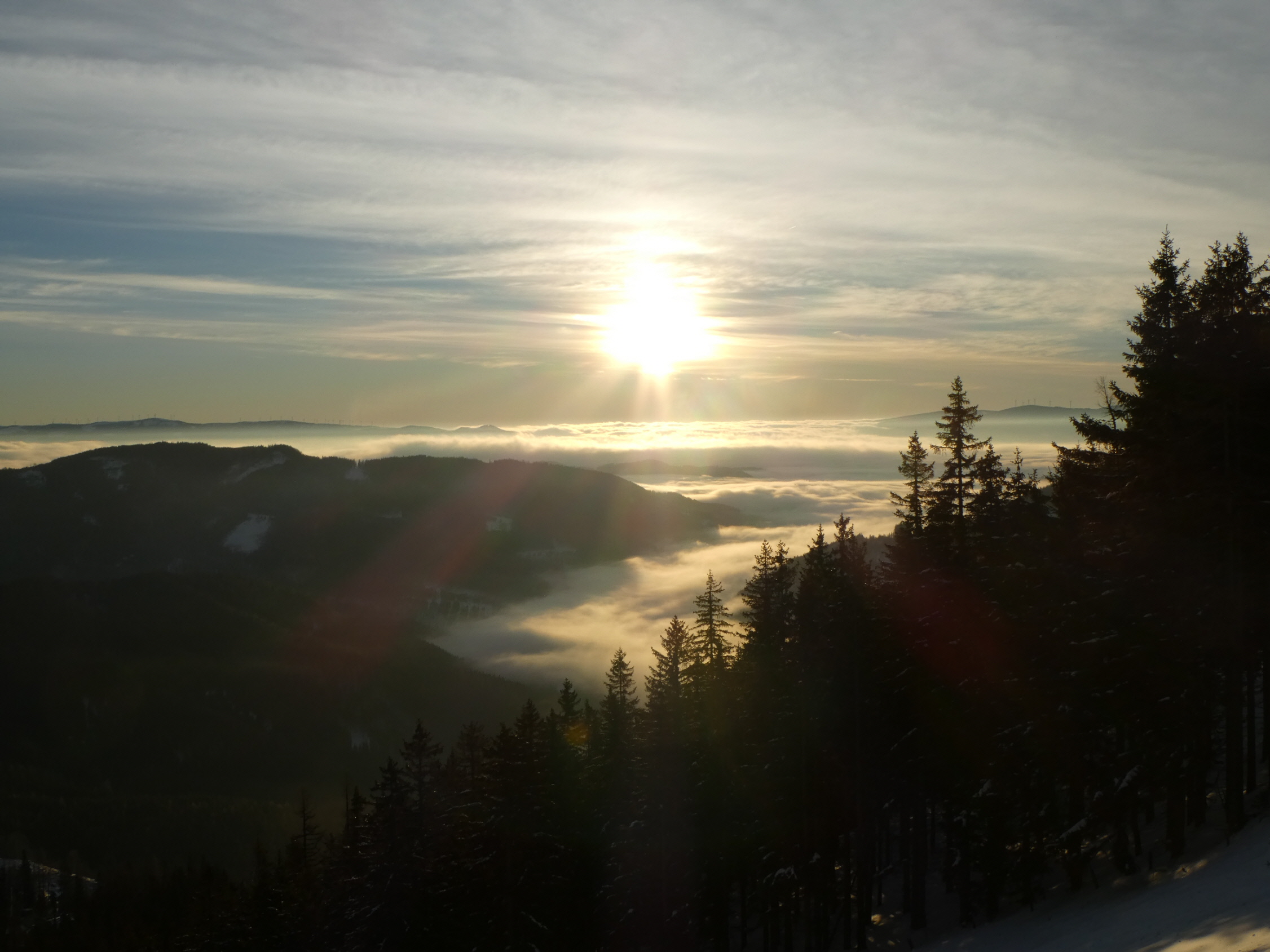 Den Marienfeiertag versuche ich schon seit Jahrzehnten weitab von Einkaufstempeln in der freien Natur zu verbringen. Wenn dann auch noch das Wetter mitspielt, so ist einer grandiosen Skitour der Weg bereitet. Vom Scheikl auf der Brunnalm sind wir bei minus 9 Grad entlang der ausgeschilderten Aufstiegsroute zum Sonnkogel angestiegen. Die Morgensonne im Rücken hat in Verbindung mit dem Hochnebel über dem Mürztal schon hier unten für eine ganz besondere Stimmung gesorgt.