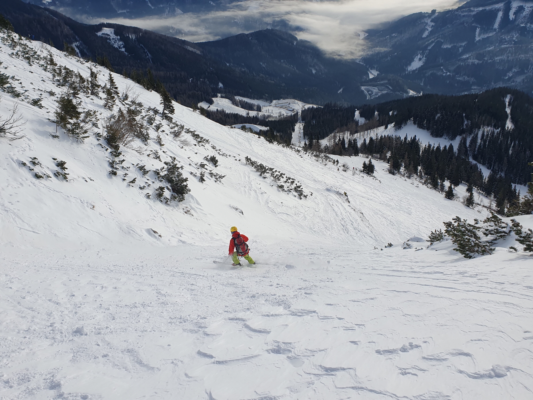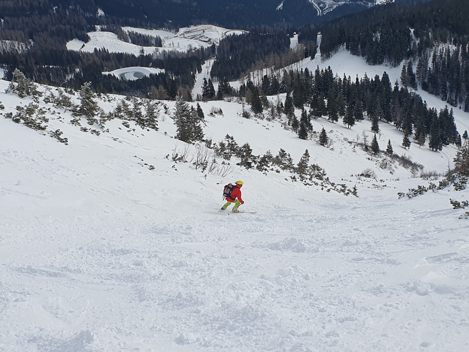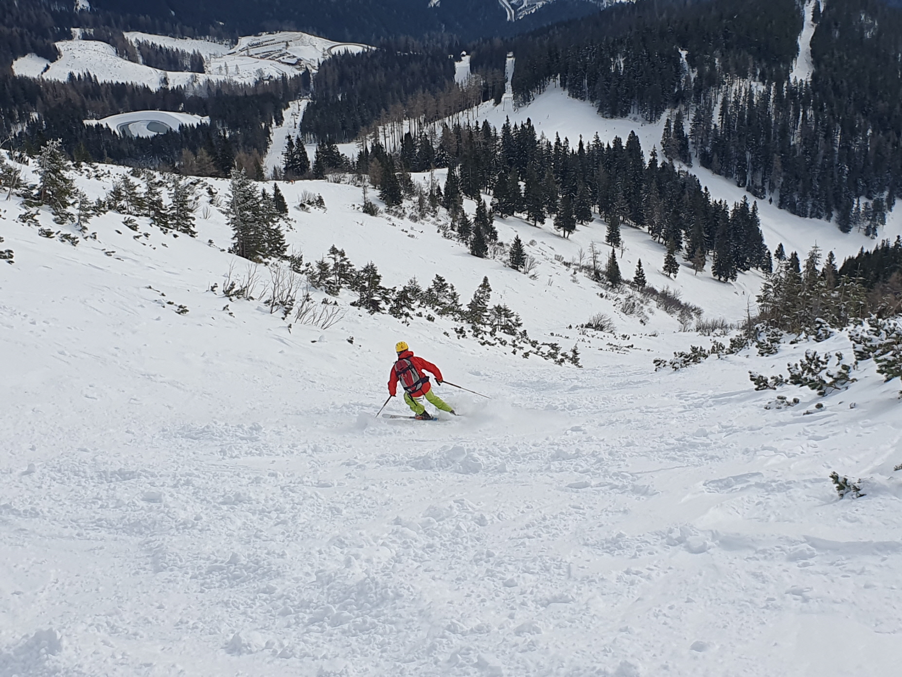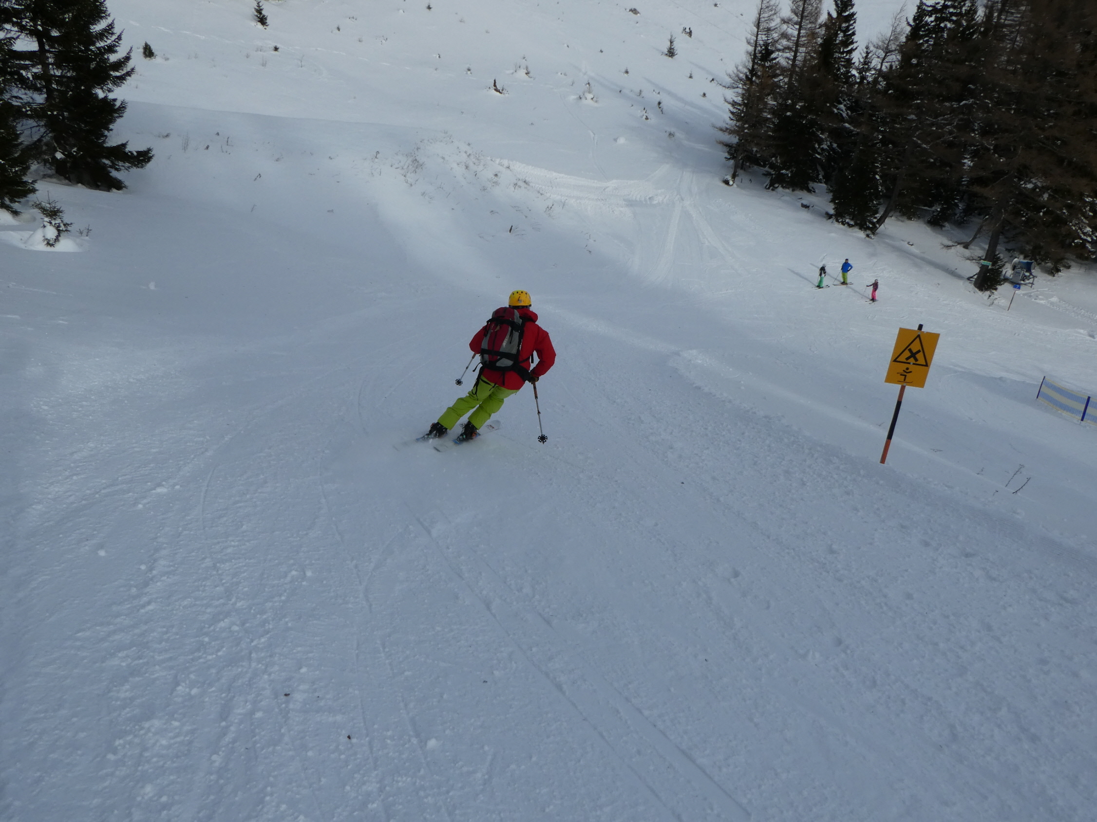 Auch die weitere Rinne hinunter in Richtung Schalleralm hat sehr guten Schnee als fahrbare Unterlage für uns bereitgehalten. Zum Schluss sind wir auf den Sonnkogel hinaus gequert und haben die Tour mit flotten Carvingschwüngen entlang der bestens präparierten Piste am Ausgangspunkt beendet.