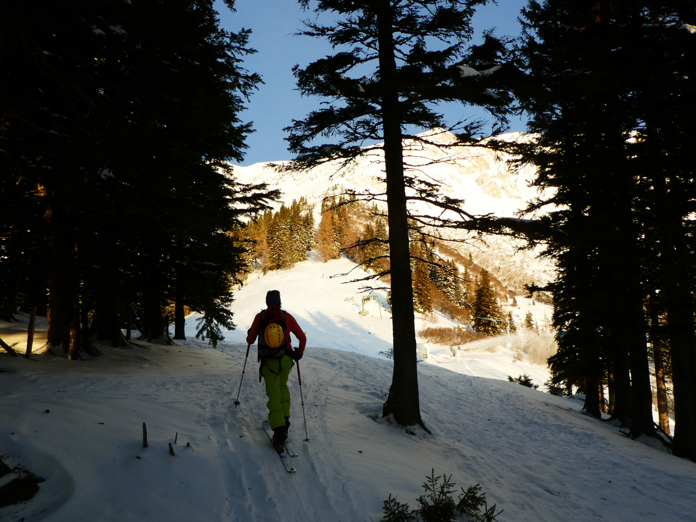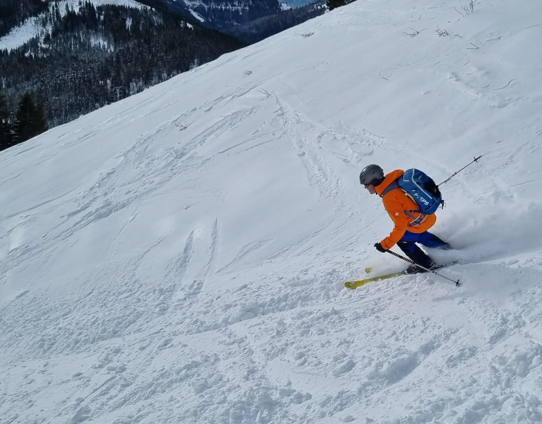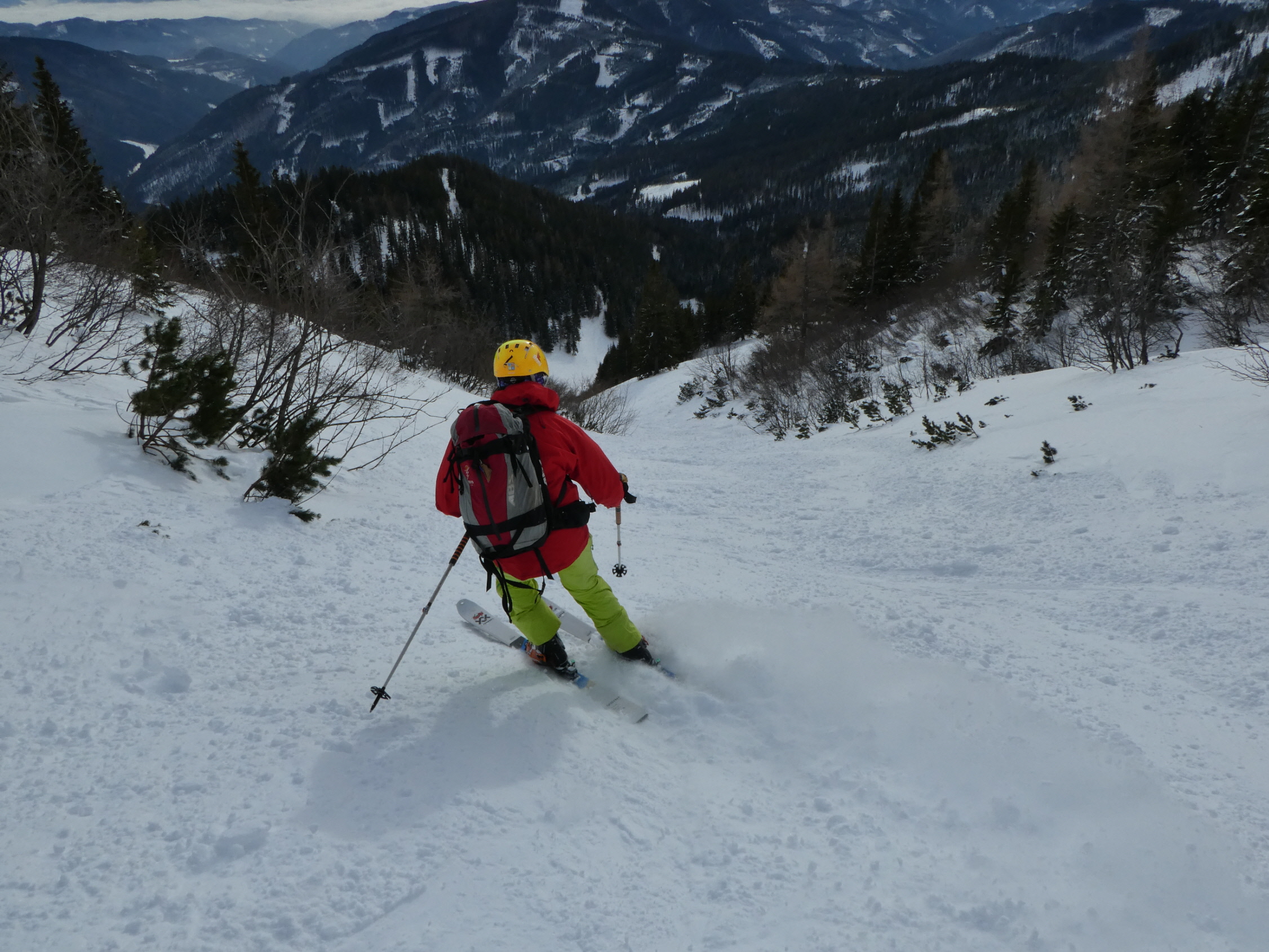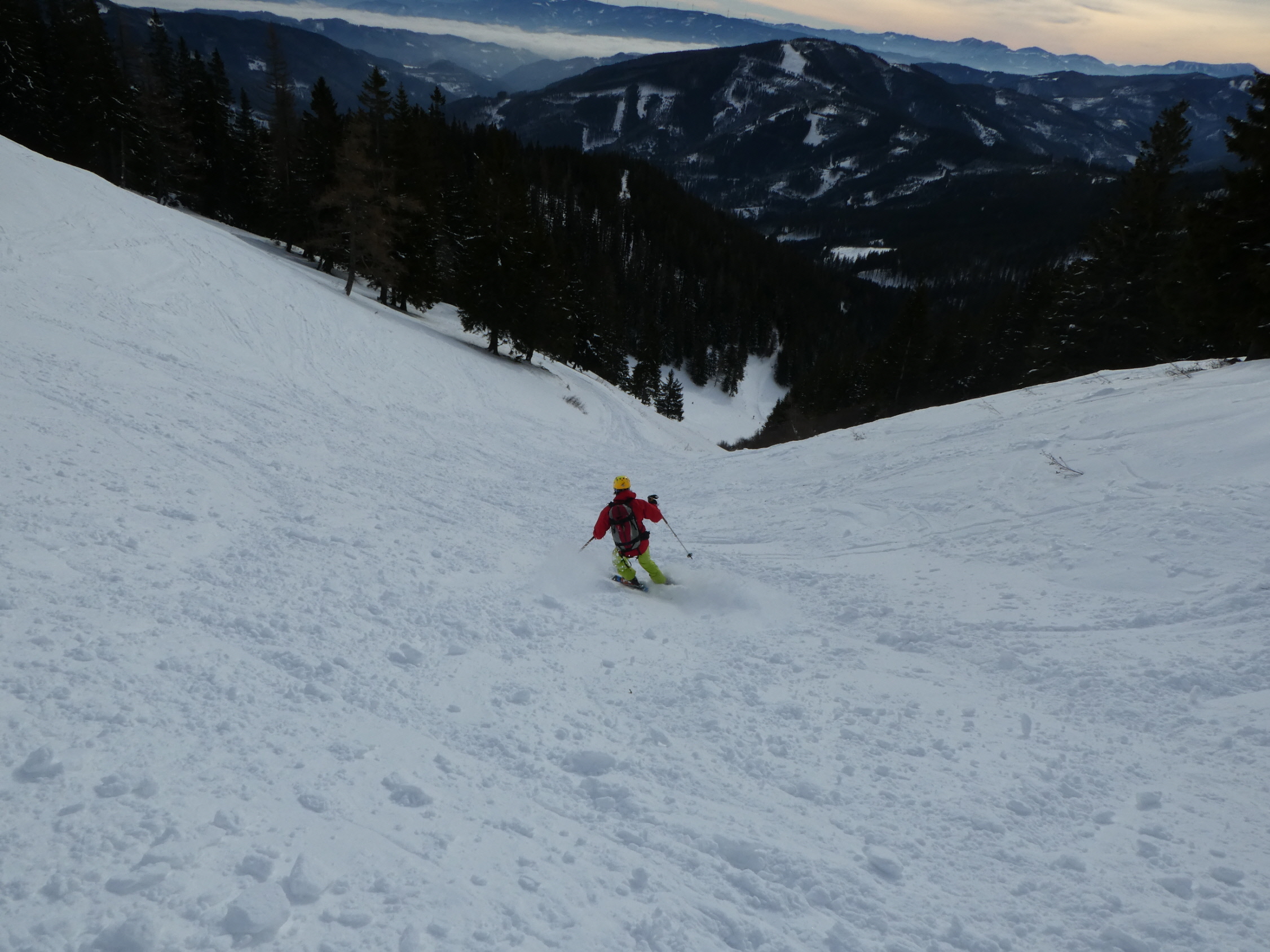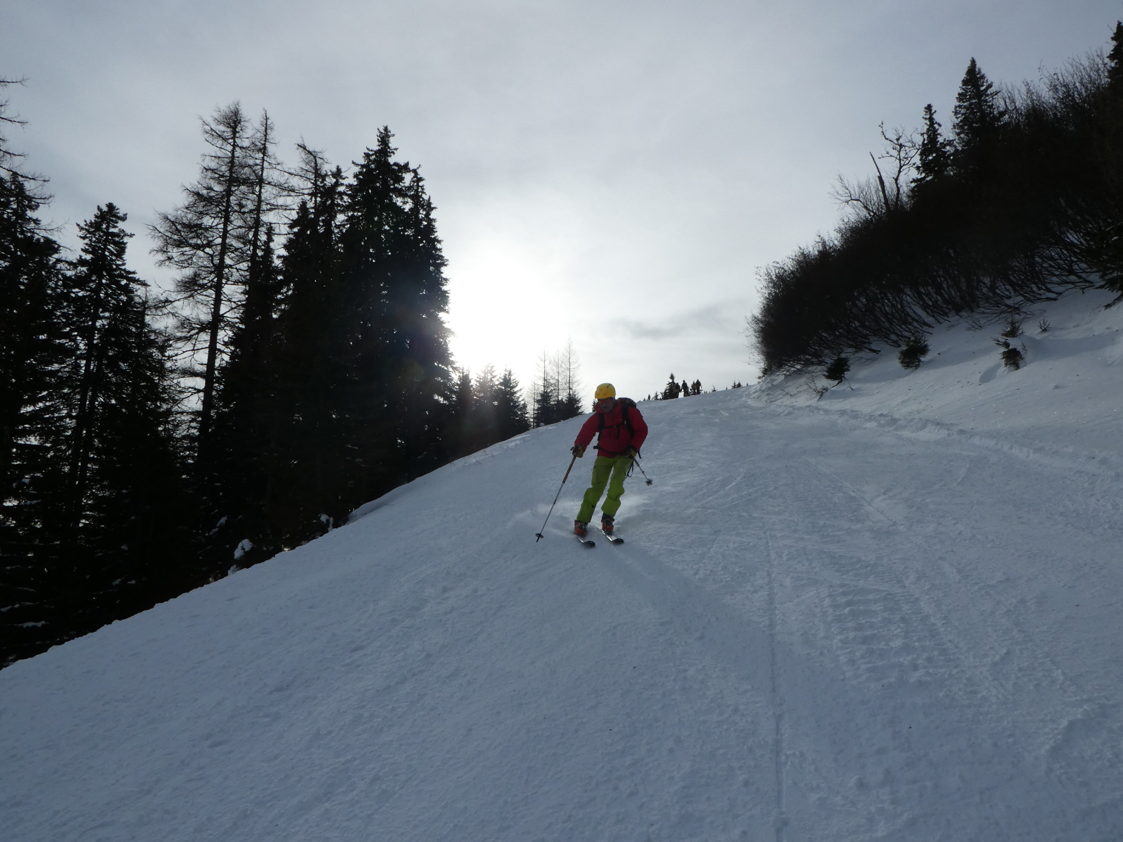 Auch die weitere Rinne hinunter in Richtung Schalleralm hat sehr guten Schnee als fahrbare Unterlage für uns bereitgehalten. Zum Schluss sind wir auf den Sonnkogel hinaus gequert und haben die Tour mit flotten Carvingschwüngen entlang der bestens präparierten Piste am Ausgangspunkt beendet.