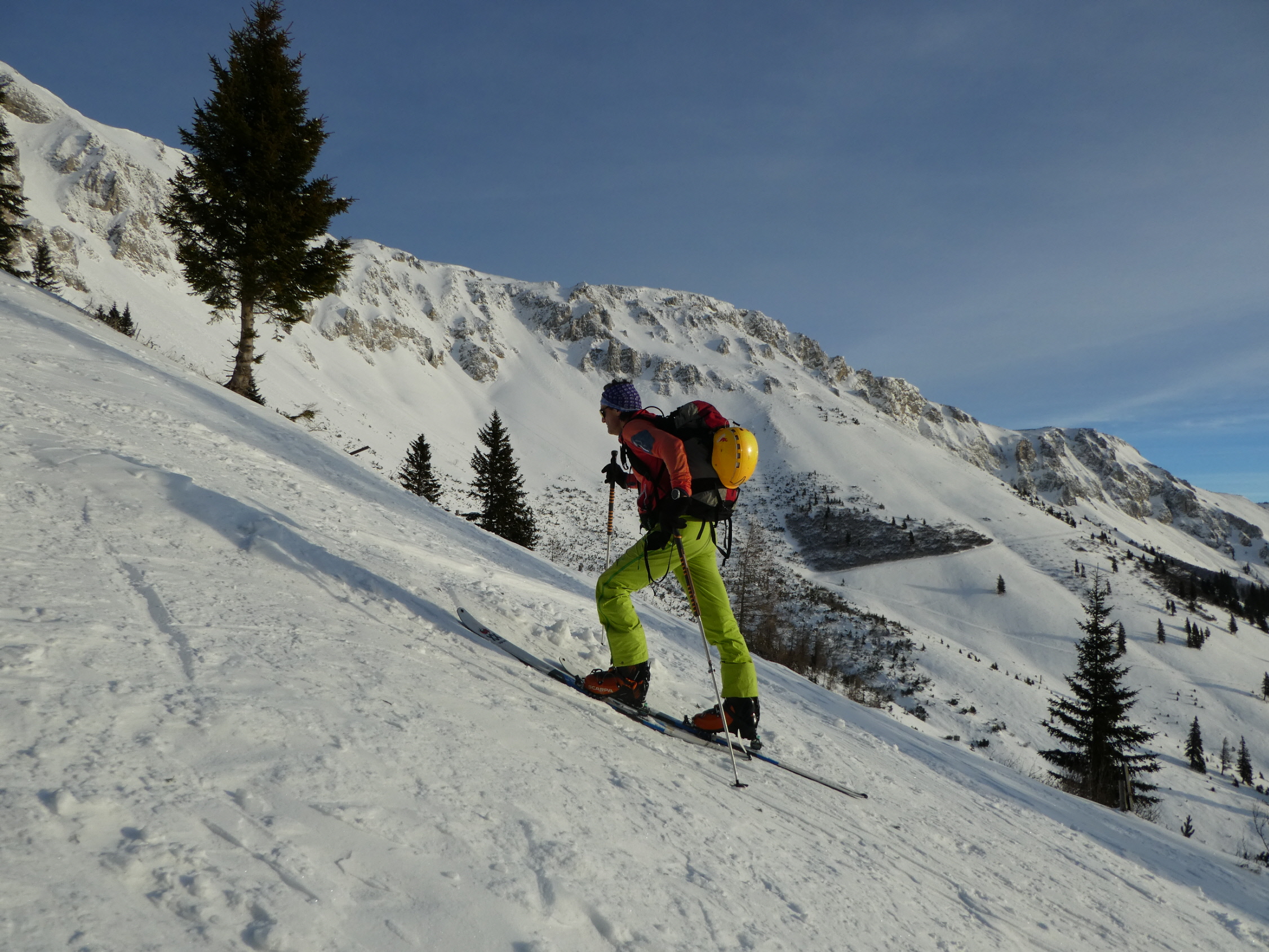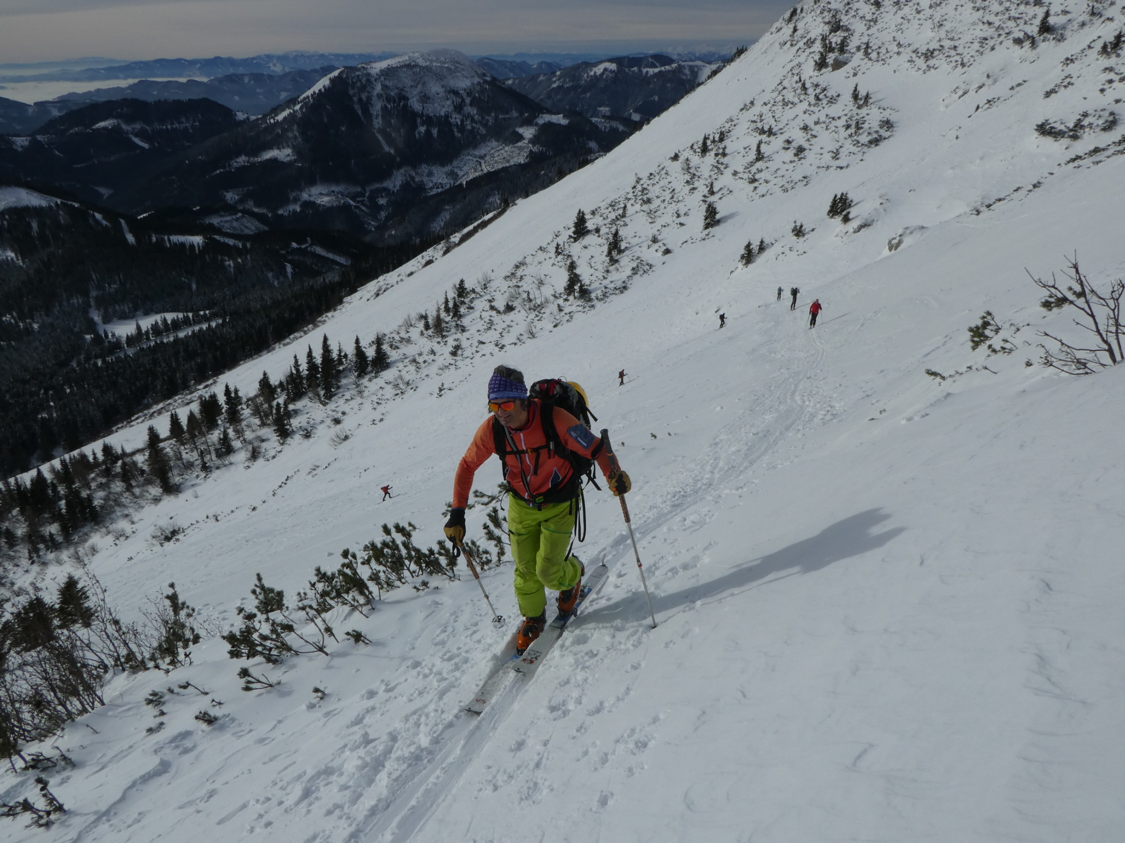 Knapp oberhalb von der Schlepplift Bergstation am Sonnkogel haben wir uns eine Trinkpause gegönnt, die Harscheisen montiert und sind weiter angestiegen. Dass dies eine sehr richtige Entscheidung war, hat sich gleich in einigen ziemlich glatten Passagen danach bestätigt. Flott haben wir an Höhe gewonnen. Zuletzt sind wir einmal kurz in die Schallerrinne hinein gequert um die Schneeverhältnisse darin auszuloten. Im Übergang zur Hochfläche war es da wieder ziemlich glatt und hart.