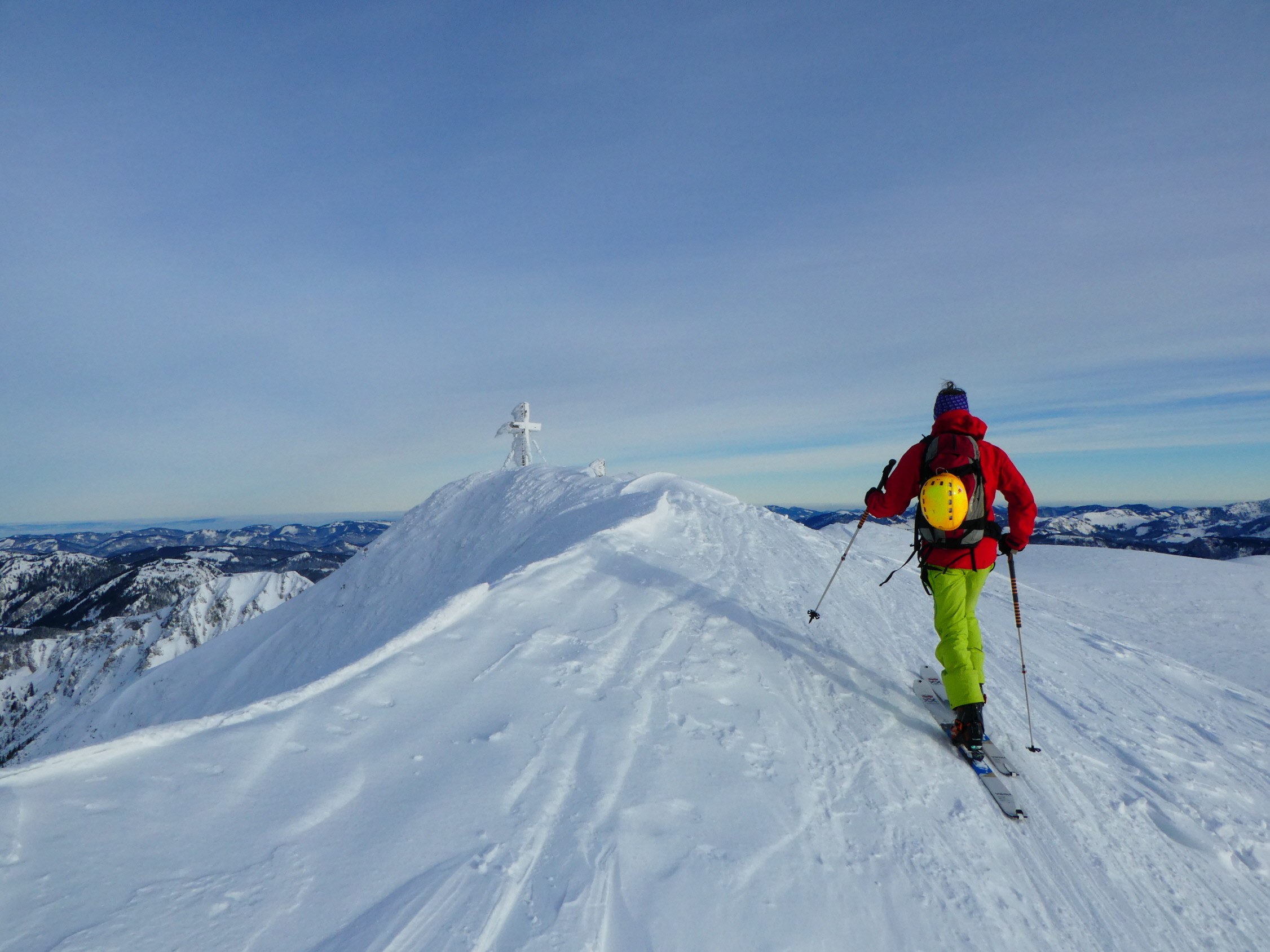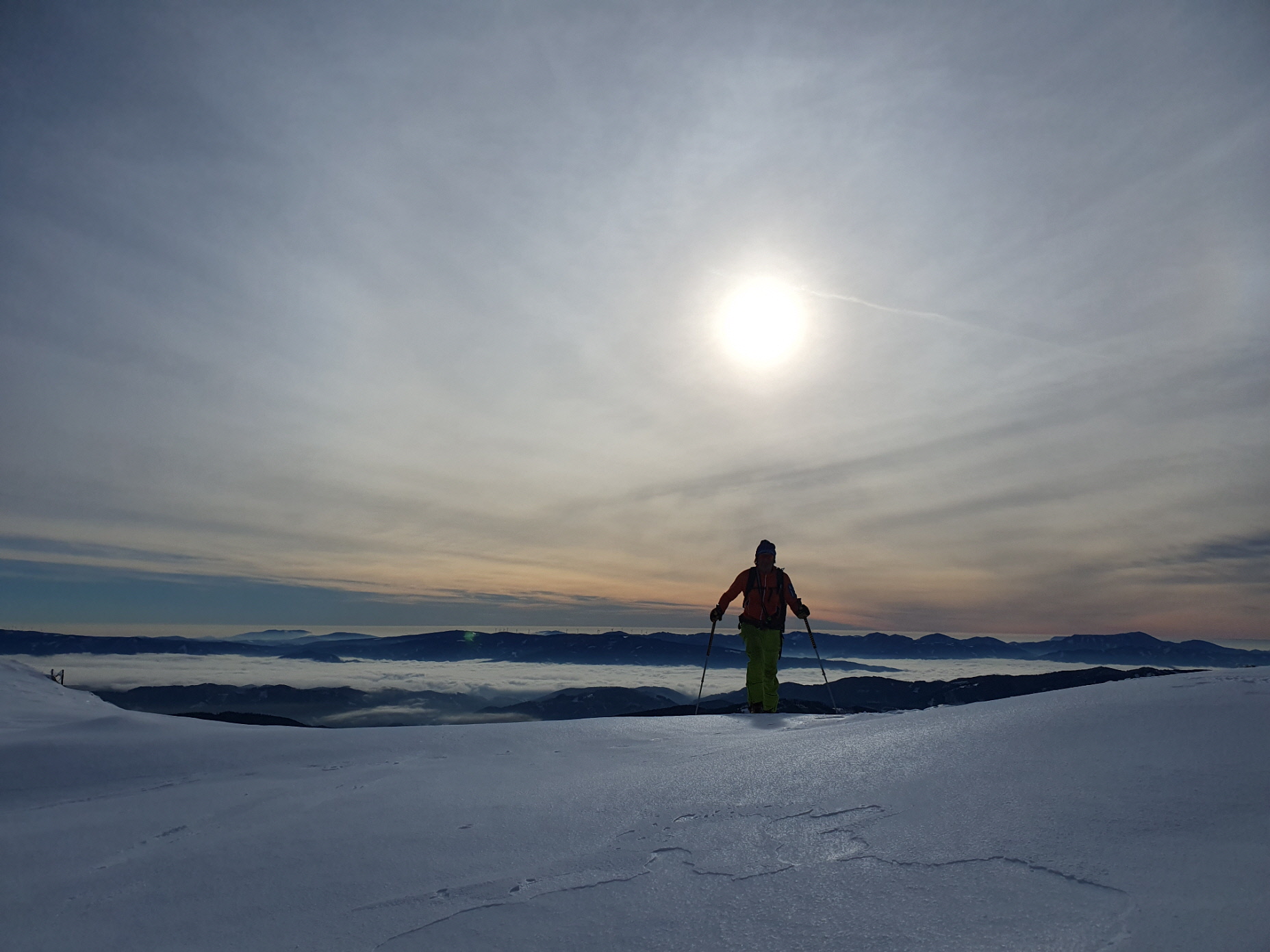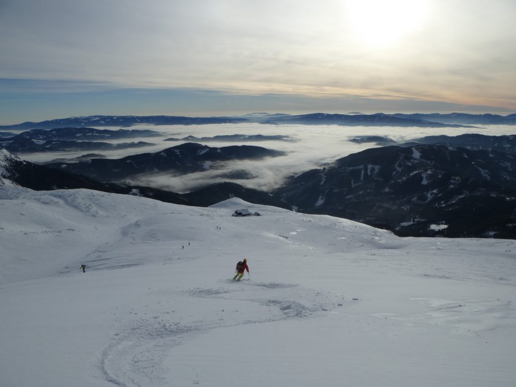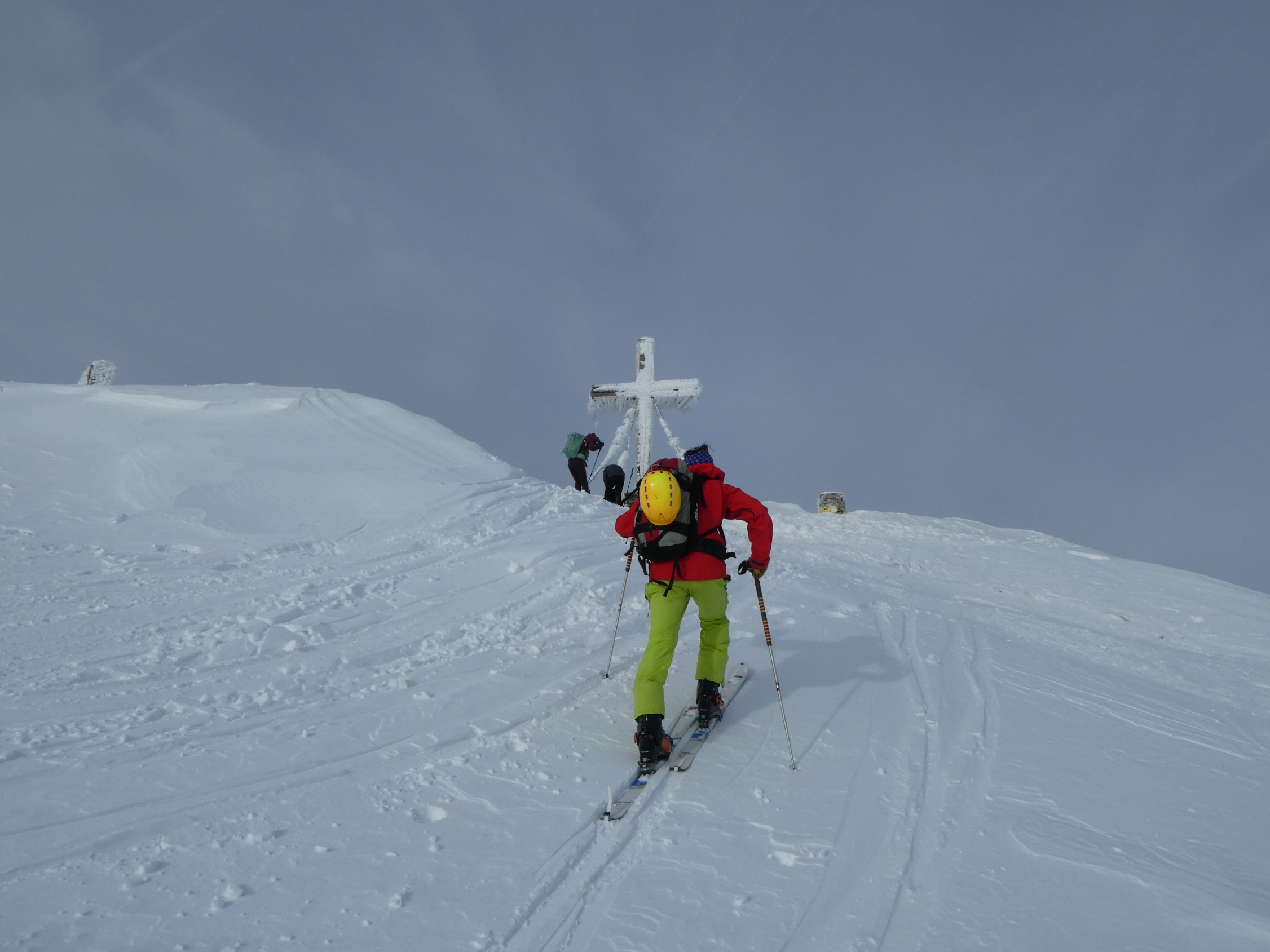 Die Sonne hinter einer Schleierbewölkung im Rücken und der nach wie vor die Täler überspannende Hochnebel haben uns immer wieder zum bewundernden Umdrehen bzw. zu einigen Fotostopps veranlasst. Rechts vorbei an der Hütte ging es weiter aufwärts. Und im Gegensatz zum ersten Anstieg war es jetzt auch noch fast windstill. Erst als wir das zweite Mal beim markanten Gipfelkreuz angekommen sind, haben wir beim Umrüsten für die Talabfahrt die Jacken angezogen.