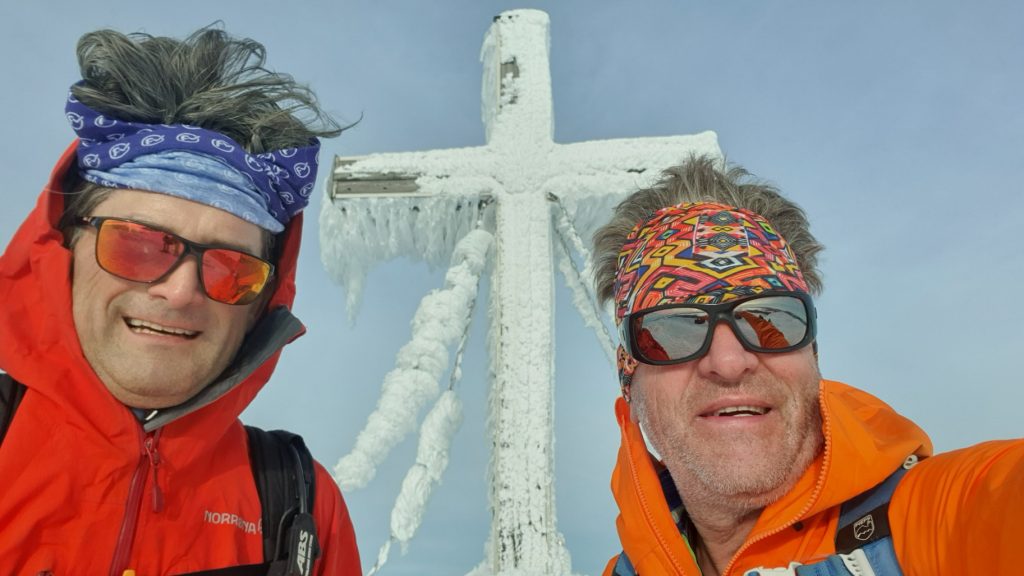 Gleich danach haben wir wegen der frischen Brise, die uns auf der Hochfläche empfangen hat, die Jacken angezogen und sind weiter angestiegen. Nach einer Aufstiegszeit von 1Std 50 min (mit Pausen) waren wir am Gipfel, haben uns gestärkt und für die Abfahrt umgerüstet.