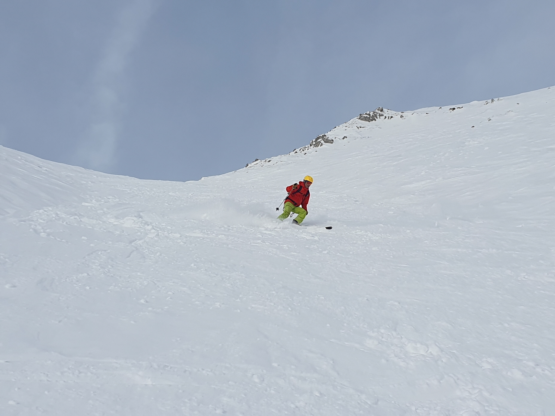 Wieder ging es genussvoll über die Hochfläche talwärts. Am Schluss sind wir jetzt aber weiter nach rechts gequert und in die westliche Schallerrinne eingefahren. Die Schneeverhältnisse waren ähnlich wie in der zuerst befahrenen Rinne. Lediglich im etwas engeren steilen Mittelteil hatten sich schon einige Buckel gebildet. Nach unten hin weitet sich die Rinne wieder und wir sind ähnlich lustvoll talwärts geschwungen wie zuvor.