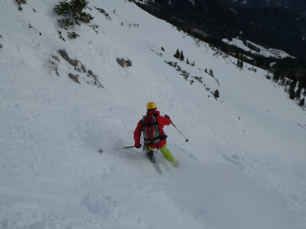 Der gepresste Pulverschnee war auch hier sehr gut fahrbar und ist es mit zunehmender Steilheit auch weiter hinunter geblieben. Im letzten Drittel der Rinne sind wir schließlich auf einem griffigen, tragfähigen Windharschdeckel weiterhin sehr genussvoll talwärts gebraust. Dieses Vergnügen wollten wir ein weiteres Mal genießen und wir sind daher dort, wo die beiden Rinnen sich vereinigen, nach links zur Aufstiegsspur ausgequert.