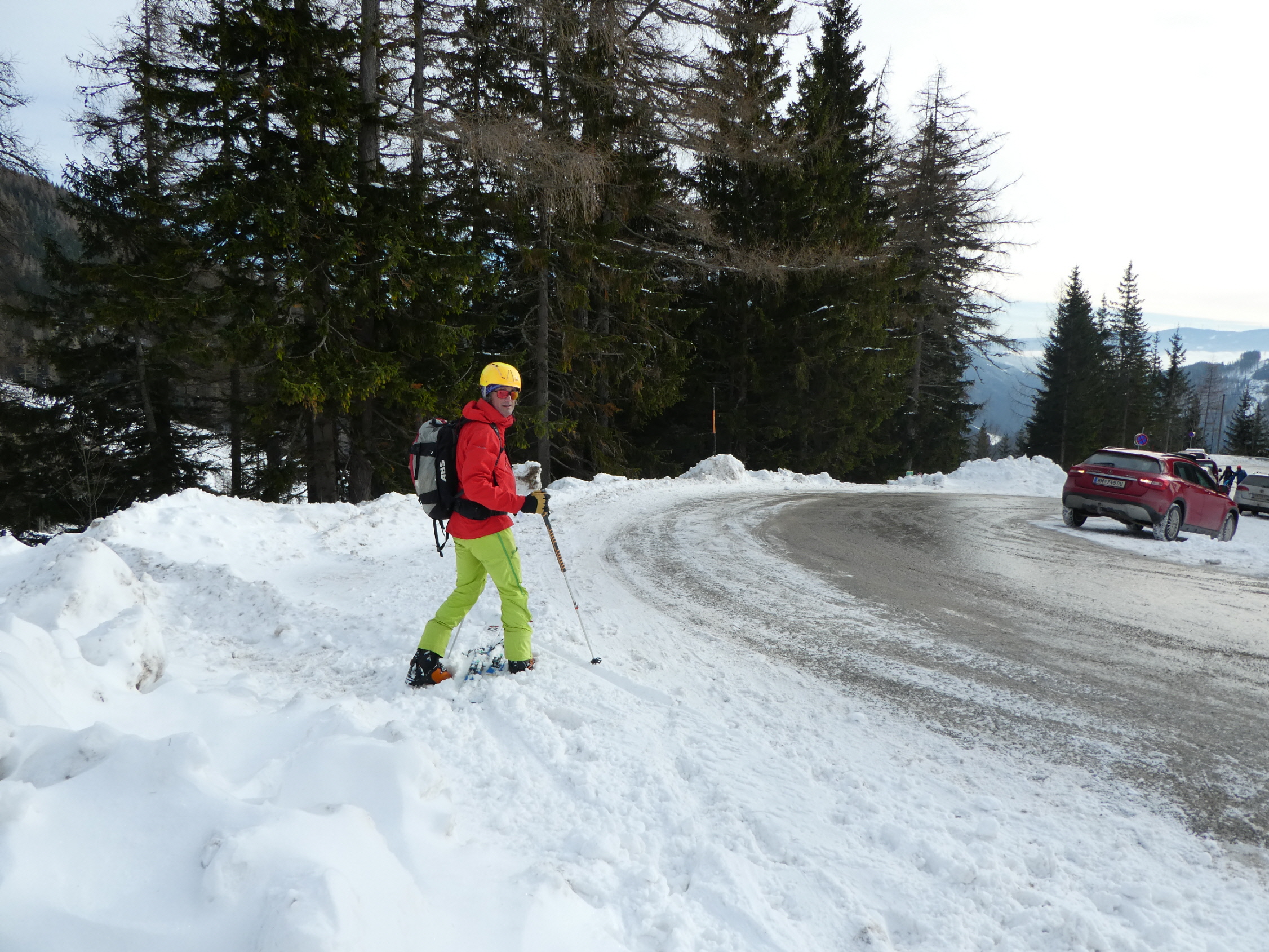 Die Felle und die Harscheisen kamen wieder drauf und sehr bald sind wir zwischen einigen Gleichgesinnten wieder angestiegen. Da wir die Schneeverhältnisse in der Rinne jetzt schon ausreichend getestet hatten, haben wir uns im oberen Teil für die alternative Aufstiegsroute in direkter Linie zum Graf-Meran-Haus entschieden.