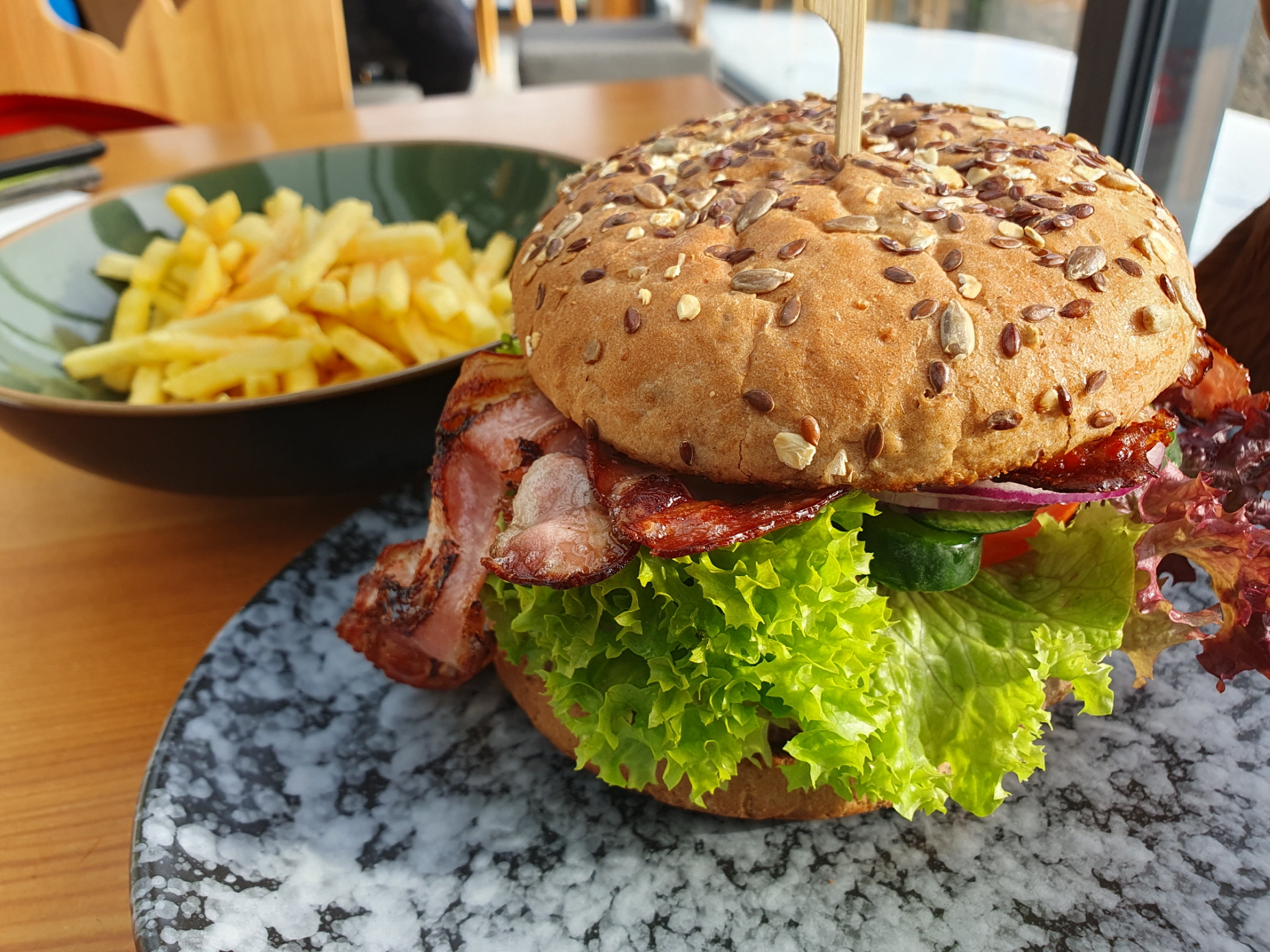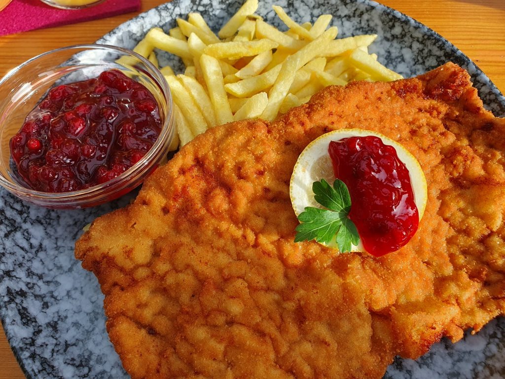 Bereits um 11.20 Uhr haben wir die Ausrüstung im Kofferraum verstaut. Nach dem Umziehen sind wir – und das wird den Heinrich freuen – noch ein paar Meter vom Parkplatz zur Einkehrstätte aufgestiegen. Von meinem Schnitzel mit Preiselbeeren und Pommes frites darf sich mein Kulinarikkritiker heute virtuell ein großes Stück abschneiden. Und weil es nach der letzten Tour etwas Schmalkost für ihn gegeben hat, lässt ihm Andreas sicher auch ein Stück von seinem g’schmackigen Almburger als Wiedergutmachung 😉.