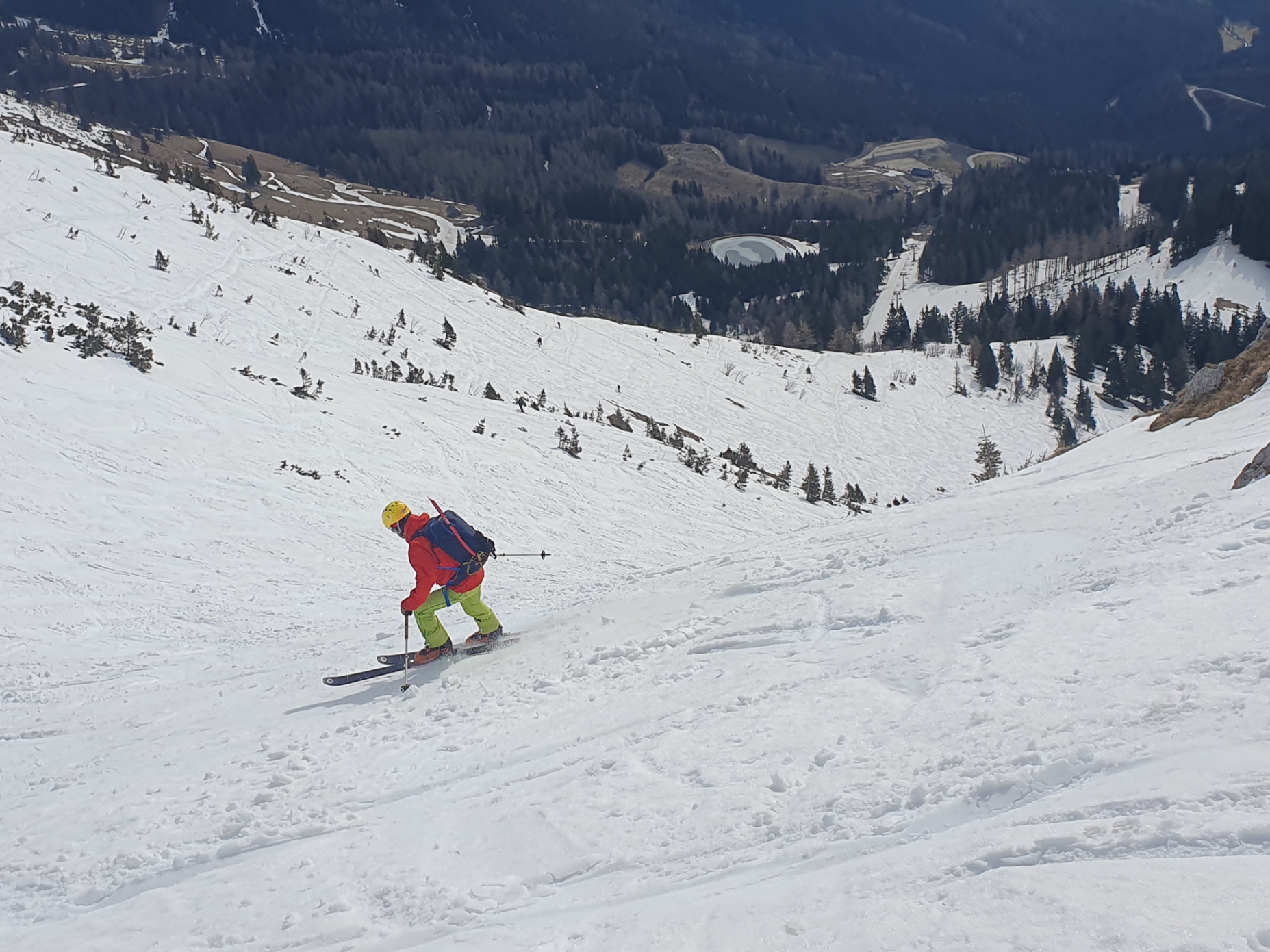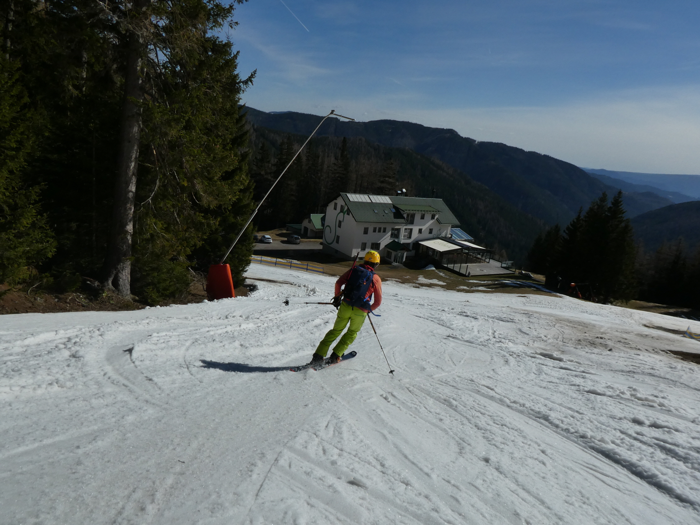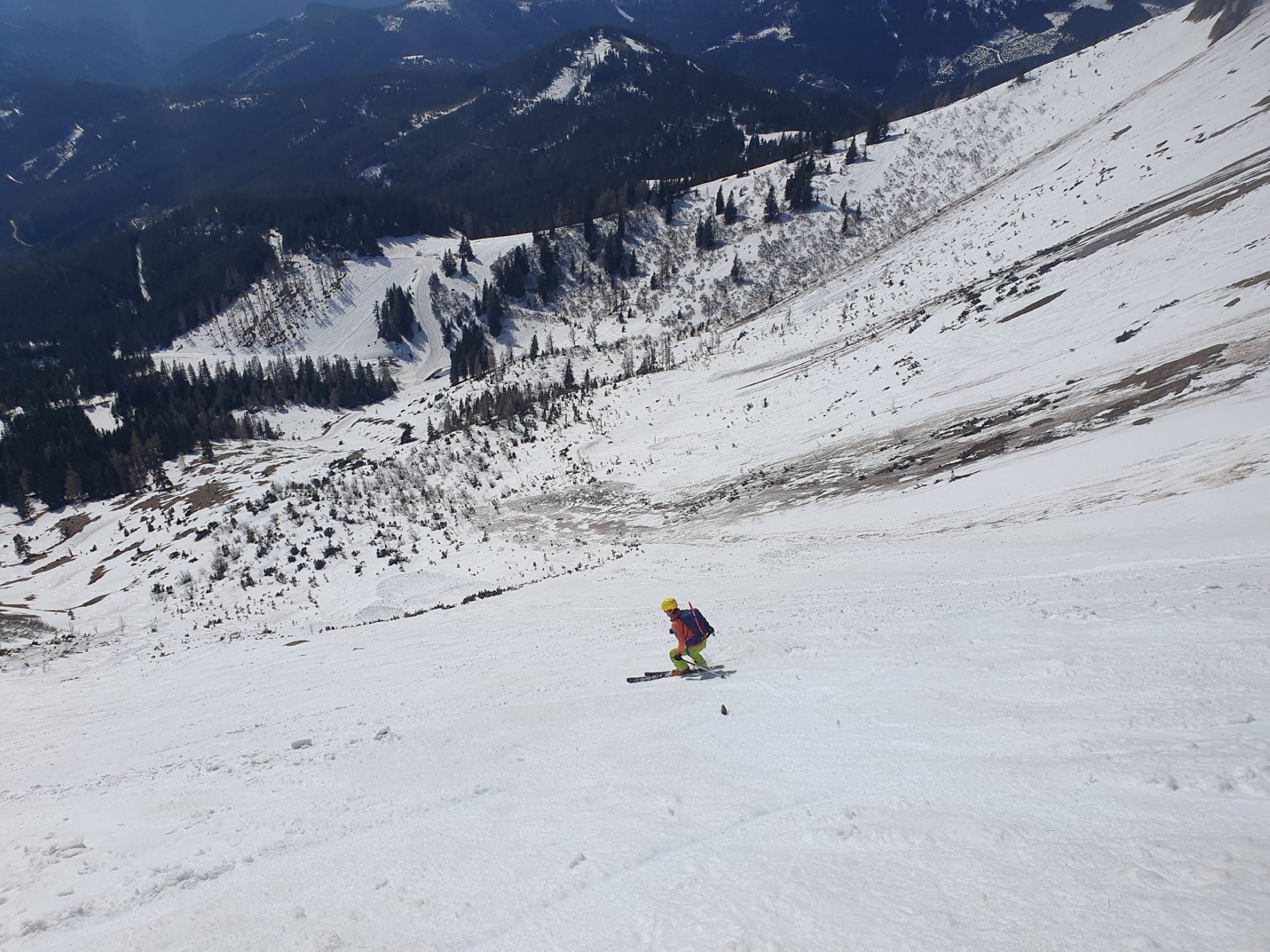 Bis weit hinunter ins Kar war kein einziger schlechter Schwung dabei. Auch auf den letzten Geländestufen hinunter bis zum präparierten Weg gab es noch genussvolle Schwünge. Am Weg sind wir danach bis zur Bergstation des Sessellifts zurückgefahren. Ab da sind wir anschließend im stellenweise etwas tieferen Frühjahrsschnee auf der Piste zum Ausgangspunkt der Tour auf der Brunnalm abgefahren.