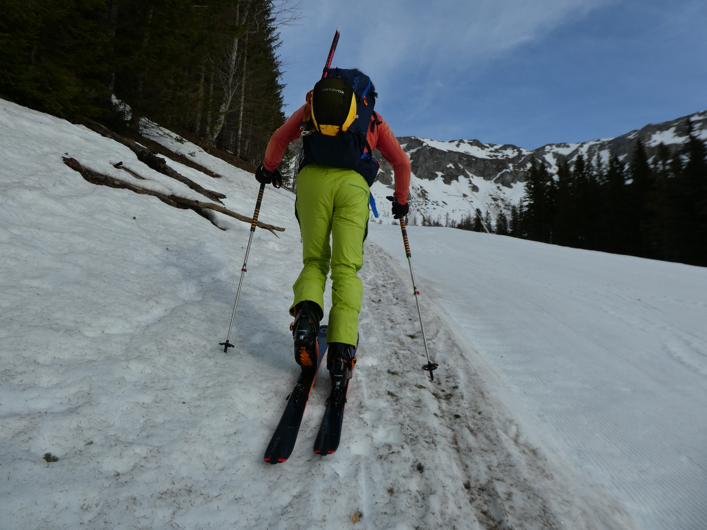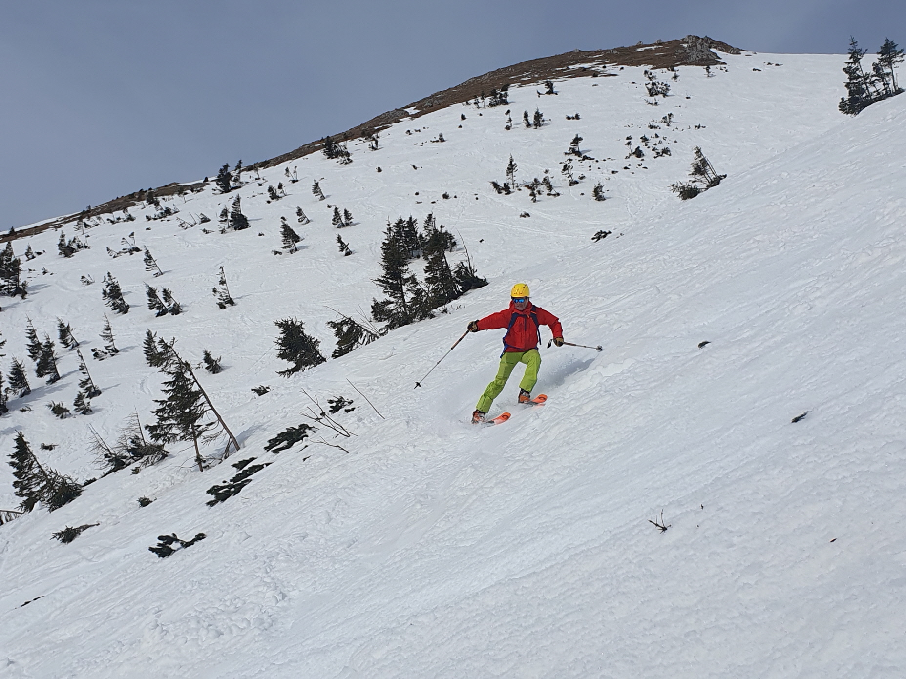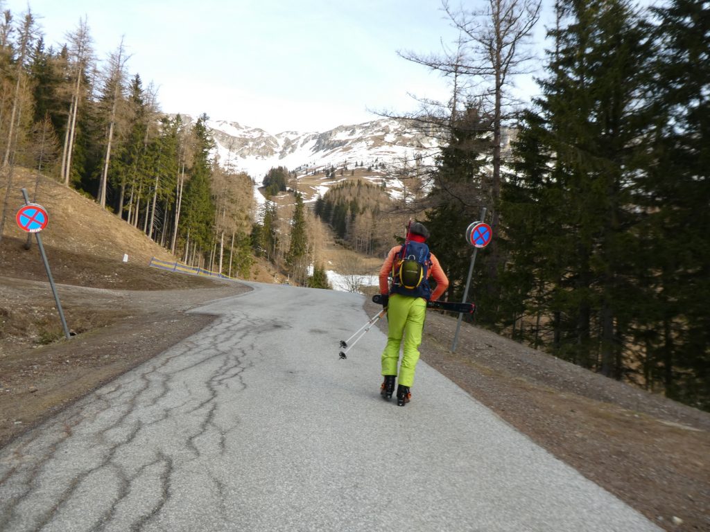 Bis weit hinunter ins Kar war kein einziger schlechter Schwung dabei. Auch auf den letzten Geländestufen hinunter bis zum präparierten Weg gab es noch genussvolle Schwünge. Am Weg sind wir danach bis zur Bergstation des Sessellifts zurückgefahren. Ab da sind wir anschließend im stellenweise etwas tieferen Frühjahrsschnee auf der Piste zum Ausgangspunkt der Tour auf der Brunnalm abgefahren.