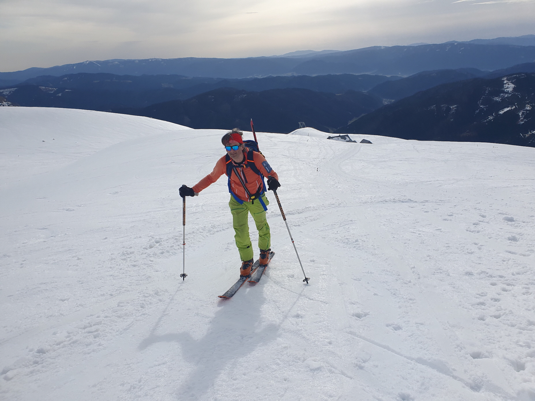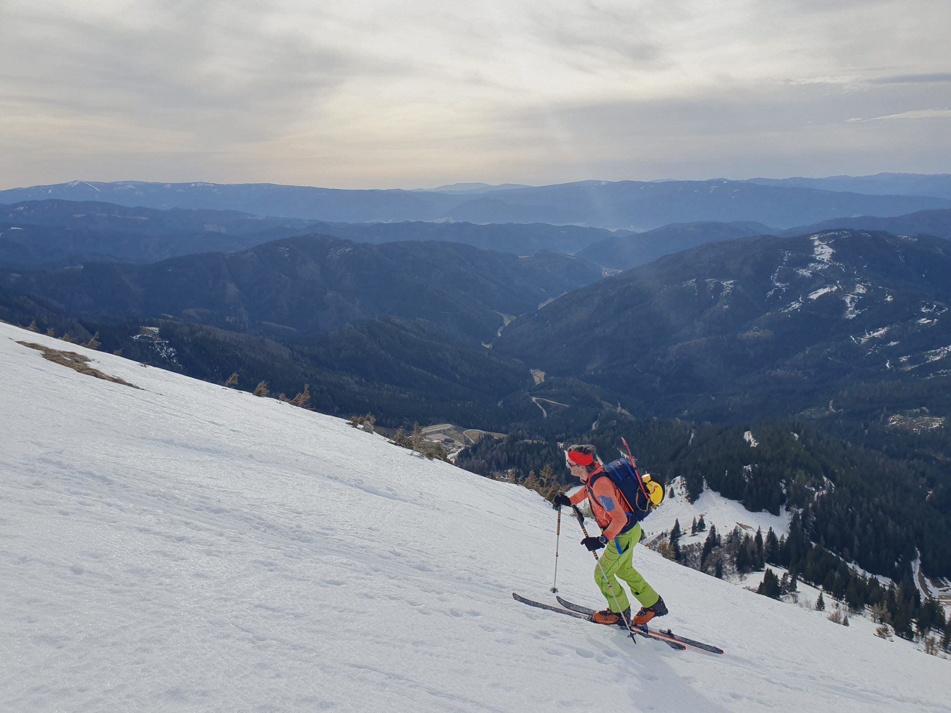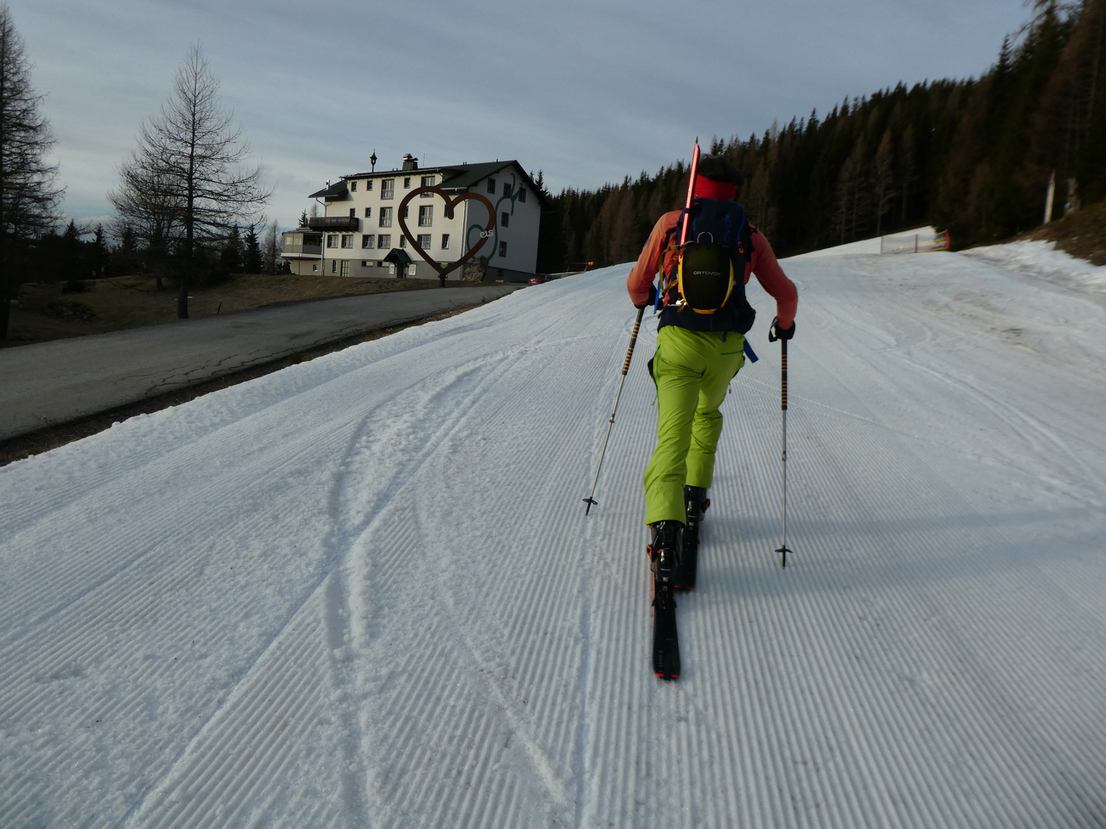 Dort hatte sich an den Verhältnissen gegenüber Samstag wenig verändert. Leider hat auch heute – entgegen der Prognose – ein Wolkenschirm die Einstrahlung der Sonne verhindert. Weil die Nacht davor aber klar war, hatte sich die Schneedecke durch die Abstrahlung ordentlich verfestigt. Entlang des Pistenrands und danach über den Stockschlag ging es hinauf auf den Sonnkogel.