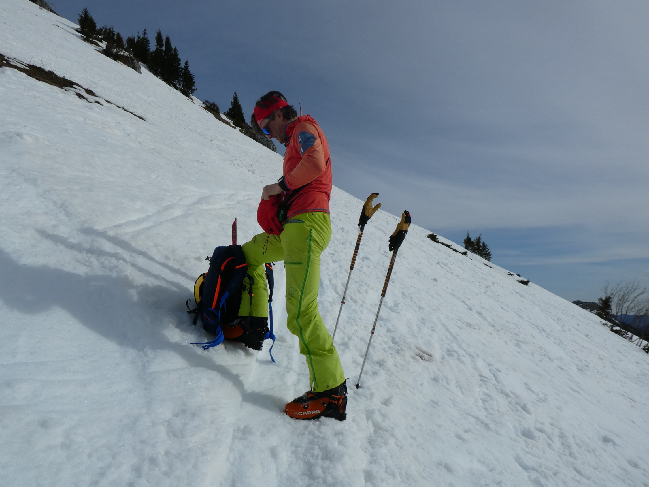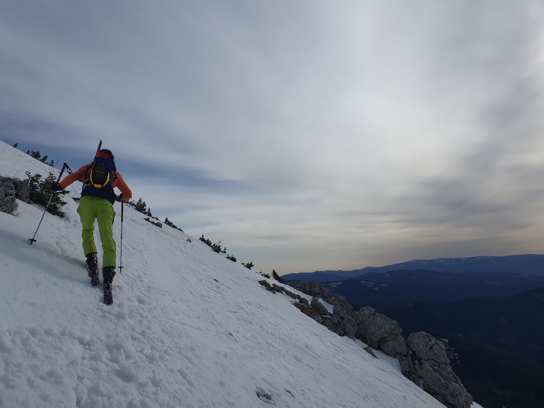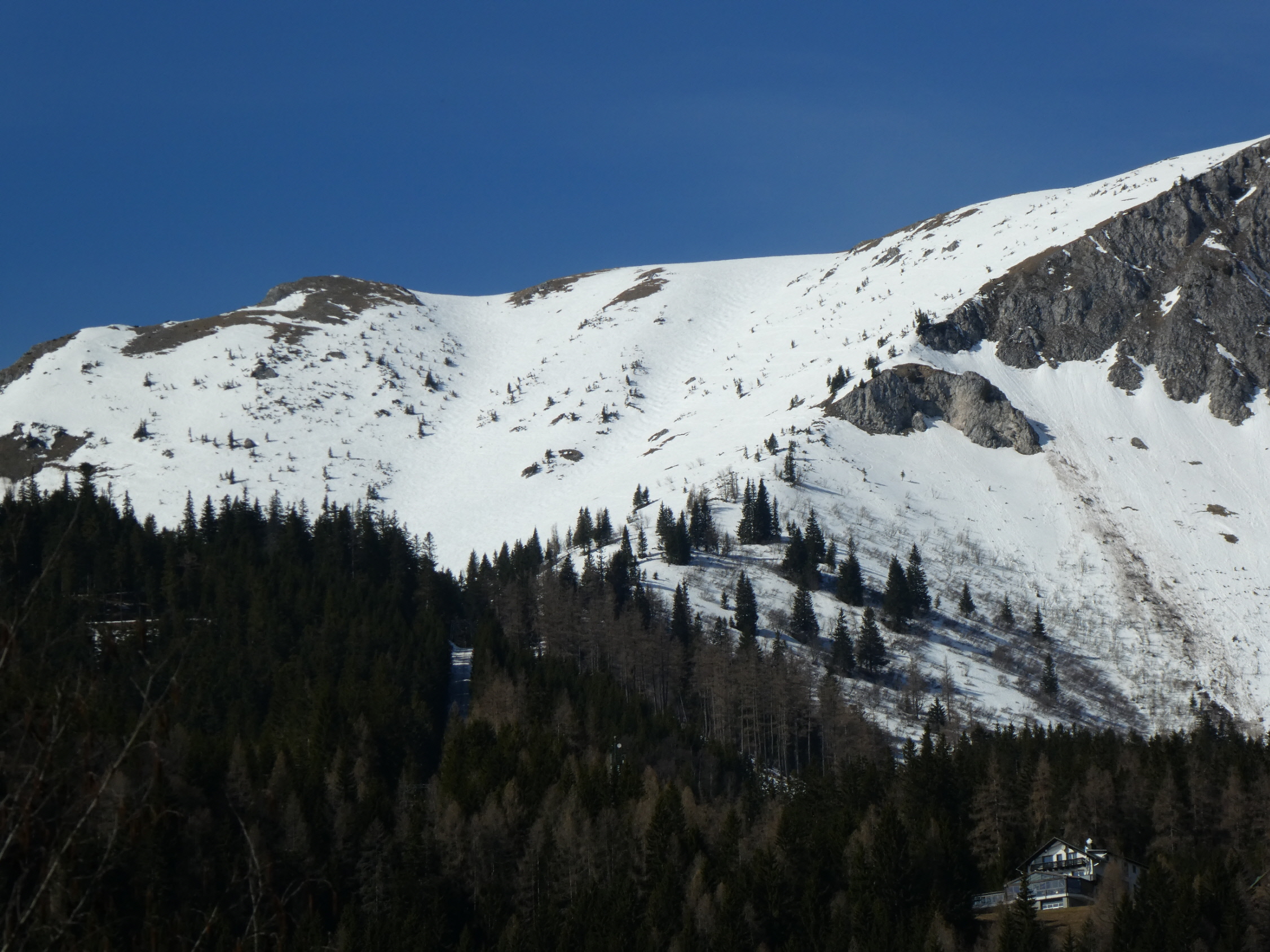 Dort hatte sich an den Verhältnissen gegenüber Samstag wenig verändert. Leider hat auch heute – entgegen der Prognose – ein Wolkenschirm die Einstrahlung der Sonne verhindert. Weil die Nacht davor aber klar war, hatte sich die Schneedecke durch die Abstrahlung ordentlich verfestigt. Entlang des Pistenrands und danach über den Stockschlag ging es hinauf auf den Sonnkogel.