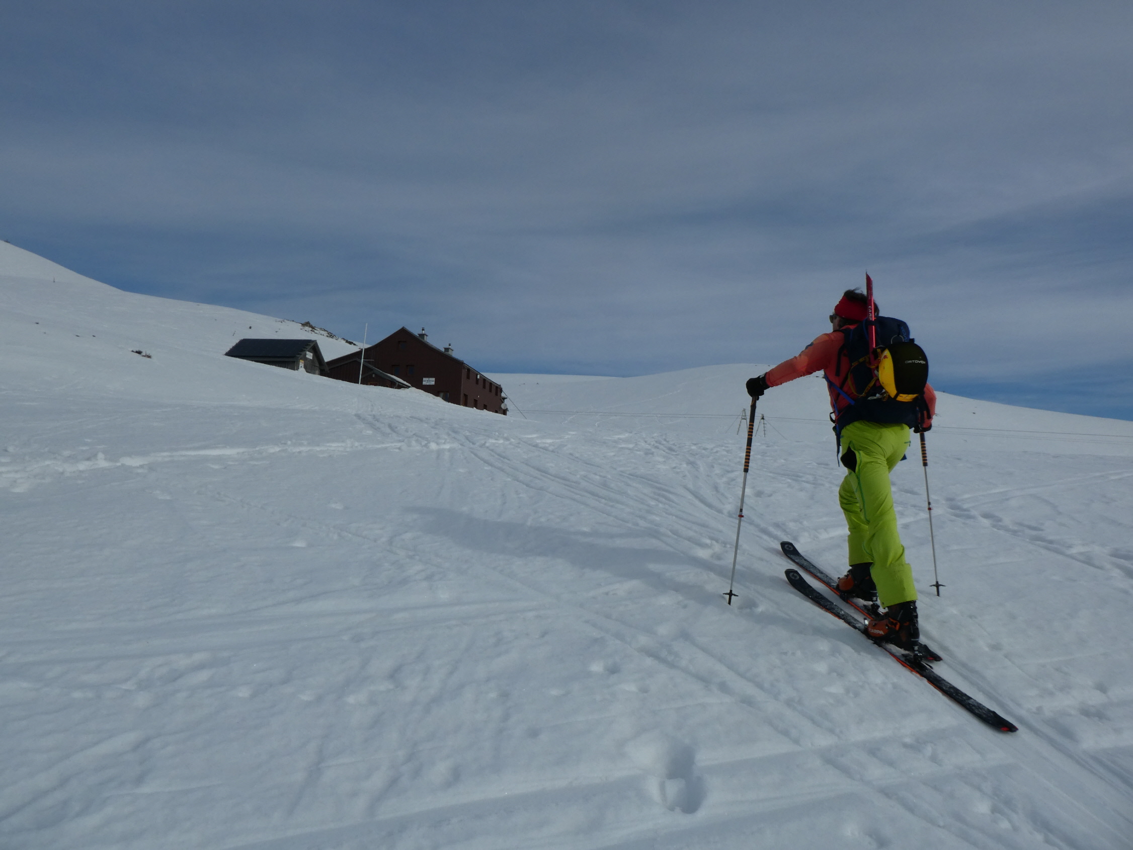 Dort haben wir wieder die Felle aufgezogen, gleich auch die Harscheisen montiert und unseren Wiederanstieg gestartet. Jetzt hat sich auch die Sonne vermehrt durch die Wolkendecke gekämpft und schon während unseres Anstiegs hinauf zum Graf-Meran-Haus hat es oberflächlich aufgefirnt. Und auch die flacheren Passagen auf der Hochfläche hinauf zum Gipfel haben so viel Sonne abbekommen, dass auch hier eine starke Veränderung gegenüber dem ersten Mal bemerkbar war.