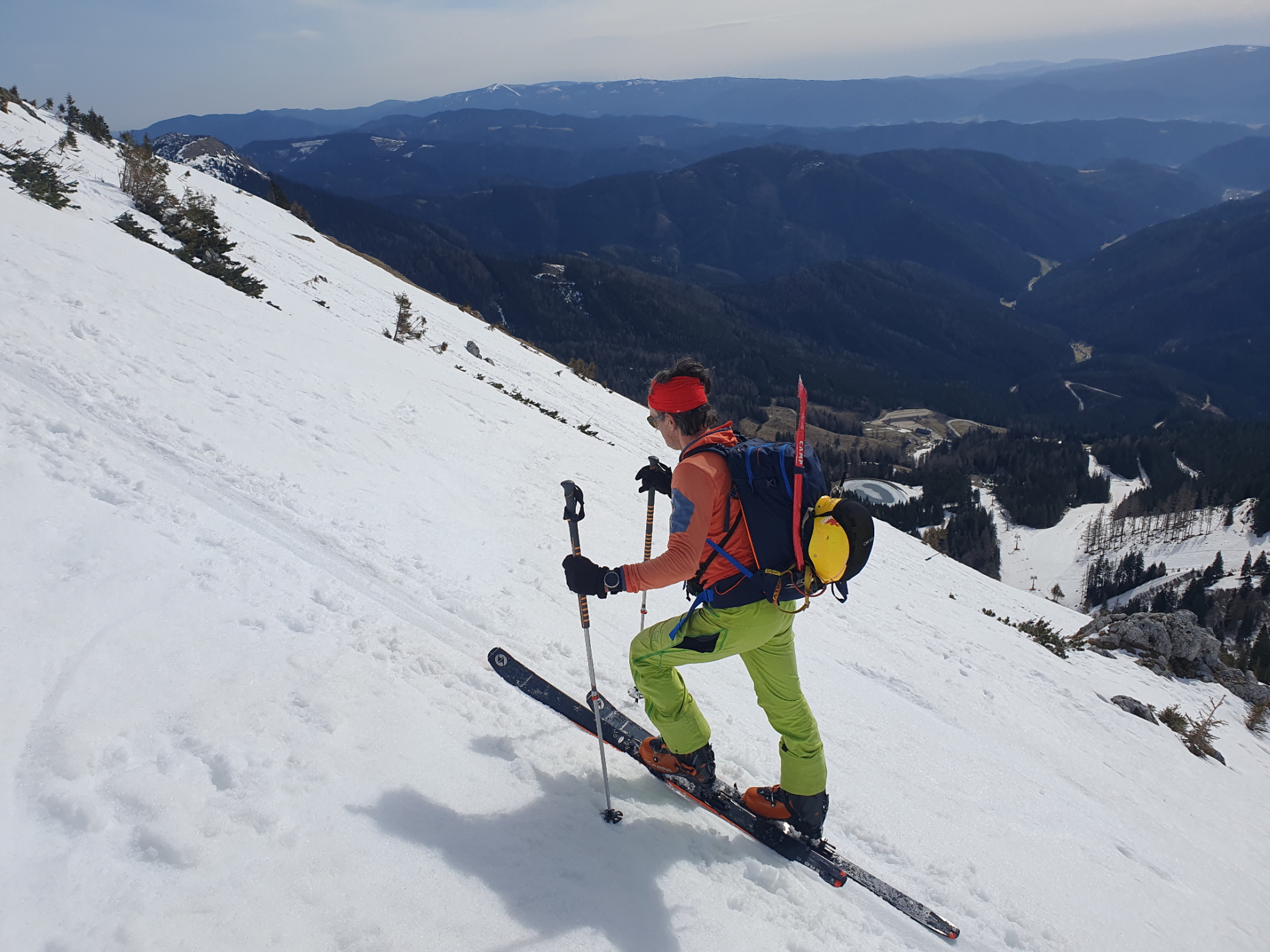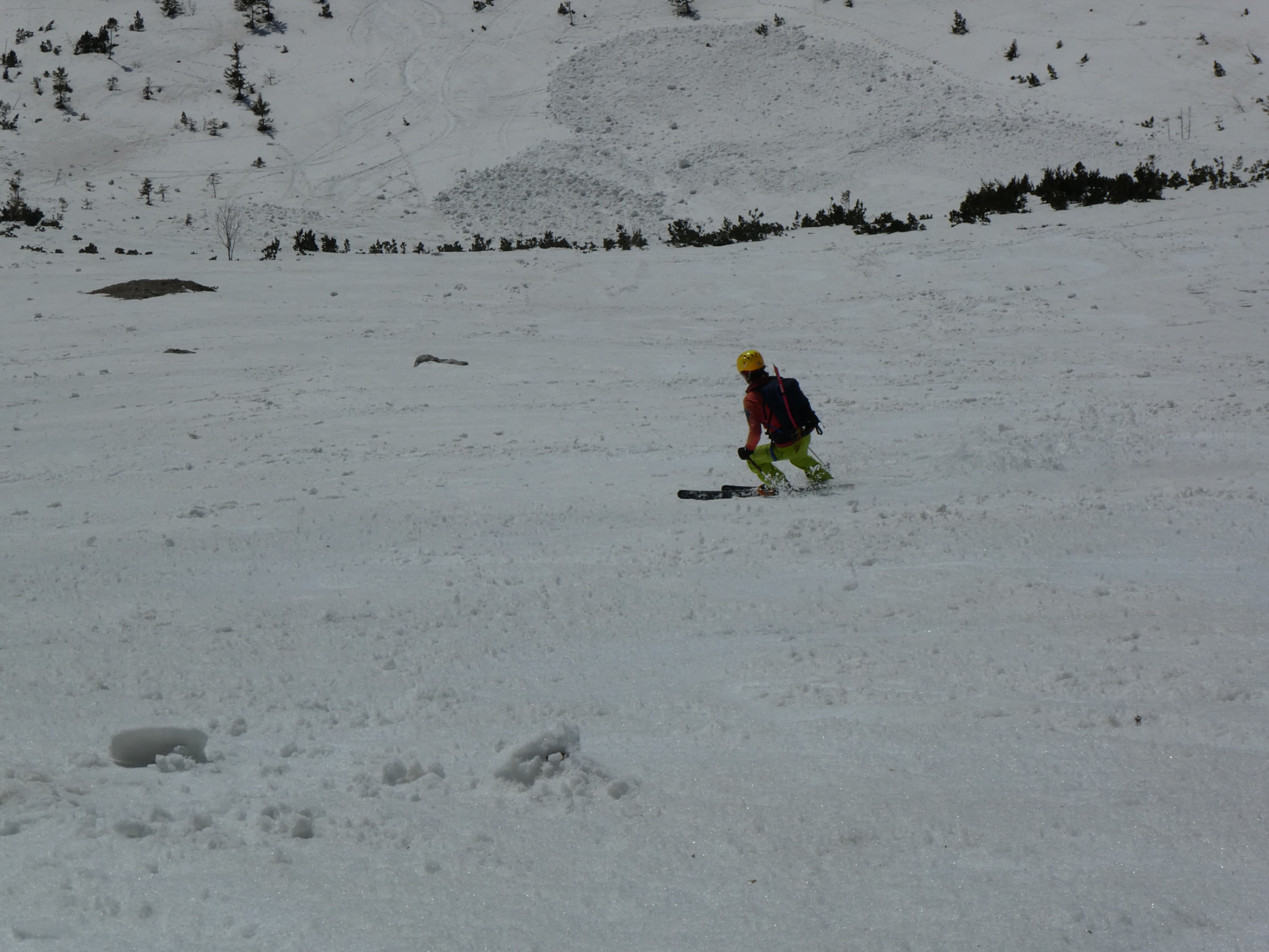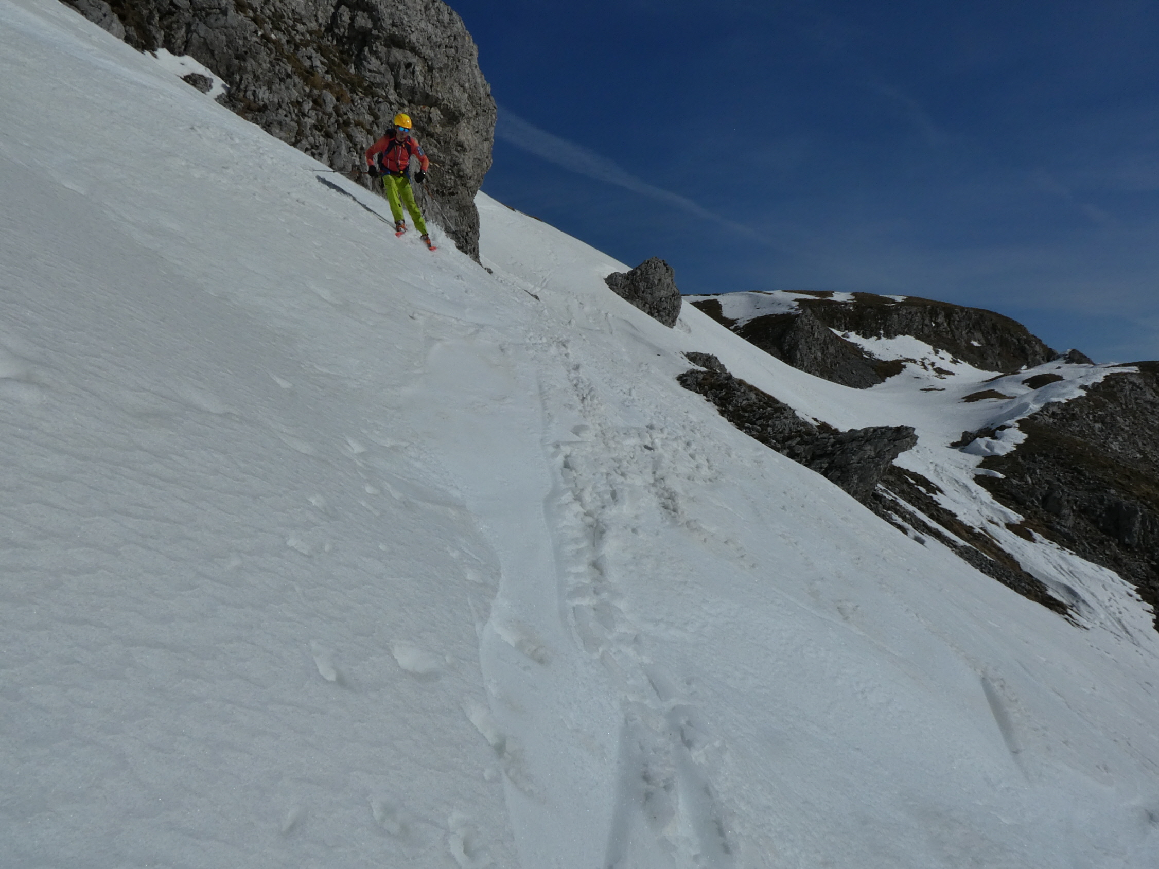 Am Gipfel haben wir daher ein weiters Mal die Strategie gewechselt. Die schon unvermeidbar geglaubte nächste Schaller-Abfahrt haben wir verworfen und sind nach dem Umrüsten in Richtung Südosten gestartet. Von unten hatten wir ausgemacht, dass die Hundsschupfenrinne im unteren Drittel bereits eine Unterbrechung aufweist. Daher sind wir gleich bis zur Einfahrt in die Banane, die östliche Hundsschupfenrinne, weitergefahren.