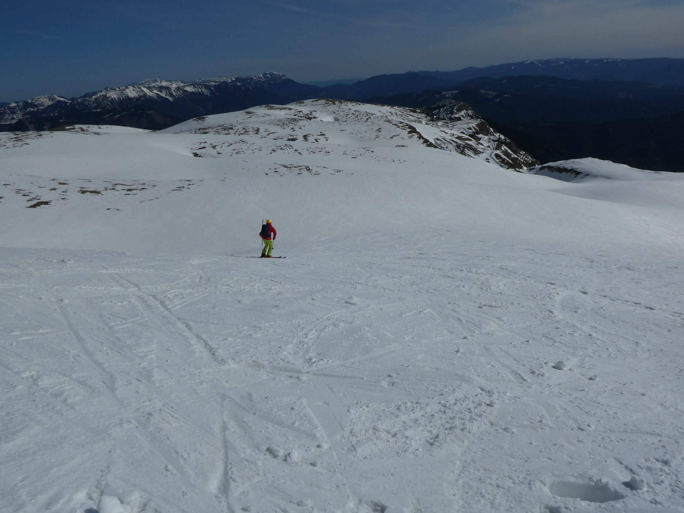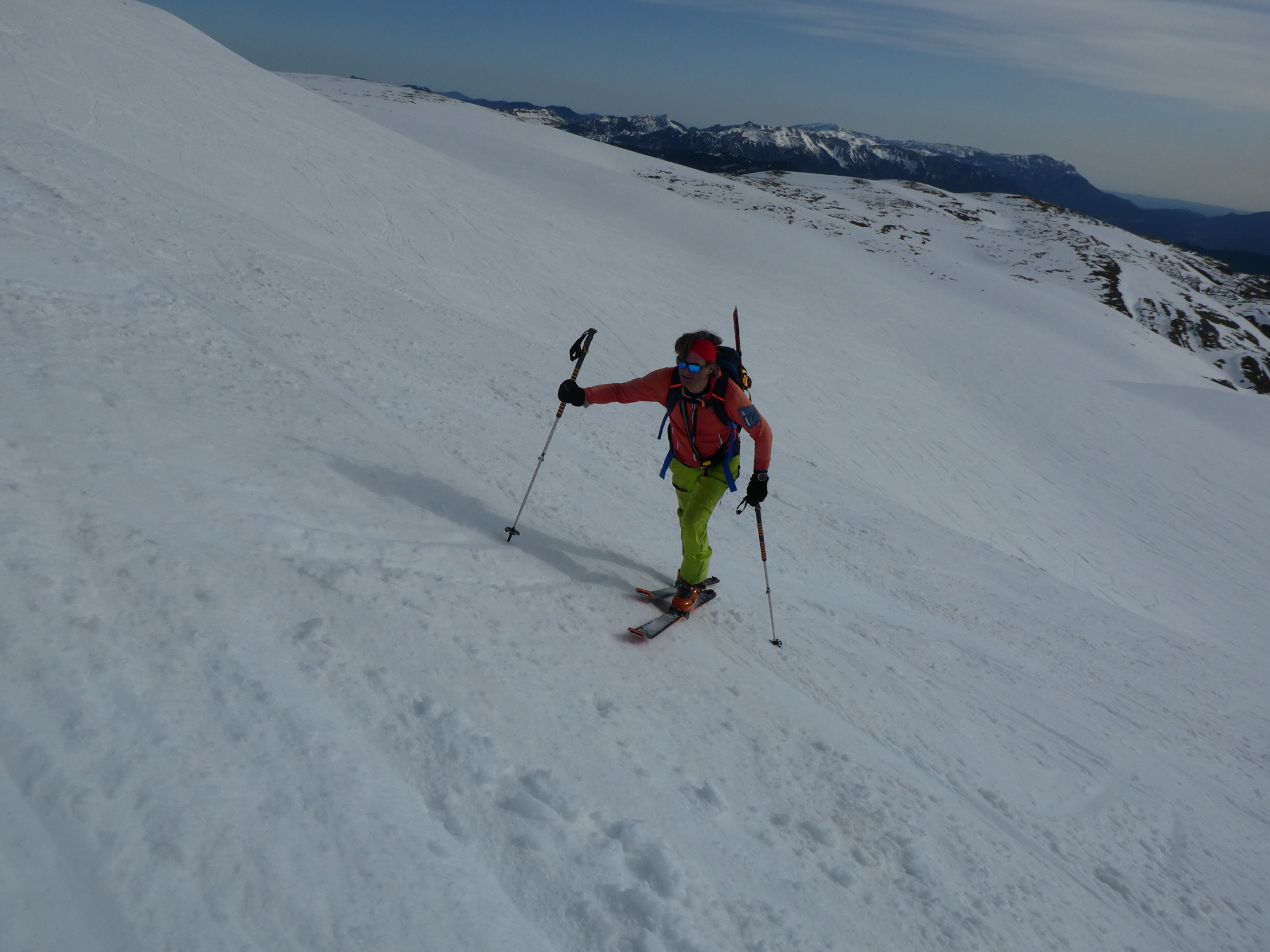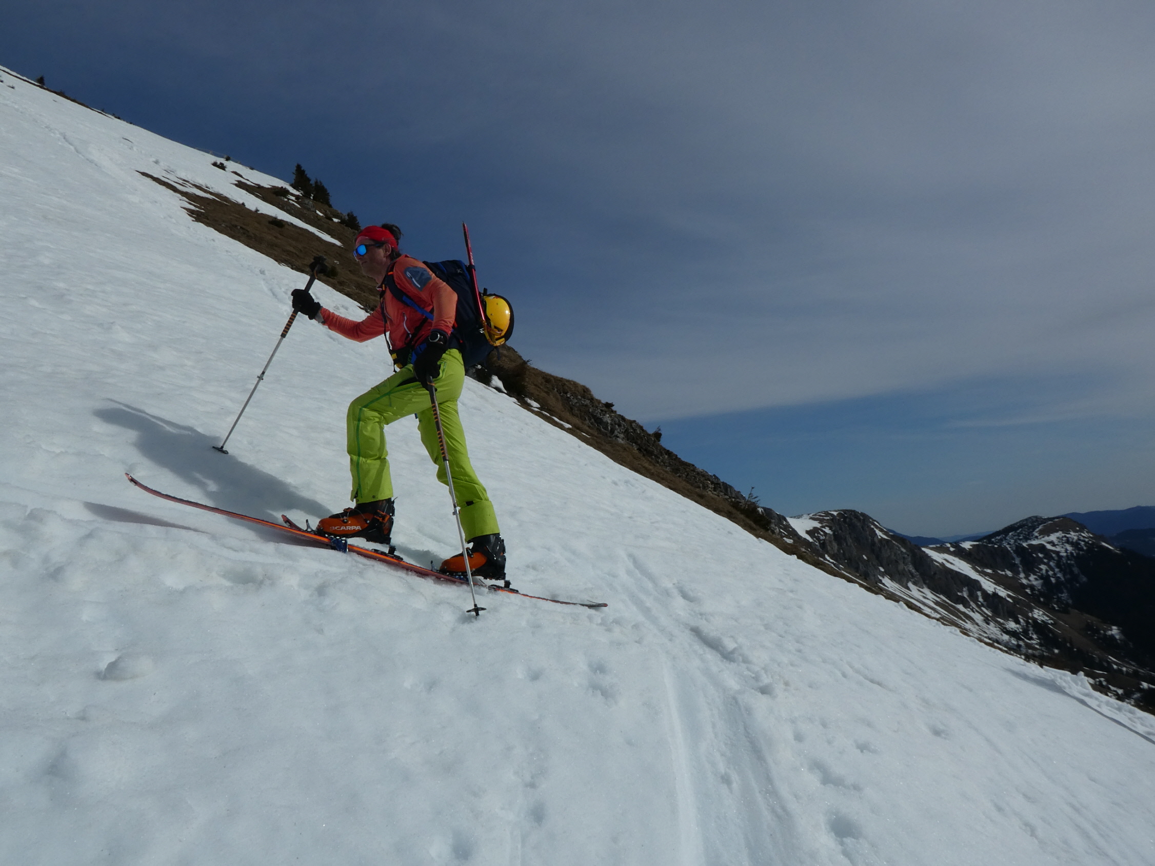 Am Gipfel haben wir daher ein weiters Mal die Strategie gewechselt. Die schon unvermeidbar geglaubte nächste Schaller-Abfahrt haben wir verworfen und sind nach dem Umrüsten in Richtung Südosten gestartet. Von unten hatten wir ausgemacht, dass die Hundsschupfenrinne im unteren Drittel bereits eine Unterbrechung aufweist. Daher sind wir gleich bis zur Einfahrt in die Banane, die östliche Hundsschupfenrinne, weitergefahren.