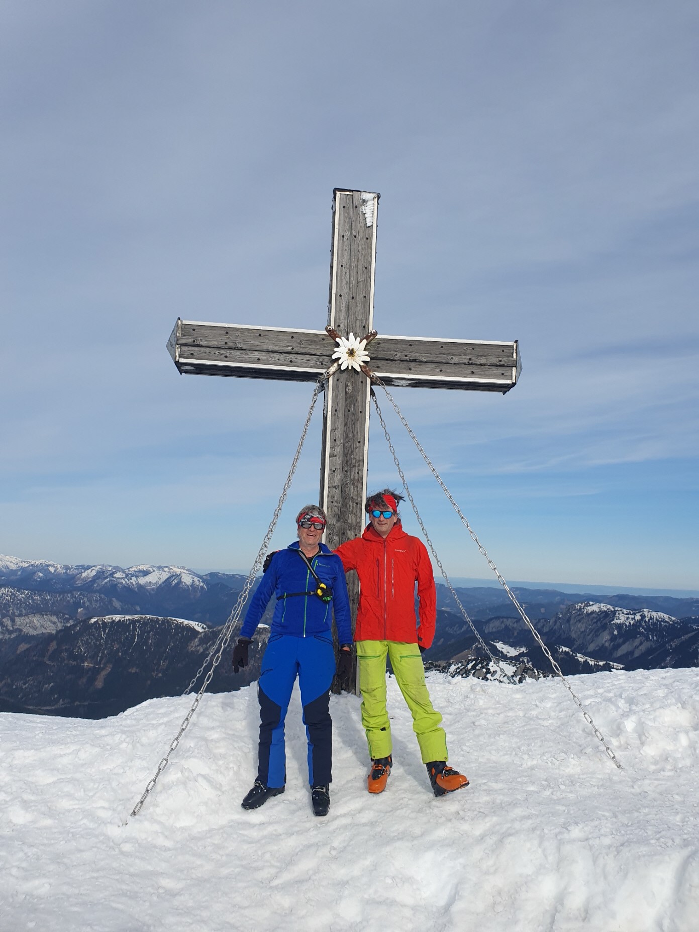 Etwas früher als vor 2 Tagen haben wir beim weiteren Anstieg hinauf zur Hochfläche wegen der zu diesem Zeitpunkt sehr harten Schneedecke die Harscheisen montiert. Der Wolkendeckel war beharrlich und ist es auch beim Anstieg bis hinauf zum Gipfel geblieben. Hans Z. sei hier für das von uns geschossene Gipfelfoto und für die blumige Schilderung seines kapitalen Sturzes bei der Einfahrt in den Blarergraben auf der Schneealpe, der seine letzte Tourensaison vorzeitig beendet hatte, gedankt.
