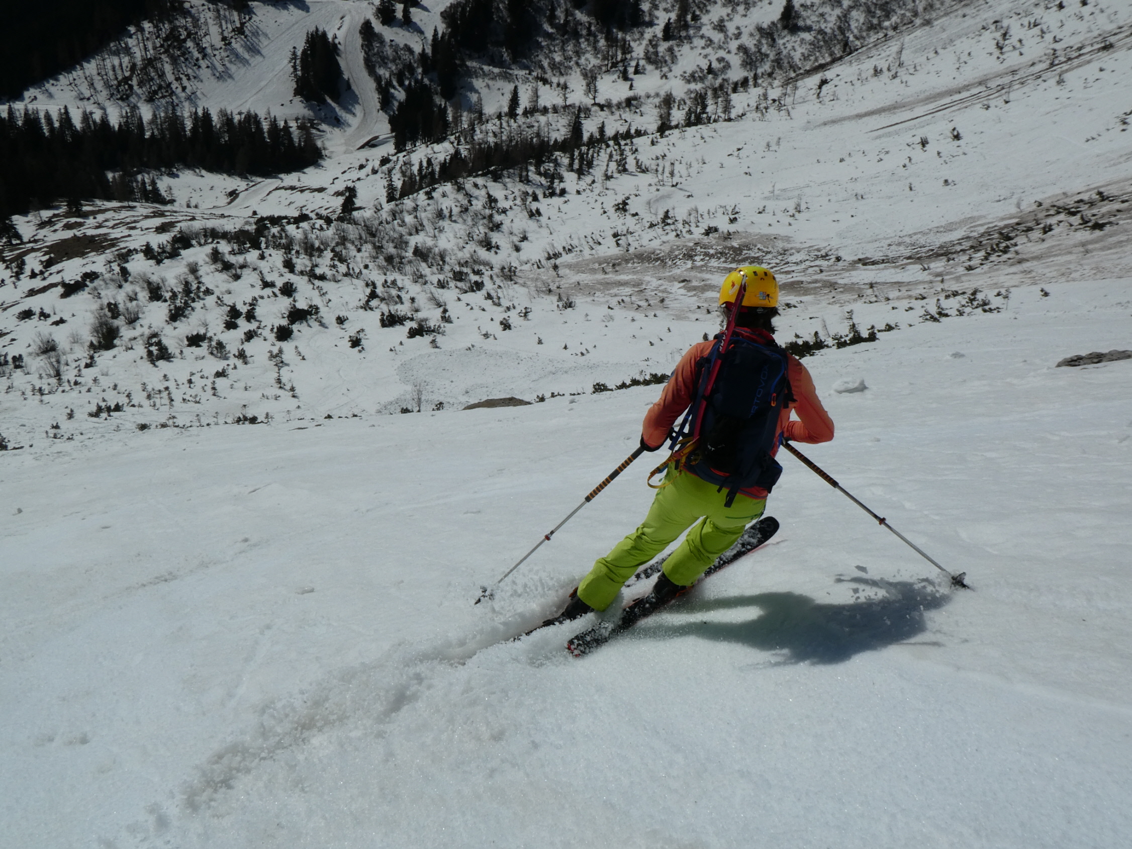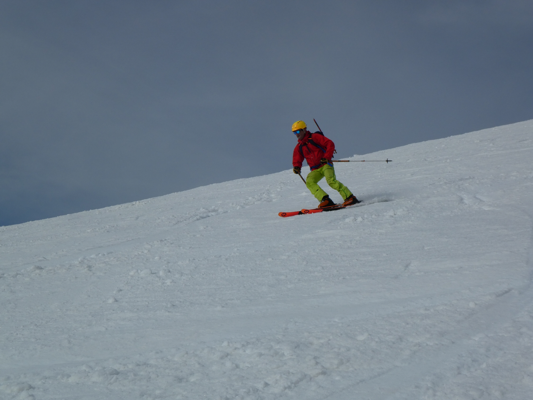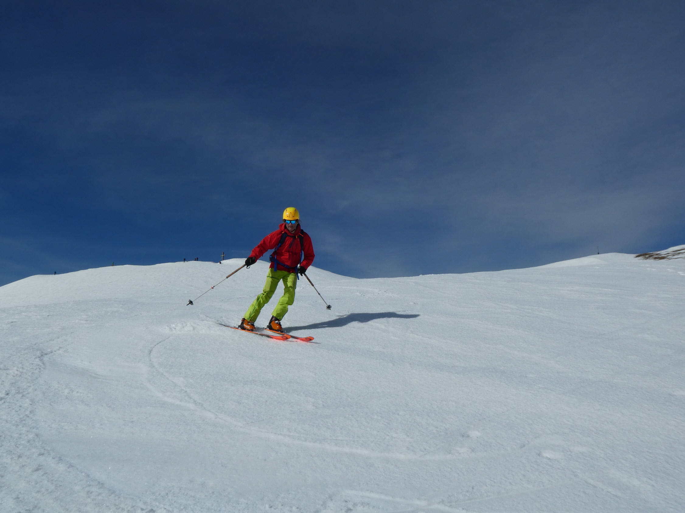 Diesem Umstand haben wir Rechnung getragen und unsere Schwungradien vergrößert. Der Schnee war auch hier perfekt, kompakter Untergrund mit einer wegspritzenden Firnschicht obendrauf. Mit abnehmender Höhe ist diese zudem immer schmieriger geworden. Das war ein wahrer Abfahrtsgenuss.
