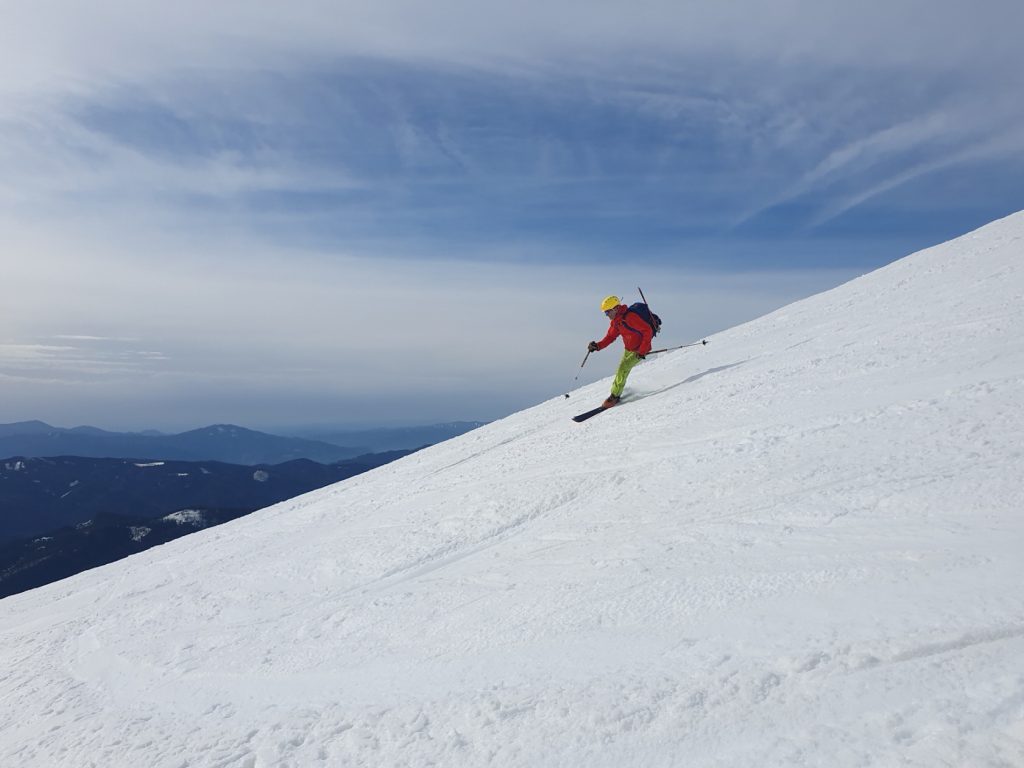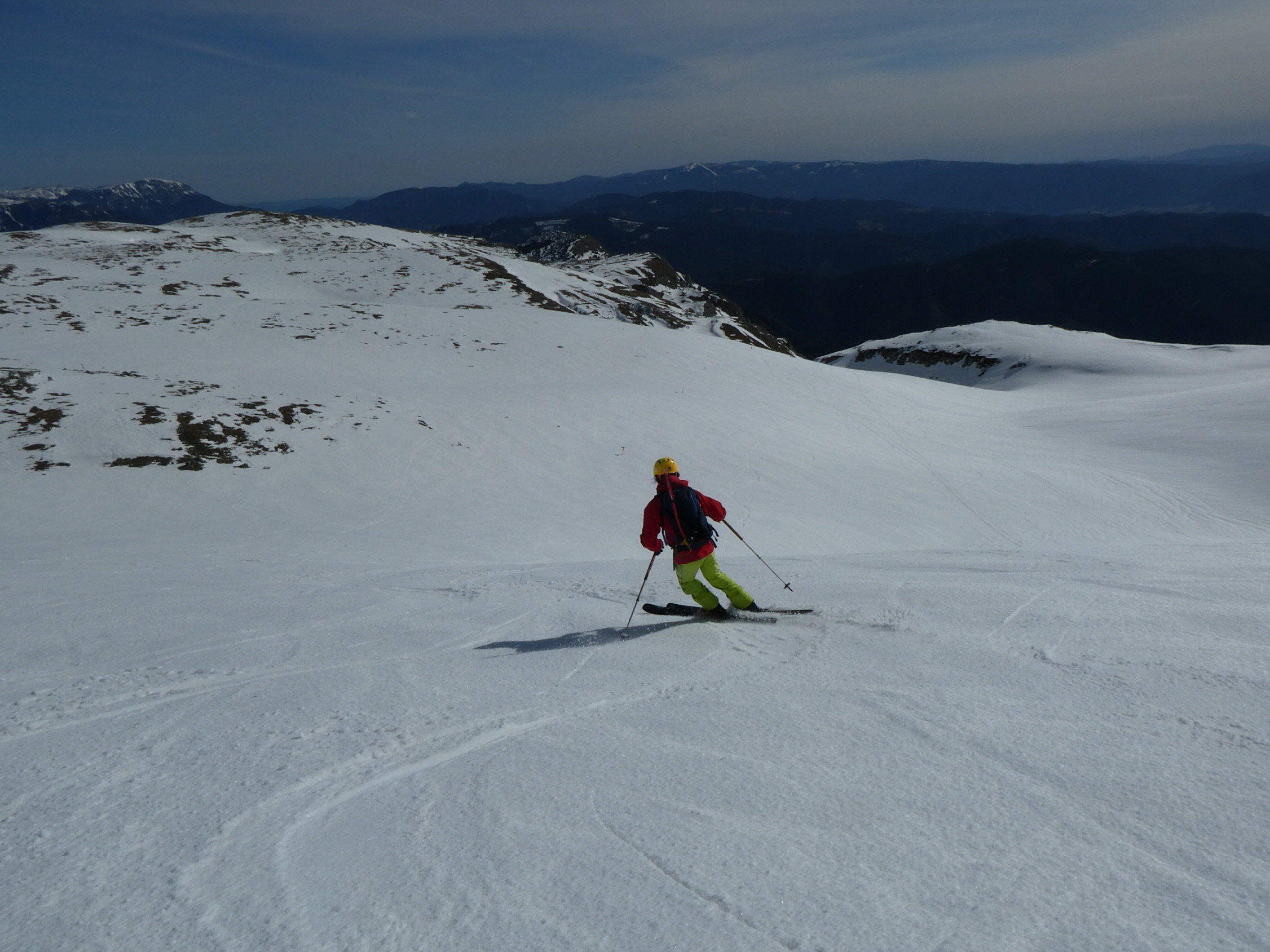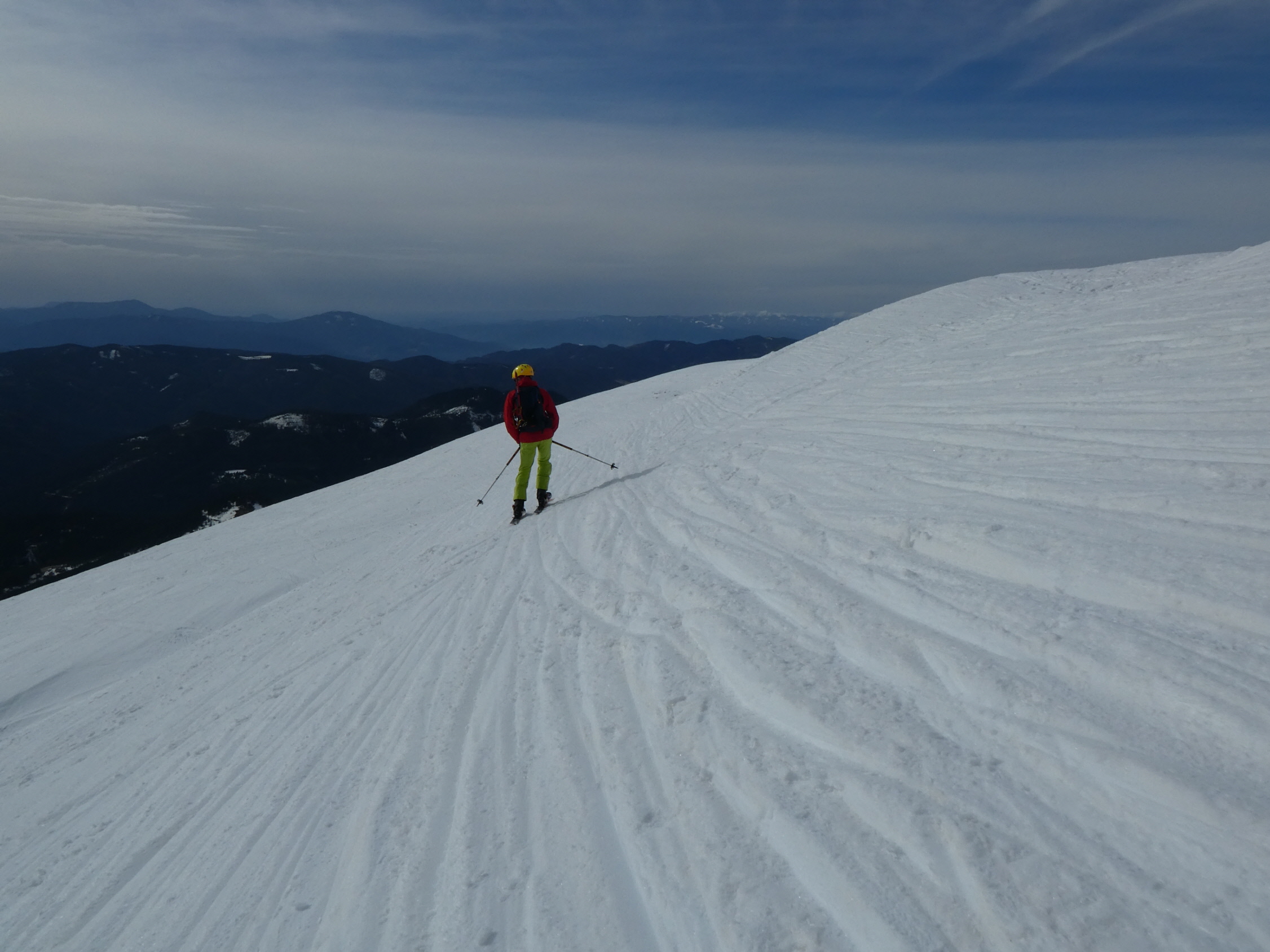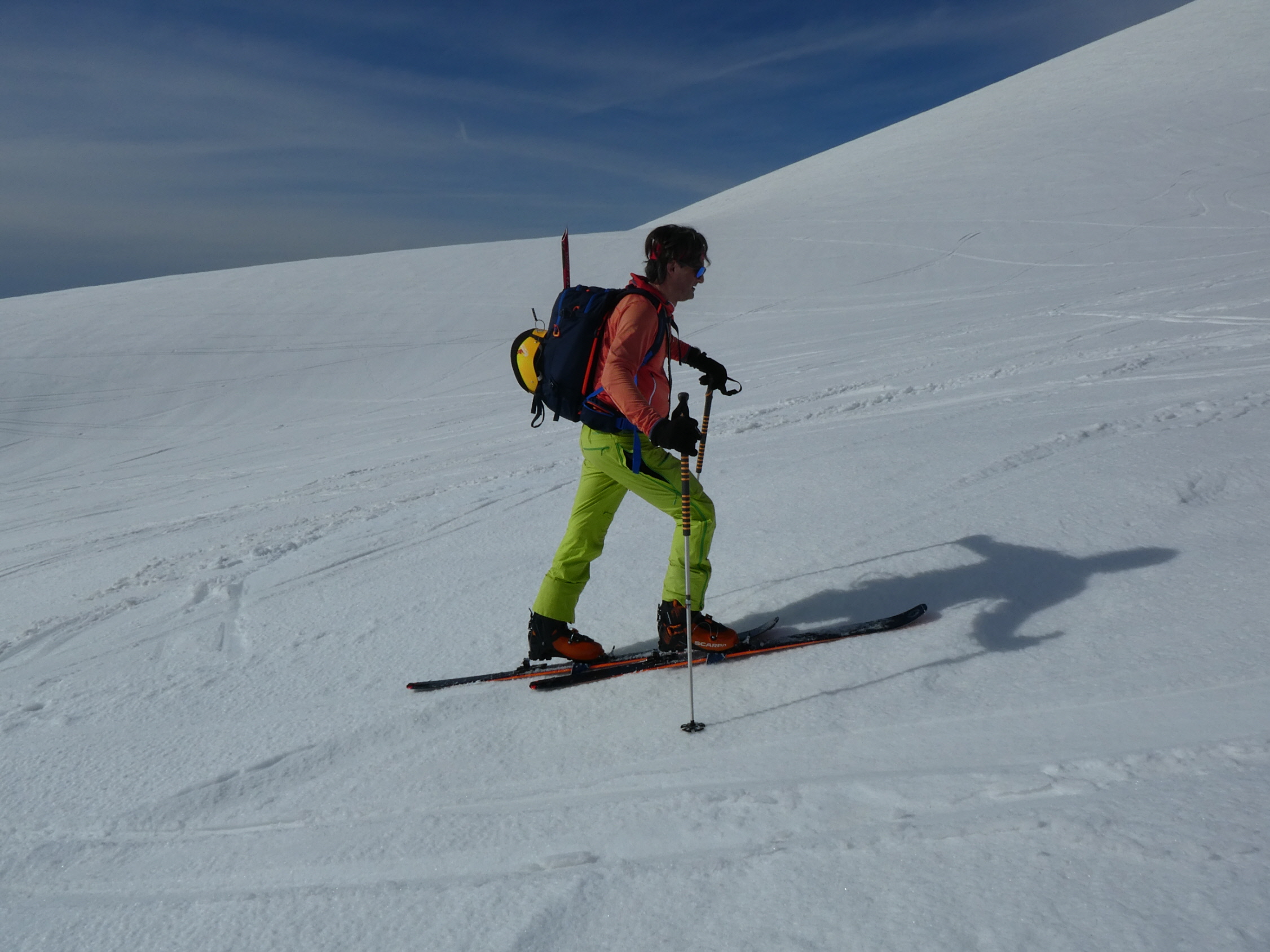 Diesem Umstand haben wir Rechnung getragen und unsere Schwungradien vergrößert. Der Schnee war auch hier perfekt, kompakter Untergrund mit einer wegspritzenden Firnschicht obendrauf. Mit abnehmender Höhe ist diese zudem immer schmieriger geworden. Das war ein wahrer Abfahrtsgenuss.