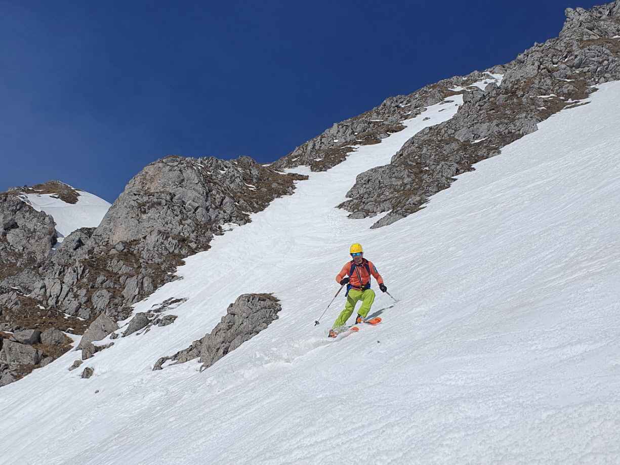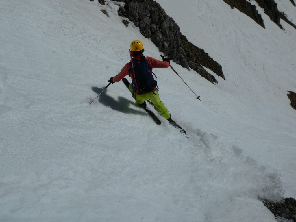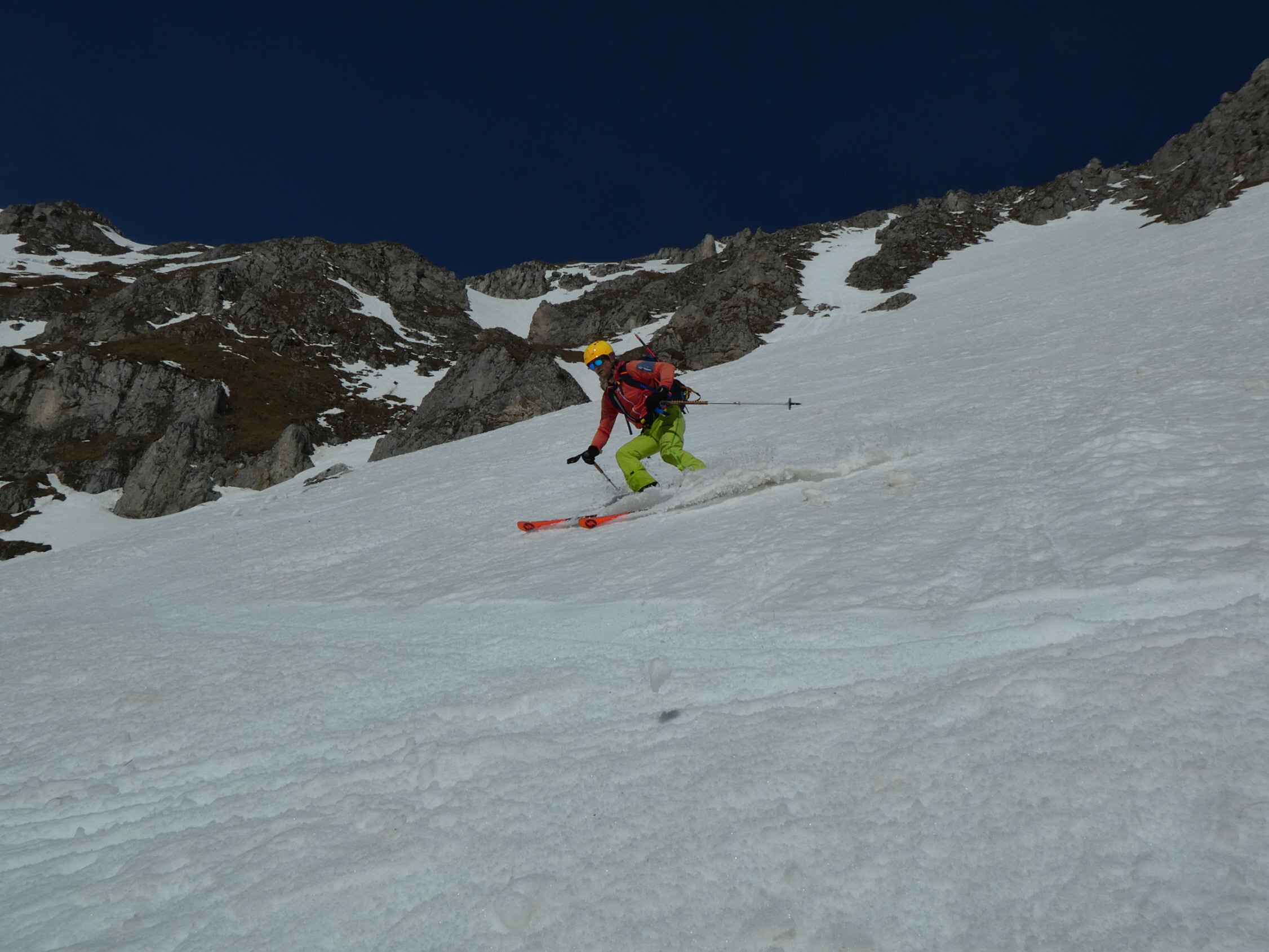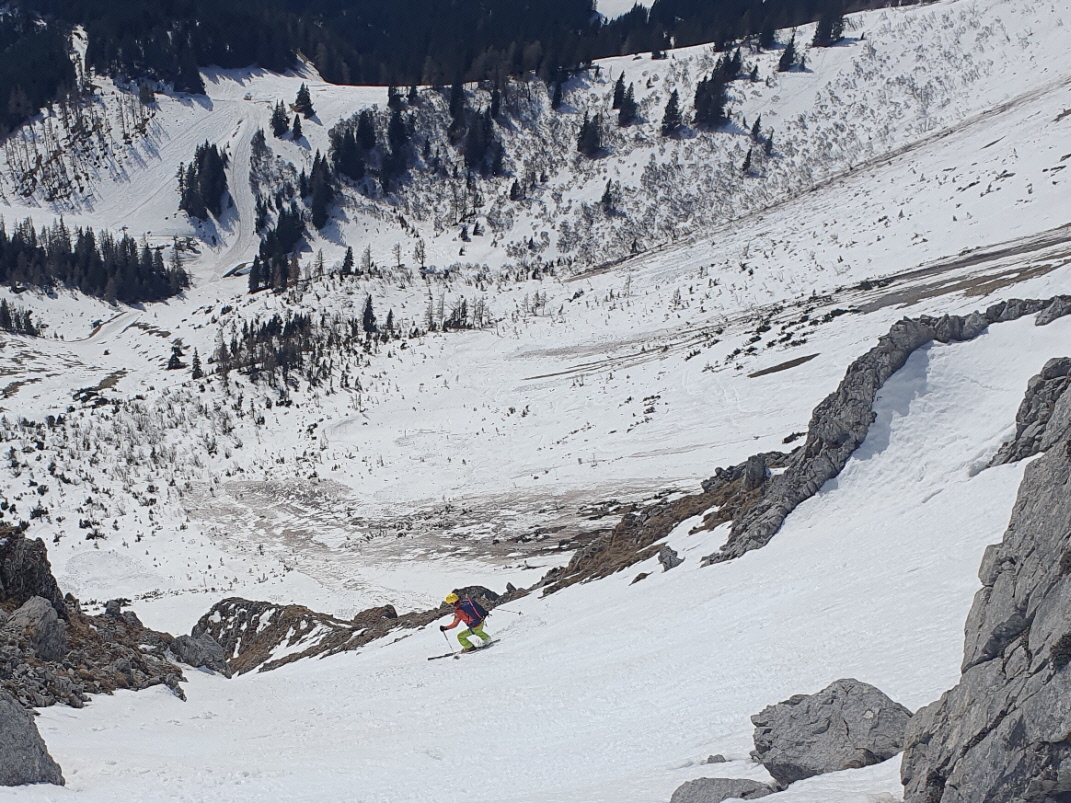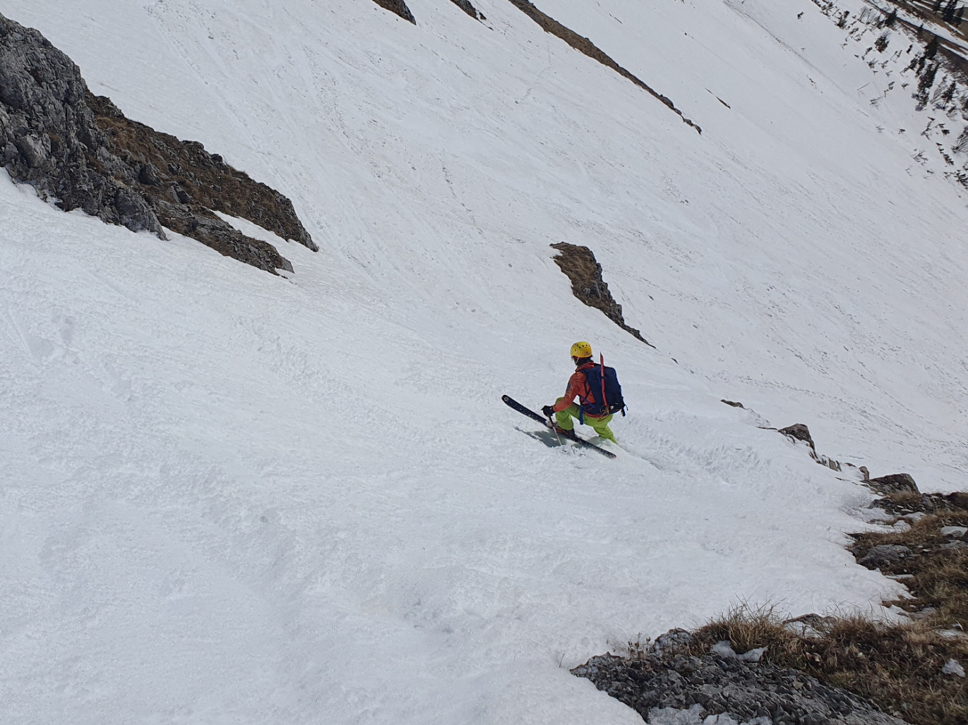 Vom ersten Meter an war die Steilrinne bestens fahrbar. Viel Platz zum weiten Schwingen gibt es darin aber nicht. Da bedarf es schon auch einiger Sprünge um rechtzeitig die Richtungsänderung vor dem Erreichen des felsigen Randes der Rinne zu schaffen. Unterhalb der Rinne weitet sich das Gelände wieder.