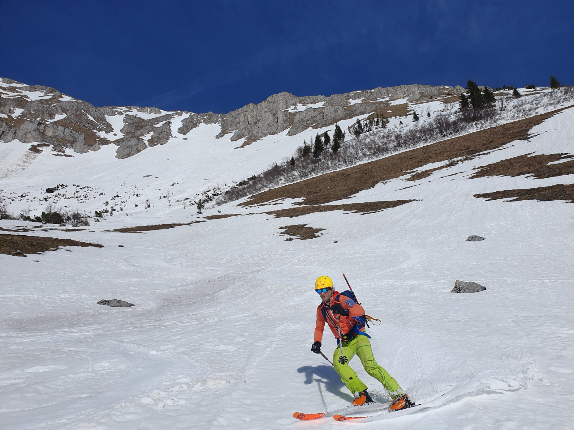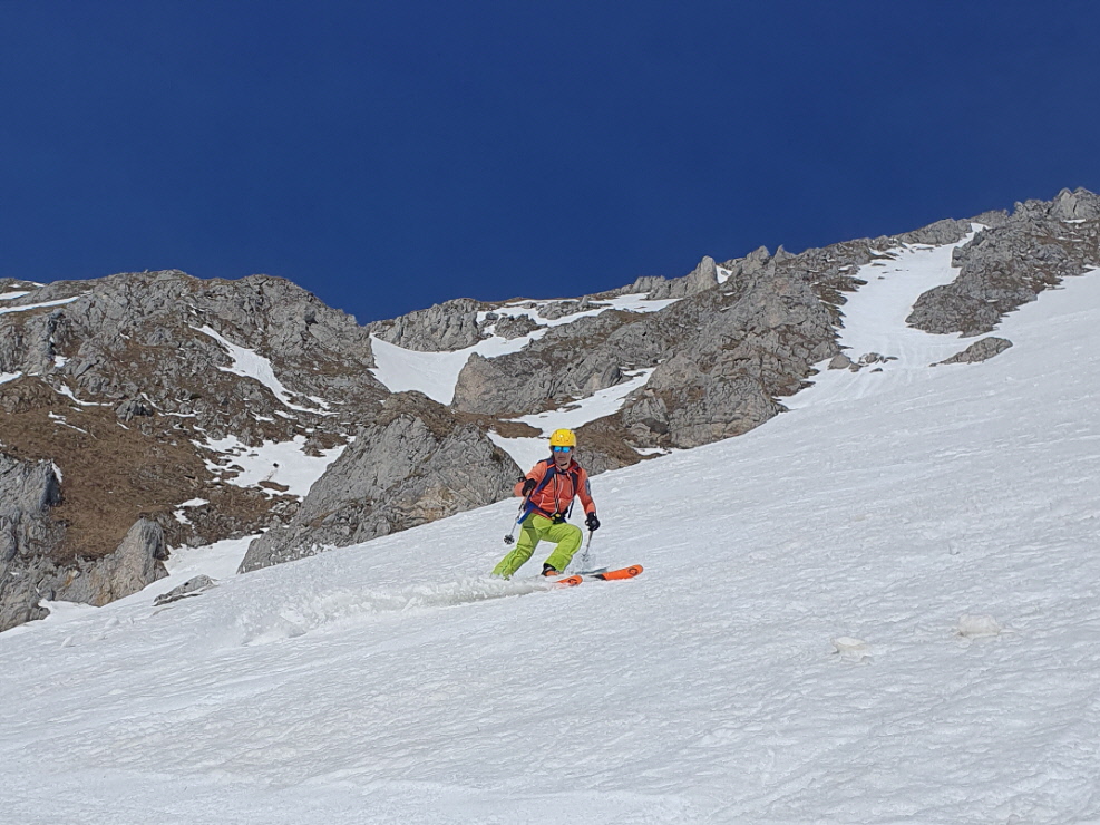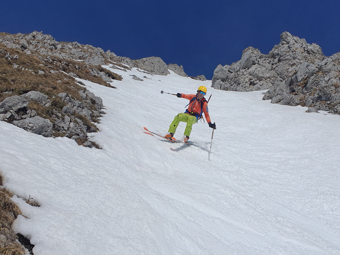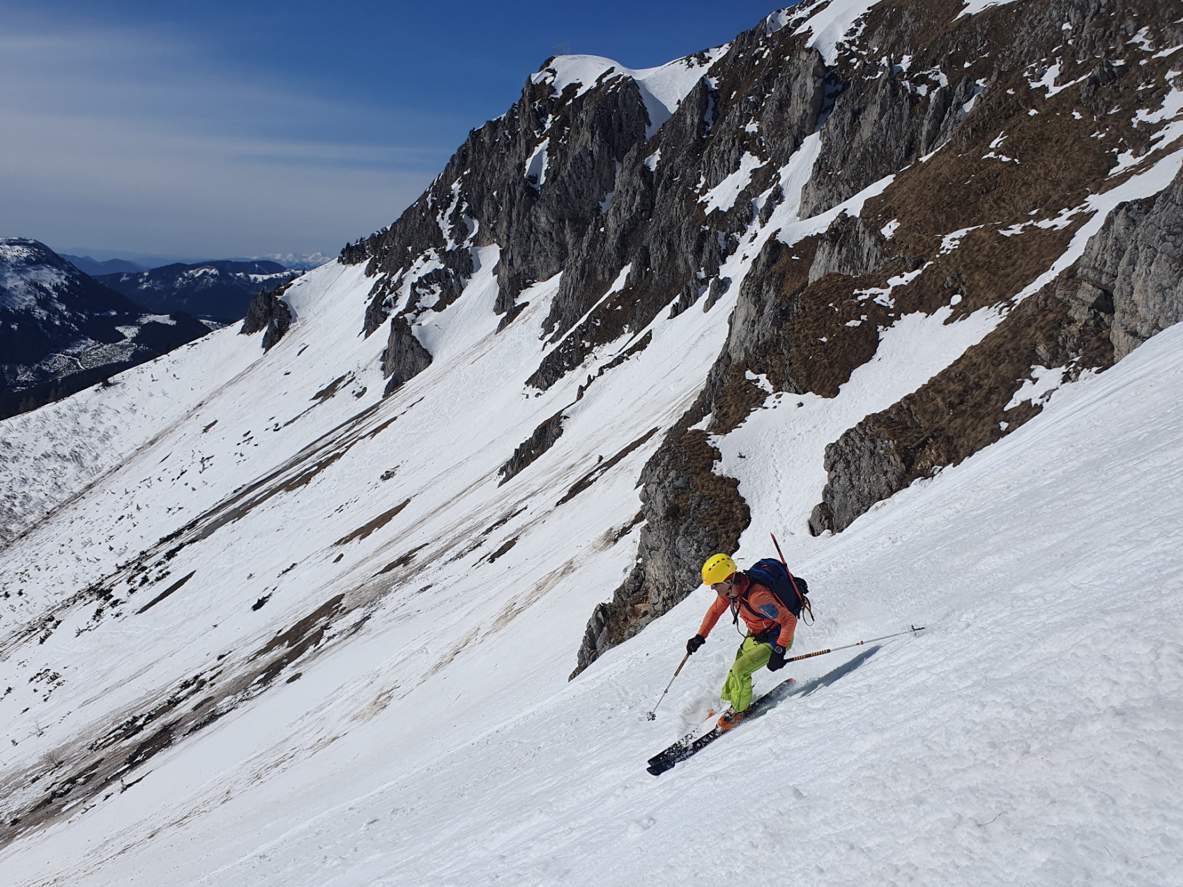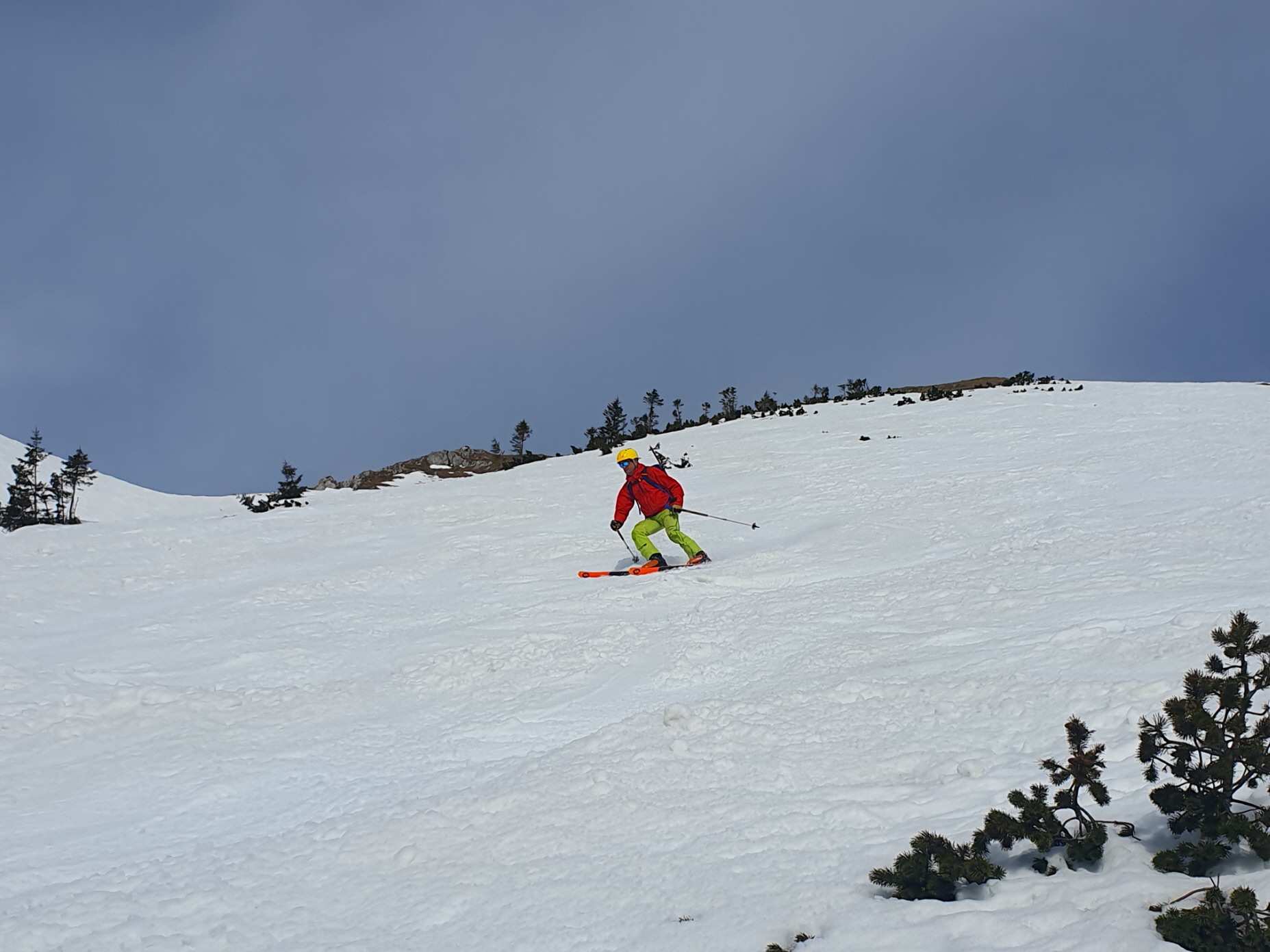 Vom ersten Meter an war die Steilrinne bestens fahrbar. Viel Platz zum weiten Schwingen gibt es darin aber nicht. Da bedarf es schon auch einiger Sprünge um rechtzeitig die Richtungsänderung vor dem Erreichen des felsigen Randes der Rinne zu schaffen. Unterhalb der Rinne weitet sich das Gelände wieder.