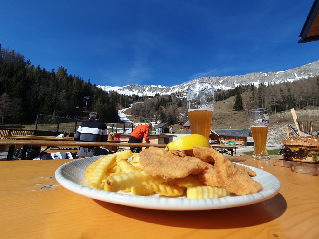 Weil der GH Scheikl montags Ruhetag hat, sind wir nach dem Umziehen und dem Verstauen der Ausrüstung bis zur nächsten Einkehrmöglichkeit gefahren. Auf der Sonnenterrasse sitzend haben wir dort noch einmal über das Schnitzel hinweg genussvoll zur Banane hinaufgeschaut. Die auch sonst vorhandene bananige Geschmacksnote des Weizenbiers hat bei dieser Aussicht gleich noch viel intensiver geschmeckt (oder es ist uns zumindest so vorgekommen 😊). Dass Andreas seinen Hunger schon wieder mit einem Almburger gestillt hat, wird der Heinrich beim genauen Hinschauen schon bemerkt haben. Zu seiner Beruhigung darf gesagt werden, dass laut Speisekarte das Fleisch darin jedenfalls vom heimischen Biorind stammt.