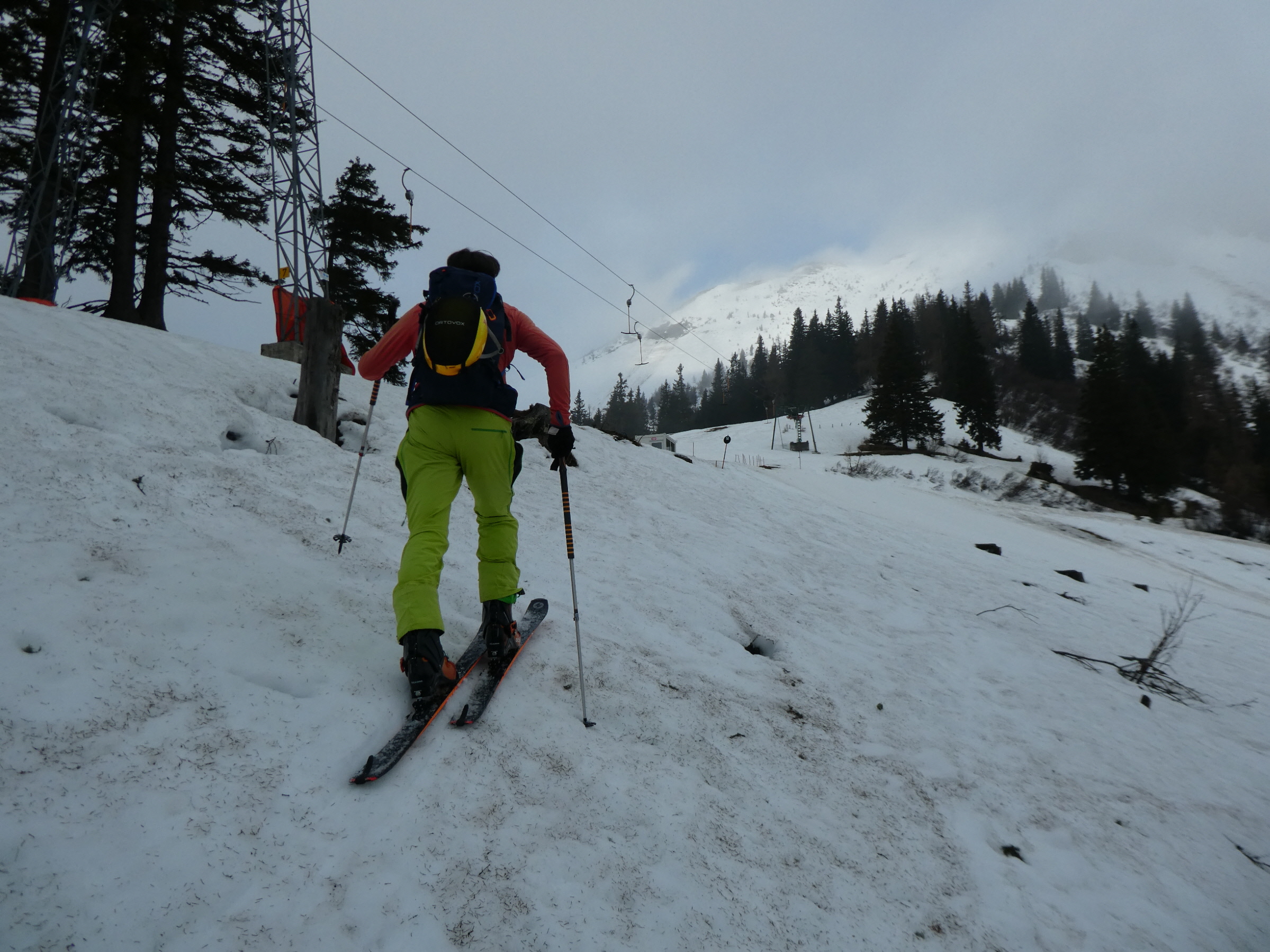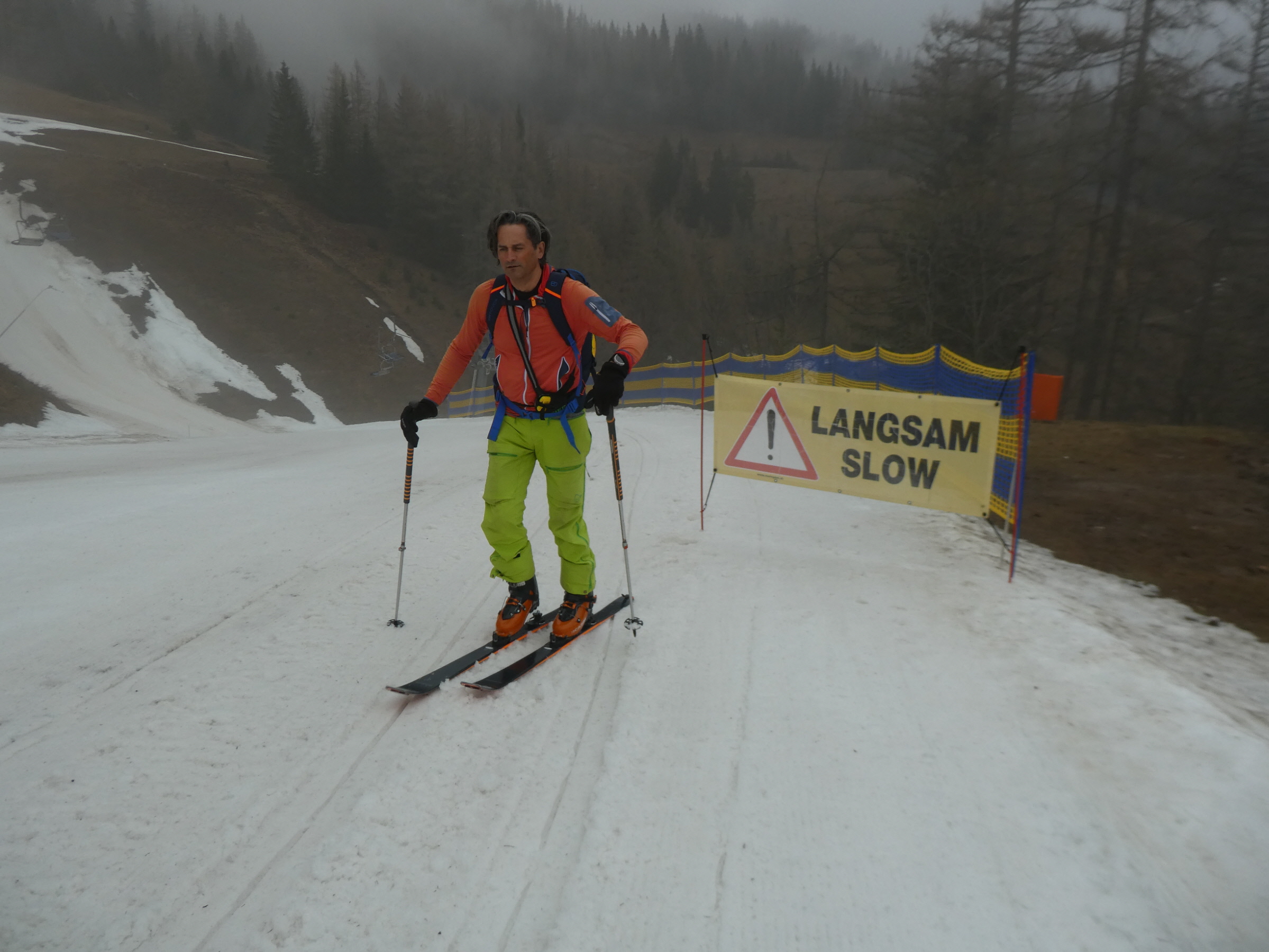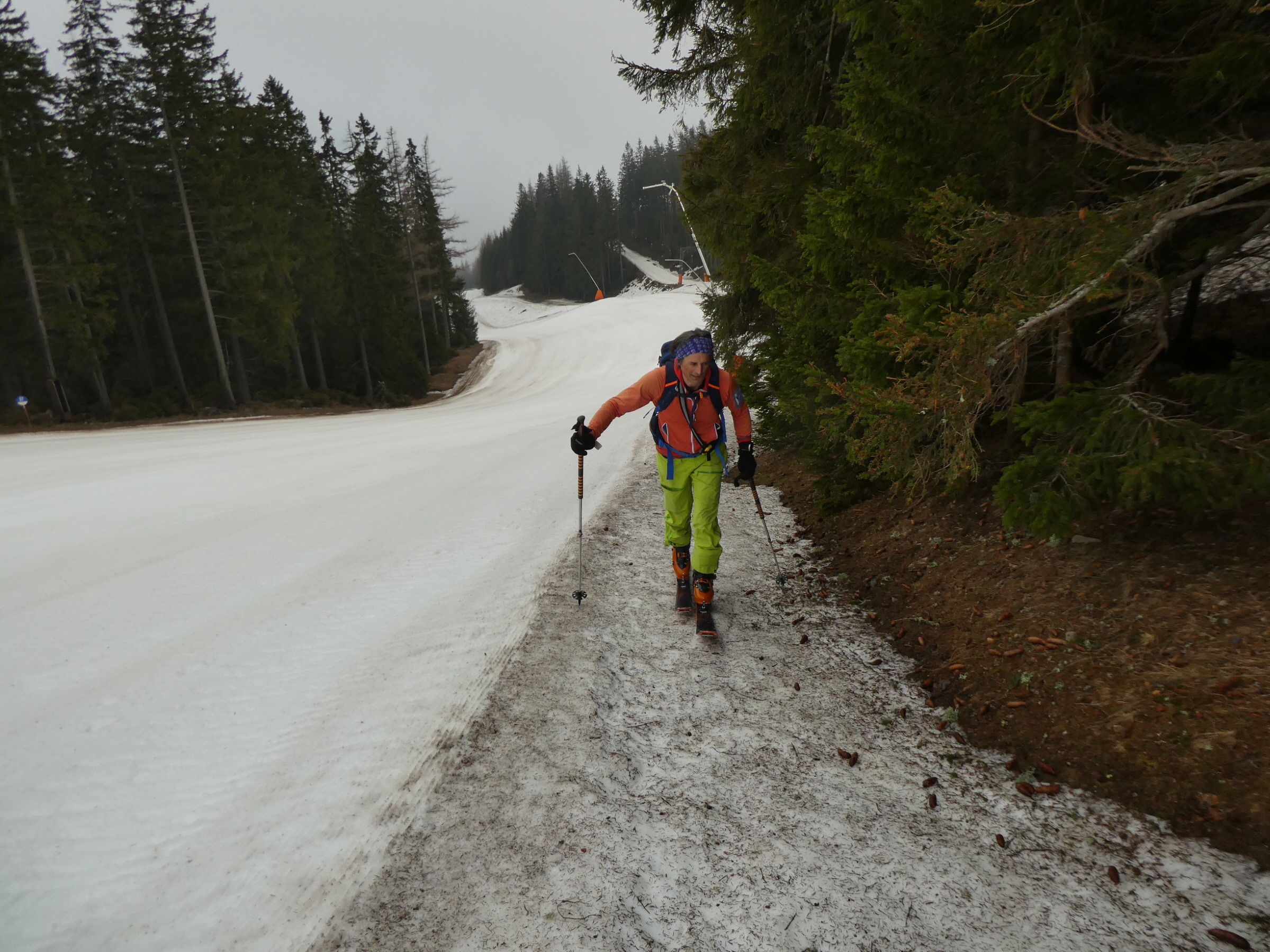 Weil der Ausaperungsprozess neben der Piste auch dort mittlerweile stark vorangeschritten ist, war ein Skianstieg auf den Sonnkogel entlang der ausgeschilderten Route nicht mehr möglich. Wir sind daher zuerst am Pistenrand und später über den Stockschlag bis zur Bergstation des Schlepplifts angestiegen. Dort hat erstmals die Sonne durchgeblitzt und die Hoffnung genährt, dass sich das Wetter zu unseren Gunsten positiv entwickeln könnte.