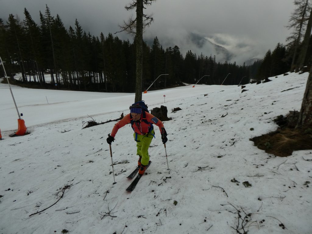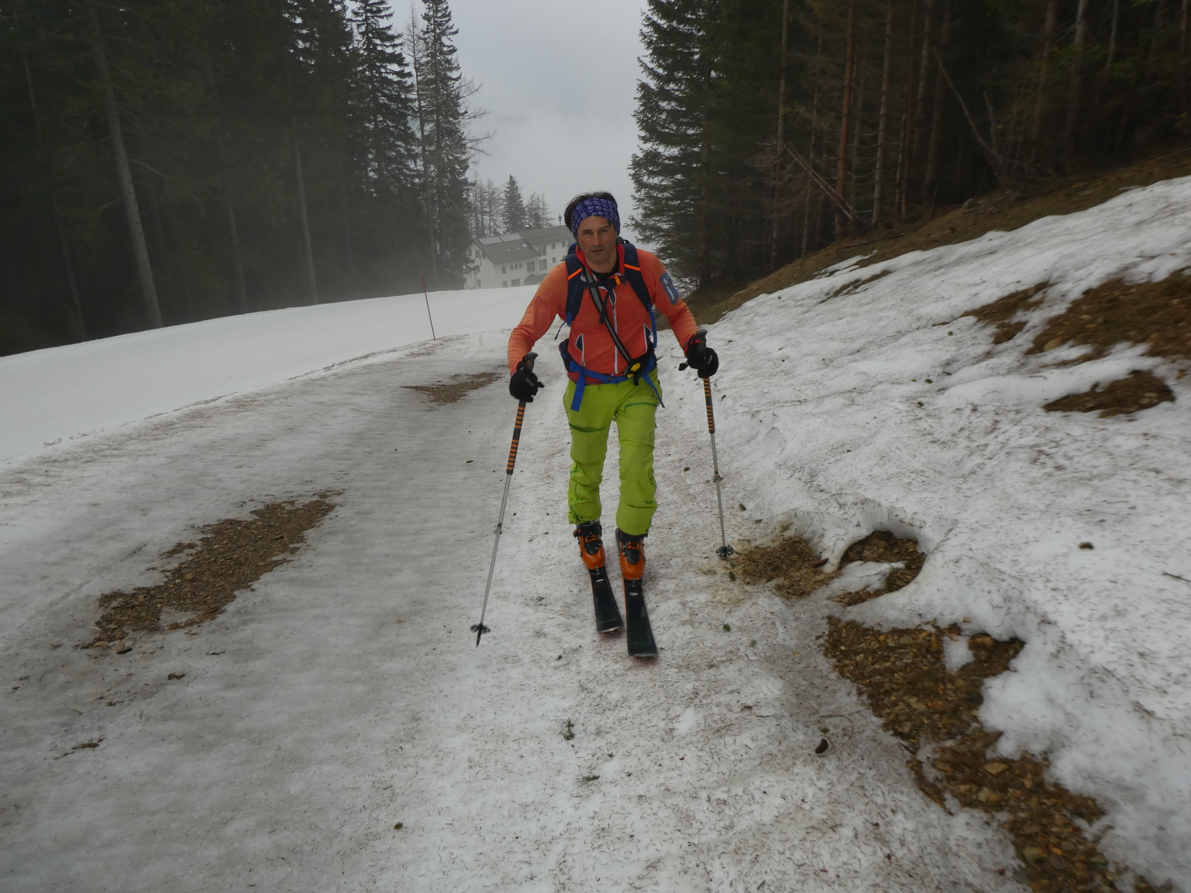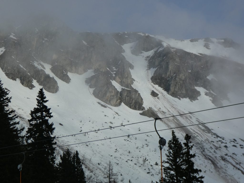 Weil der Ausaperungsprozess neben der Piste auch dort mittlerweile stark vorangeschritten ist, war ein Skianstieg auf den Sonnkogel entlang der ausgeschilderten Route nicht mehr möglich. Wir sind daher zuerst am Pistenrand und später über den Stockschlag bis zur Bergstation des Schlepplifts angestiegen. Dort hat erstmals die Sonne durchgeblitzt und die Hoffnung genährt, dass sich das Wetter zu unseren Gunsten positiv entwickeln könnte.