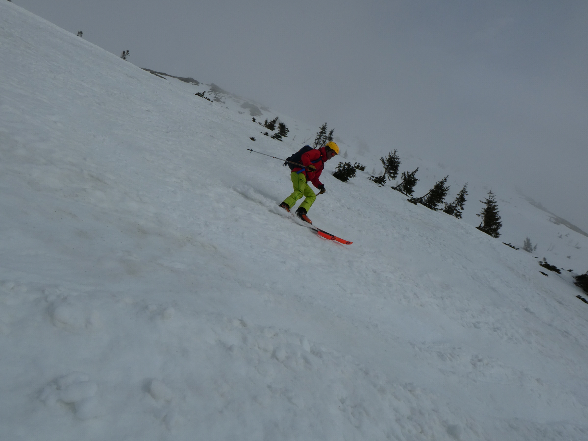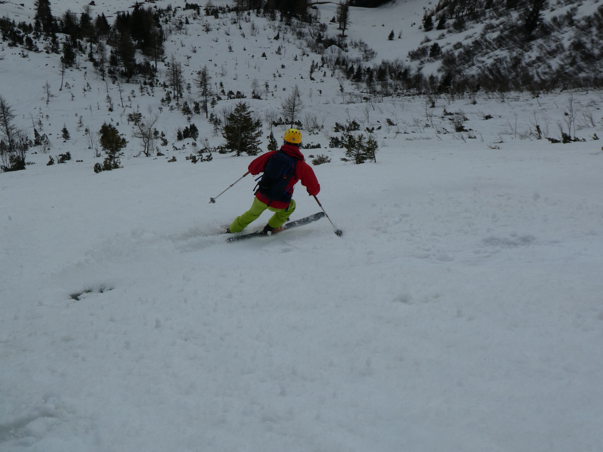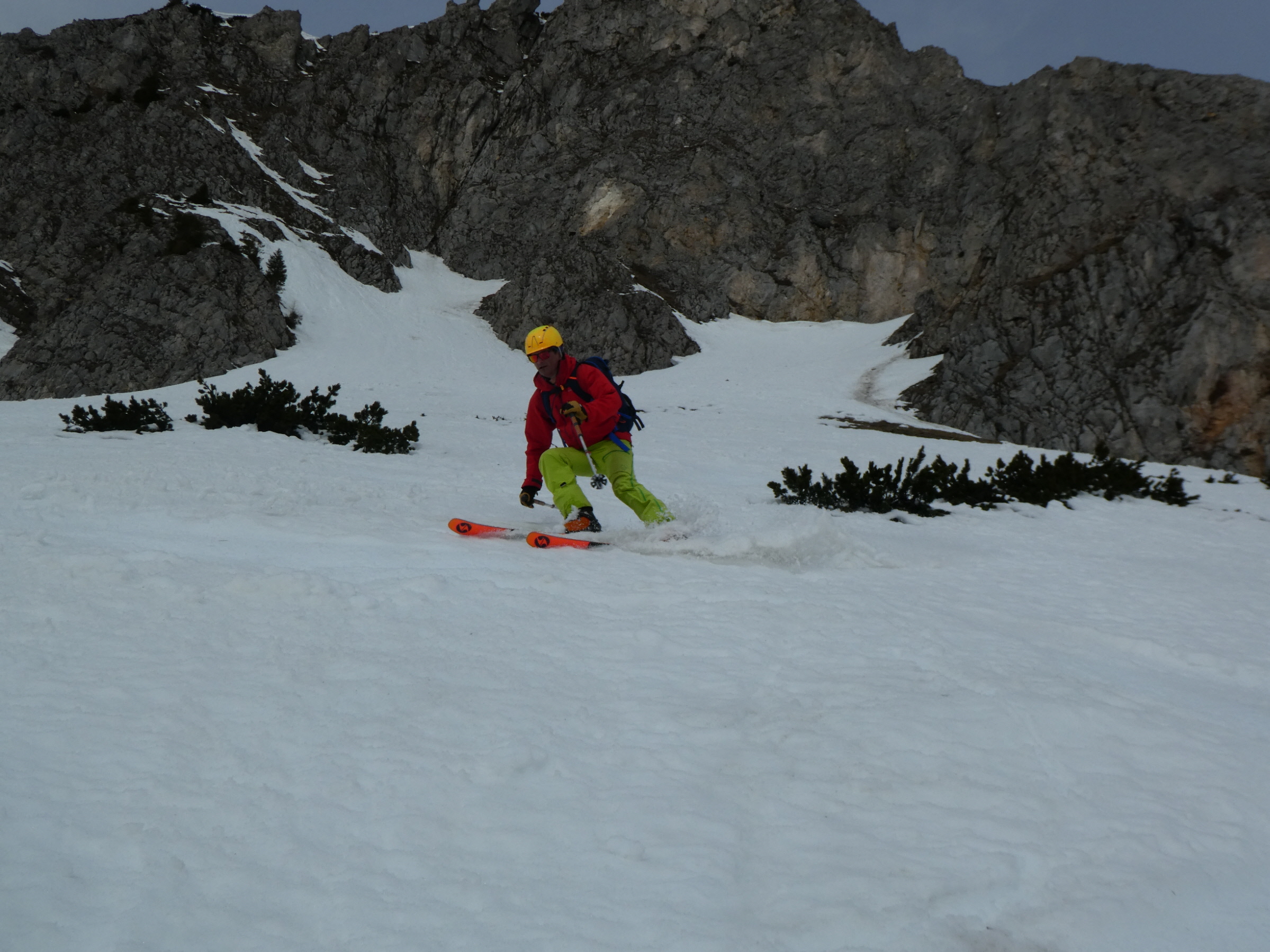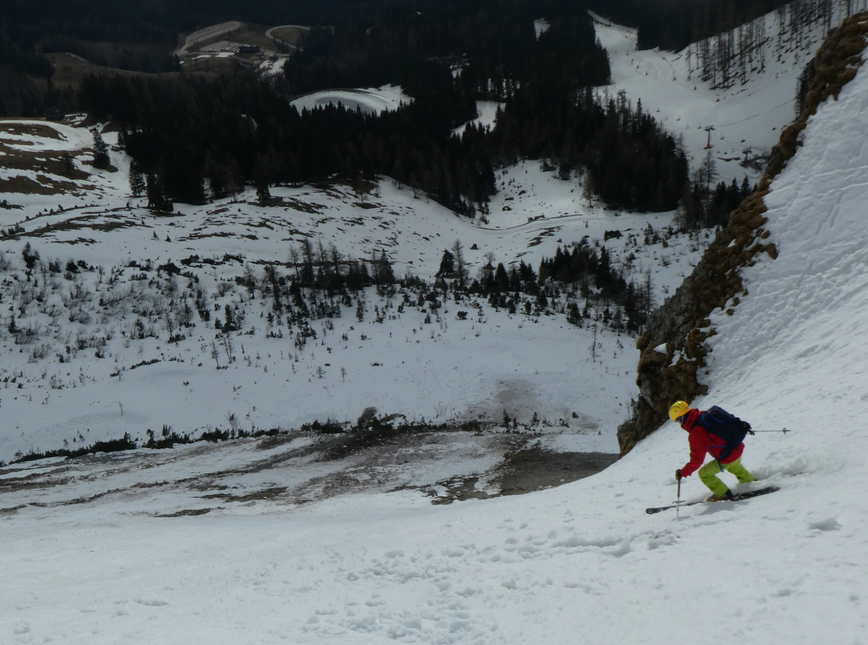 Nach der Ausfahrt aus der Rinne war dann Platz für längere Schwünge. Der etwas glatte Untergrund in der dort verlaufenden Lawinenbahn hat aber das Abfahrtstempo vorweg noch etwas eingebremst. Über ein schmales Schneeband haben wir unterhalb der Felsen nach rechts gequert und sind anschließend in flotter Fahrt über sehr kompakten Schnee weiter in Richtung Skigebiet abgefahren.