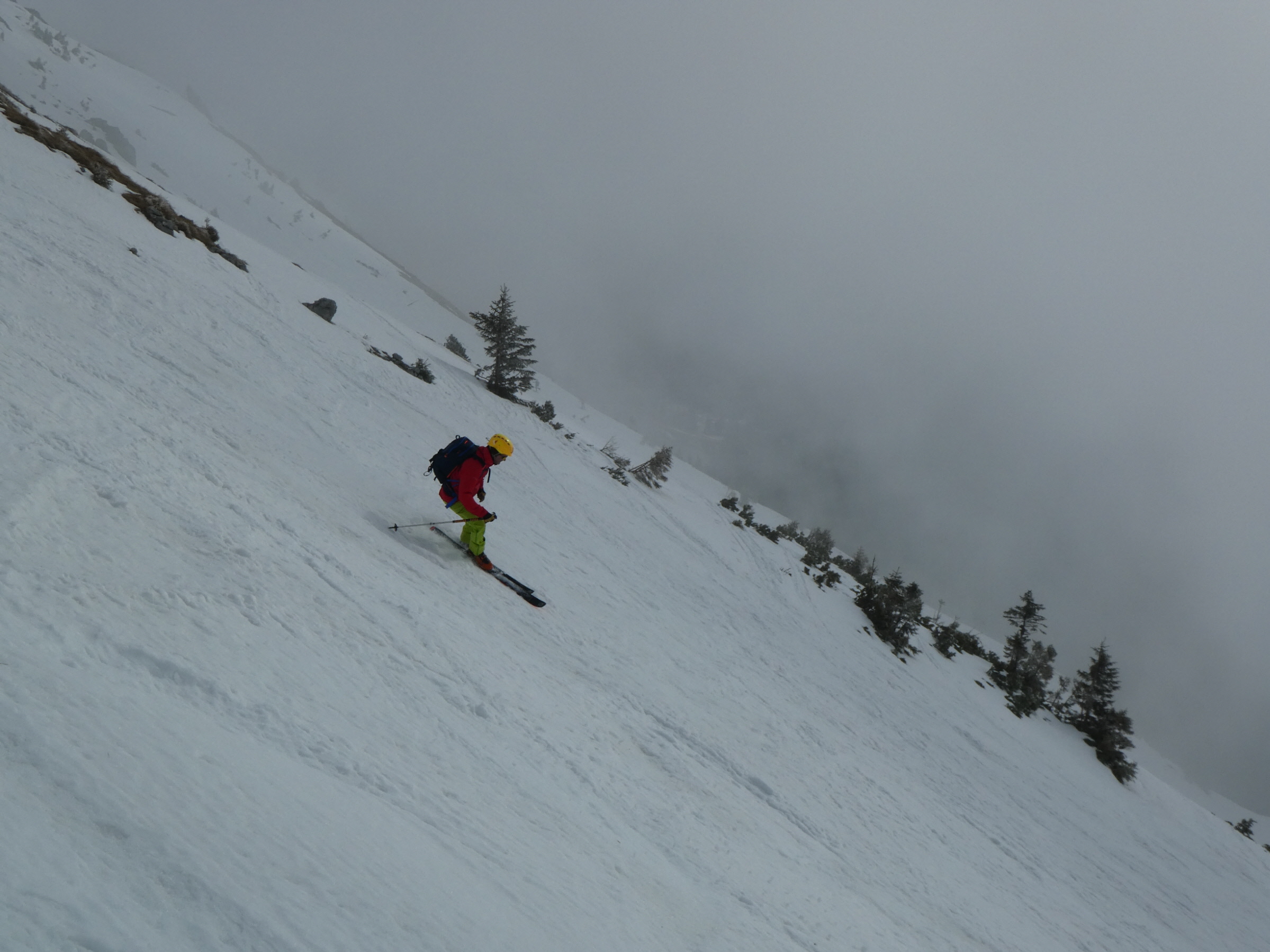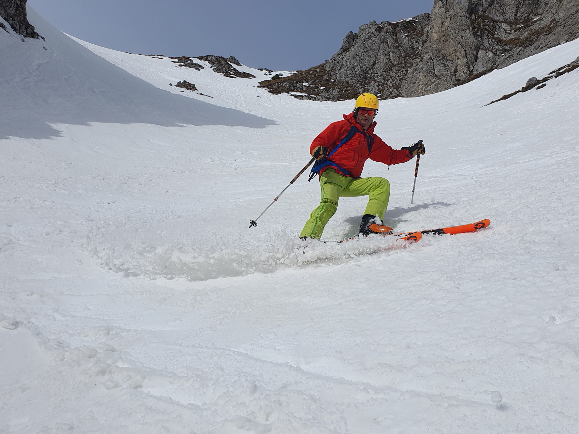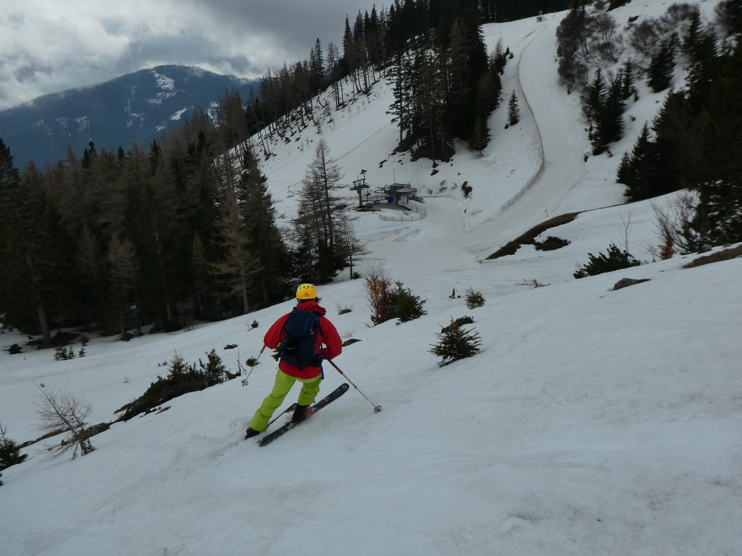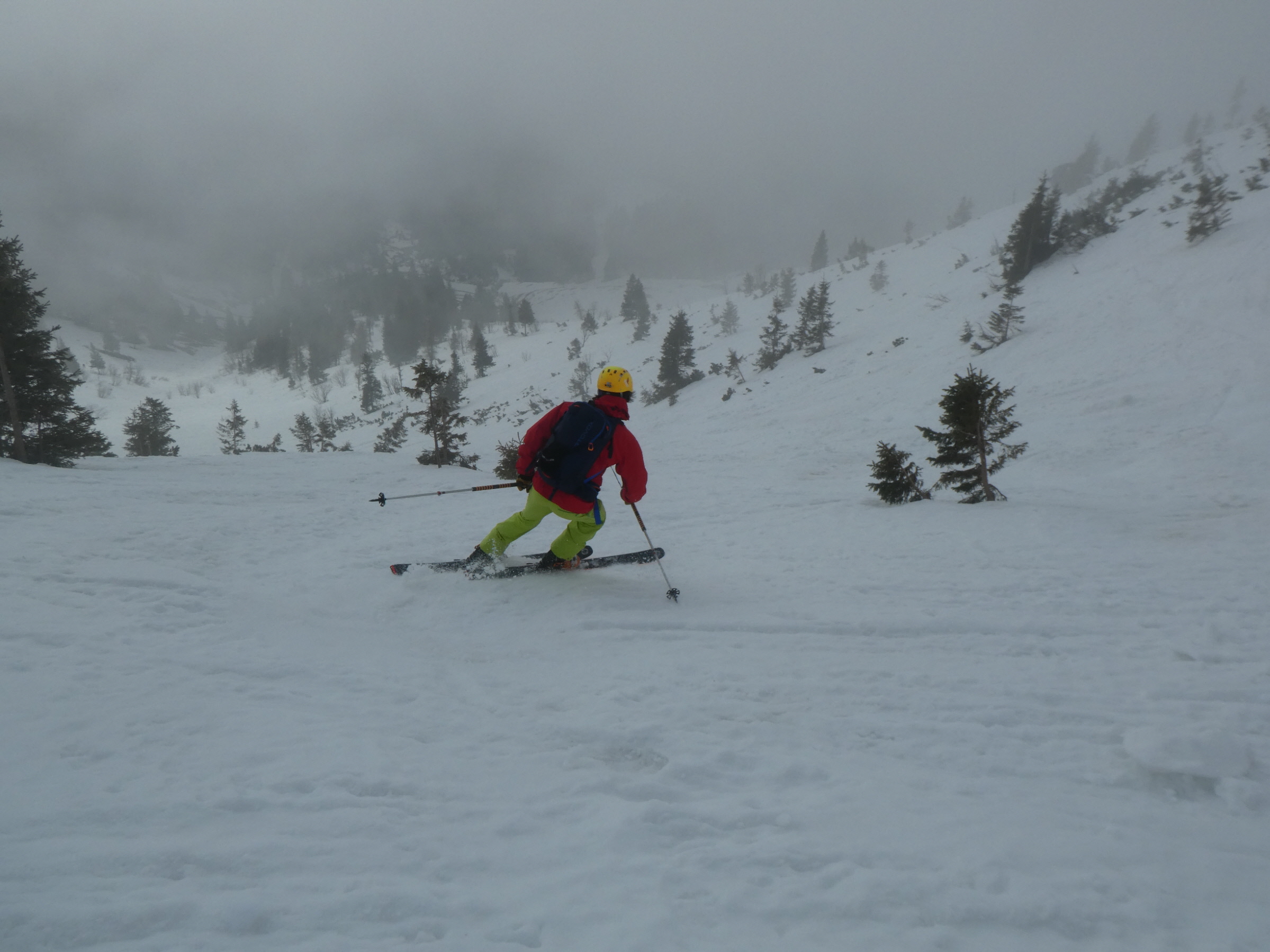Nach der Ausfahrt aus der Rinne war dann Platz für längere Schwünge. Der etwas glatte Untergrund in der dort verlaufenden Lawinenbahn hat aber das Abfahrtstempo vorweg noch etwas eingebremst. Über ein schmales Schneeband haben wir unterhalb der Felsen nach rechts gequert und sind anschließend in flotter Fahrt über sehr kompakten Schnee weiter in Richtung Skigebiet abgefahren.