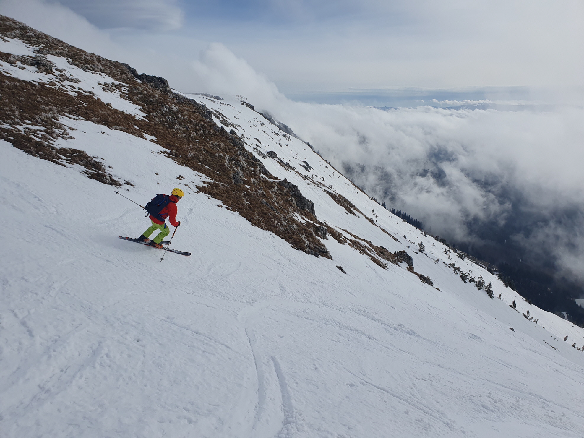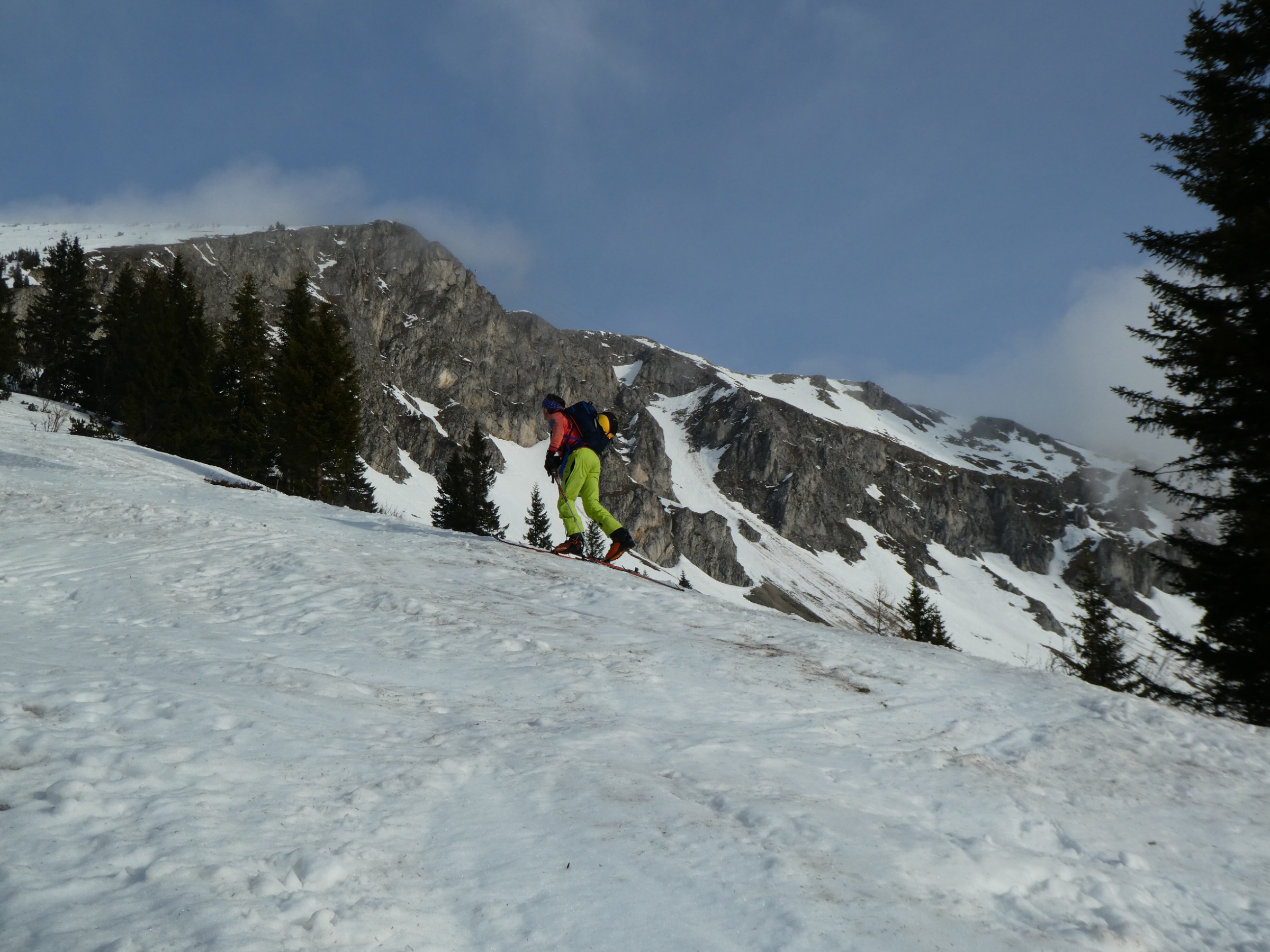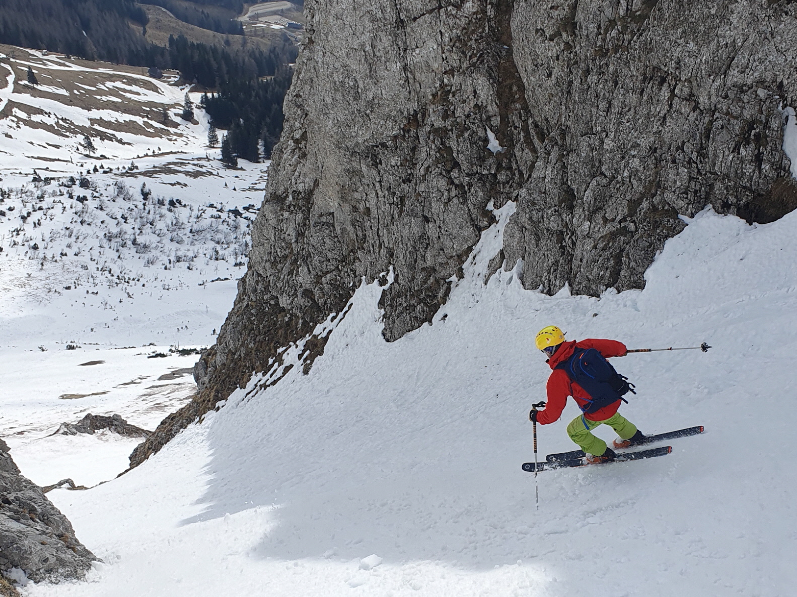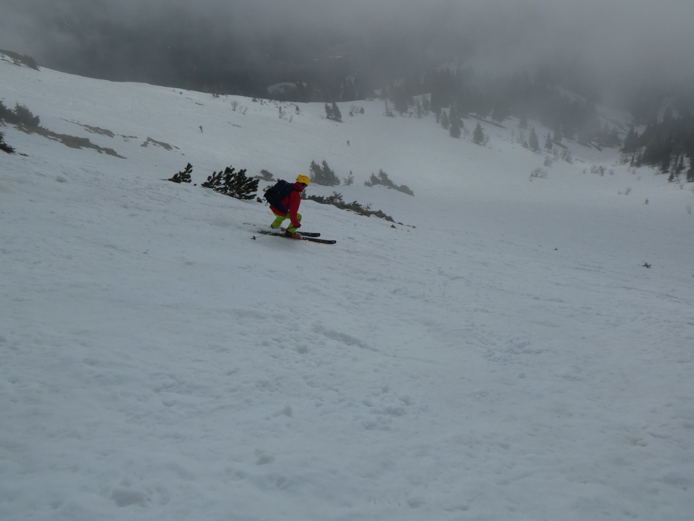 Nach der Ausfahrt aus der Rinne war dann Platz für längere Schwünge. Der etwas glatte Untergrund in der dort verlaufenden Lawinenbahn hat aber das Abfahrtstempo vorweg noch etwas eingebremst. Über ein schmales Schneeband haben wir unterhalb der Felsen nach rechts gequert und sind anschließend in flotter Fahrt über sehr kompakten Schnee weiter in Richtung Skigebiet abgefahren.