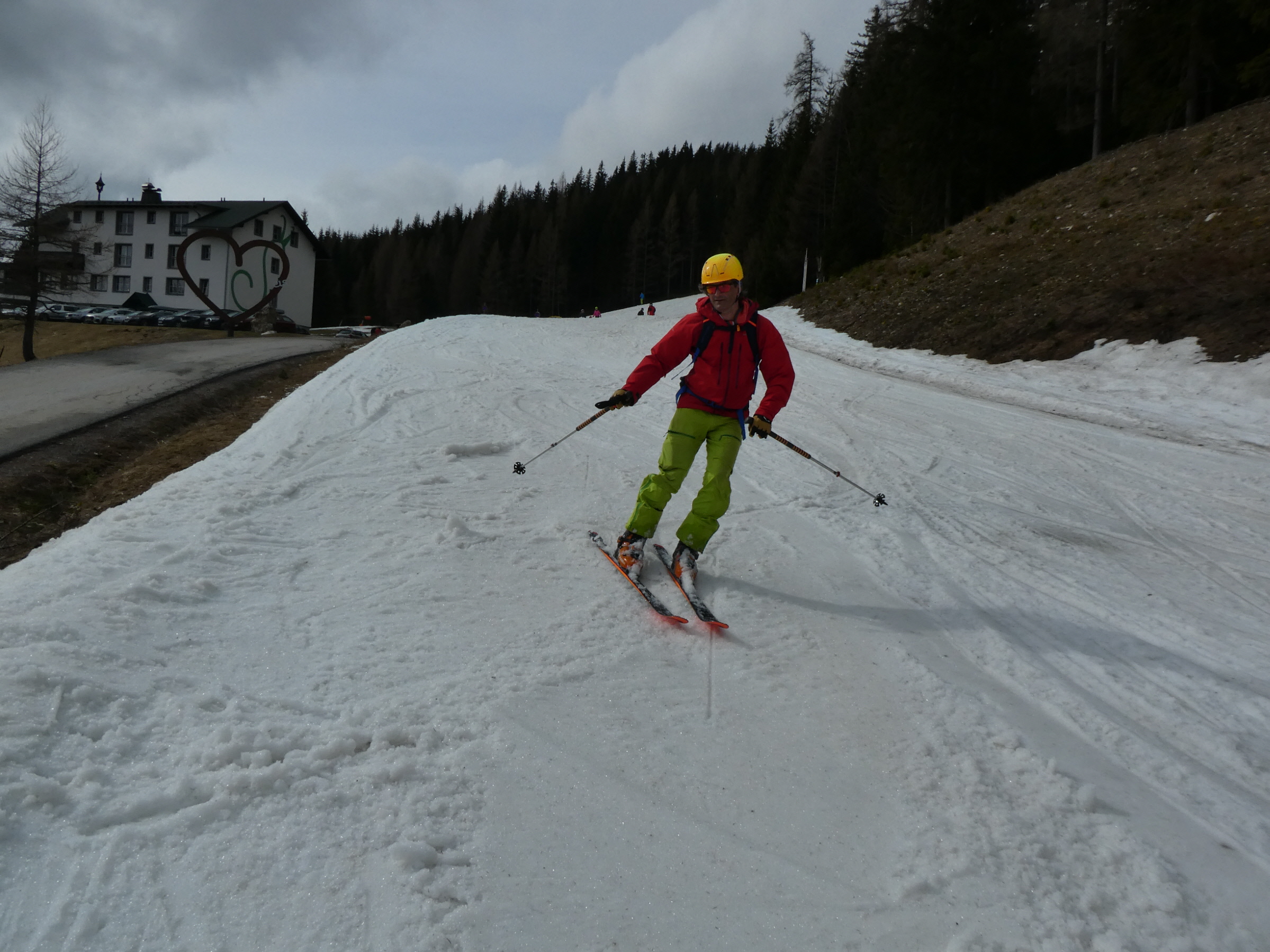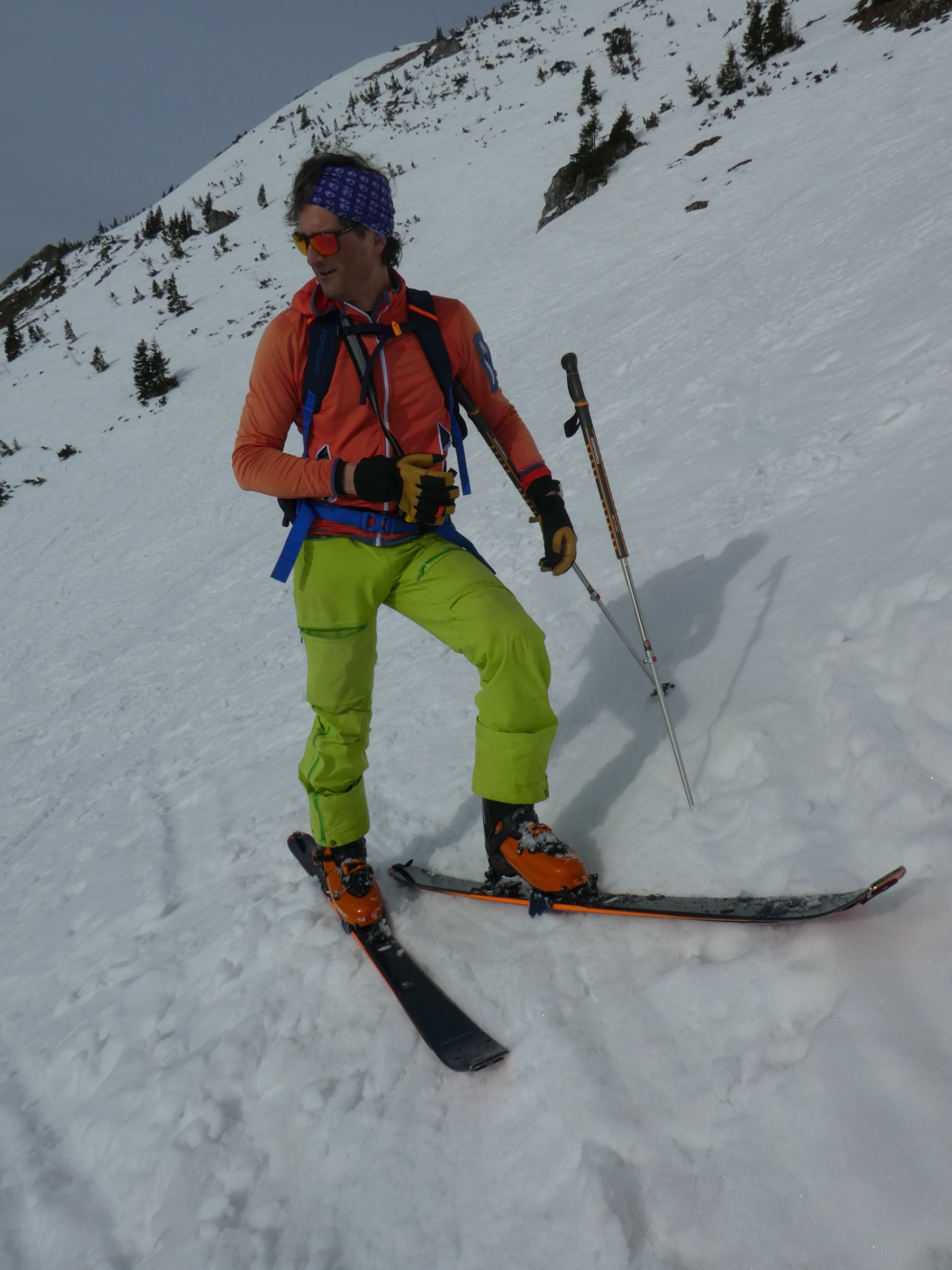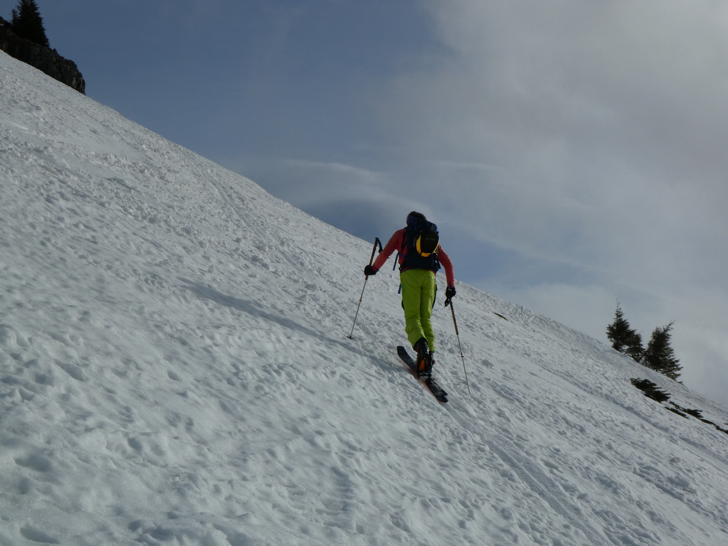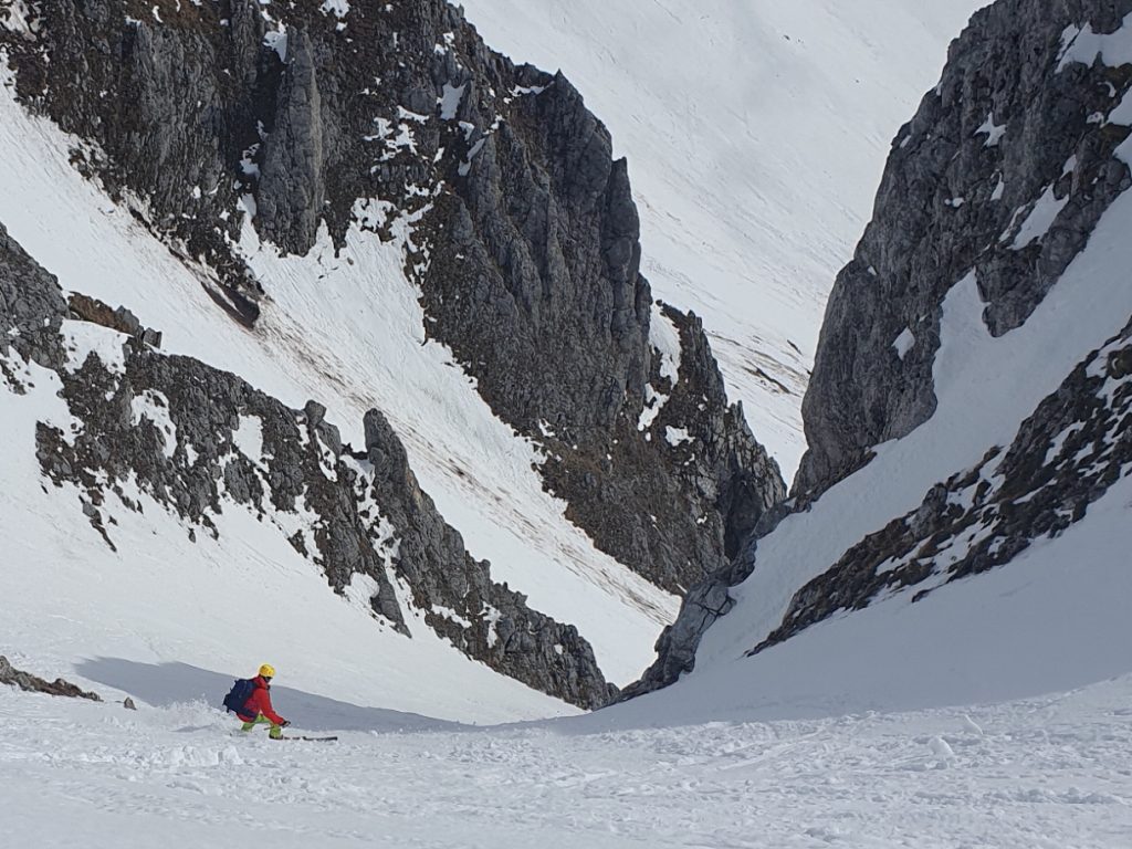 Nach der Ausfahrt aus der Rinne war dann Platz für längere Schwünge. Der etwas glatte Untergrund in der dort verlaufenden Lawinenbahn hat aber das Abfahrtstempo vorweg noch etwas eingebremst. Über ein schmales Schneeband haben wir unterhalb der Felsen nach rechts gequert und sind anschließend in flotter Fahrt über sehr kompakten Schnee weiter in Richtung Skigebiet abgefahren.