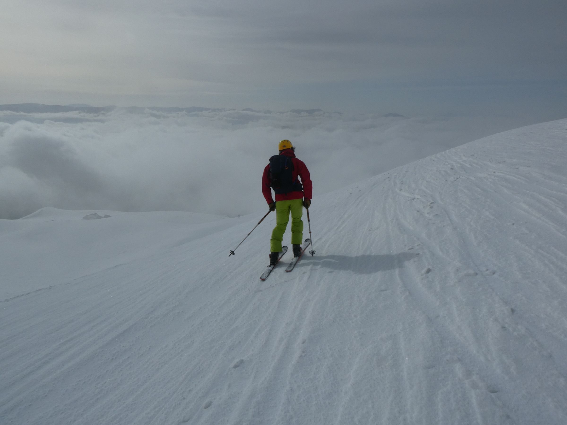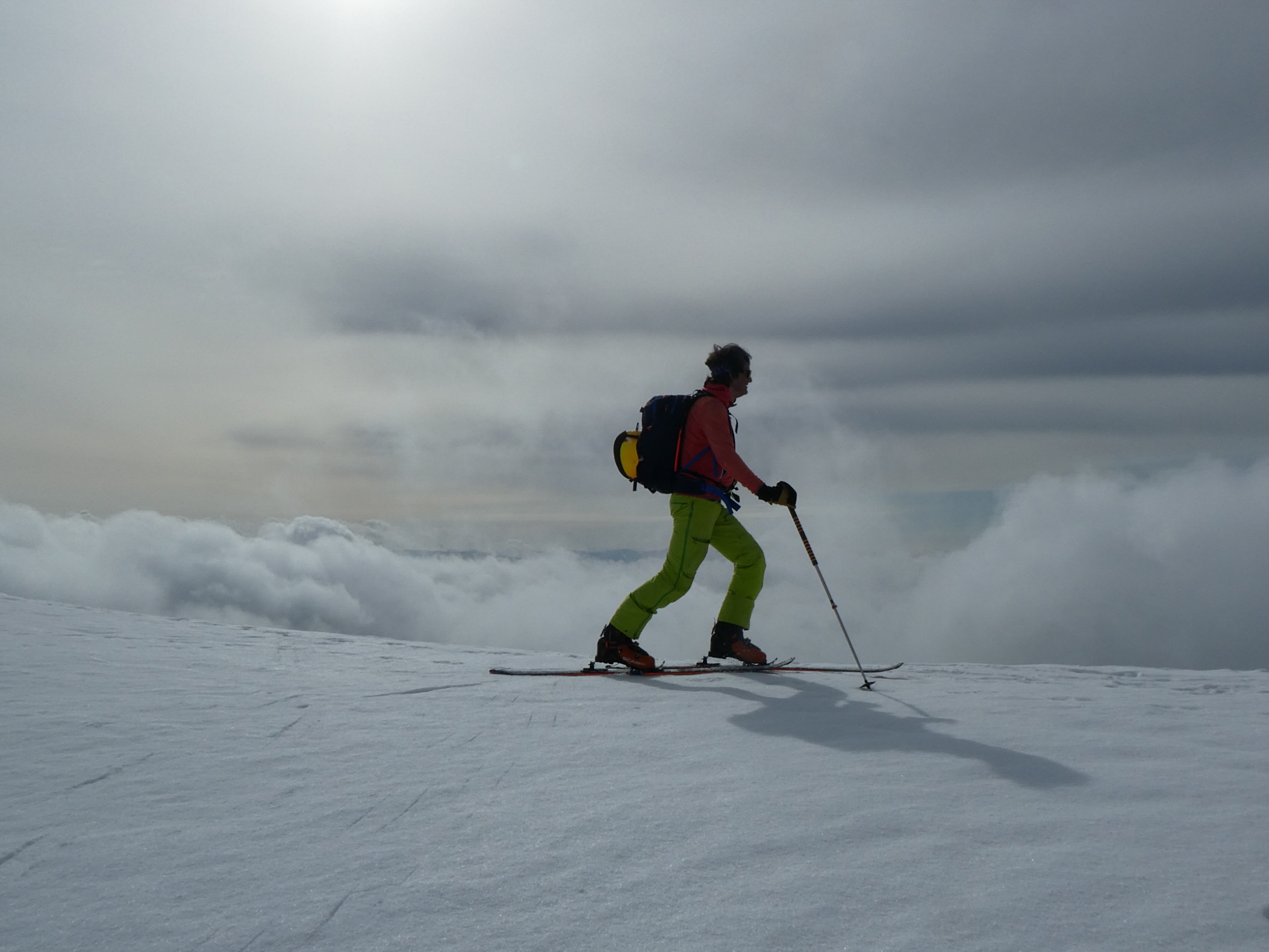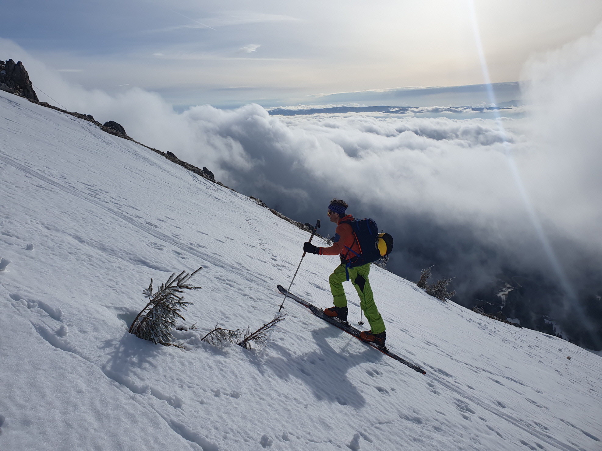 Oberhalb der Baumgrenze haben wir die Harscheisen montiert und sind weiter angestiegen. Die Wolkenstimmungen auf gleicher Höhe bzw. unter uns haben den einen oder anderen kurzen Fotostopp eingefordert. Auf der Hochfläche angekommen sind wir ein paar Meter hinuntergerutscht und haben vom oberen Rand aus die Verhältnisse im Hundsschupfenloch ausgelotet. Die Schneedecke war zu diesem Zeitpunkt wegen unseres frühen Starts und wegen der zwischendurch abgeschirmten Einstrahlung noch etwas zu hart.