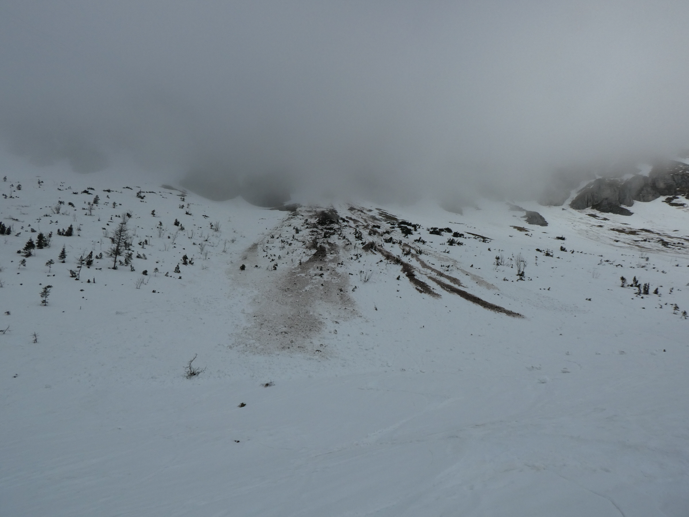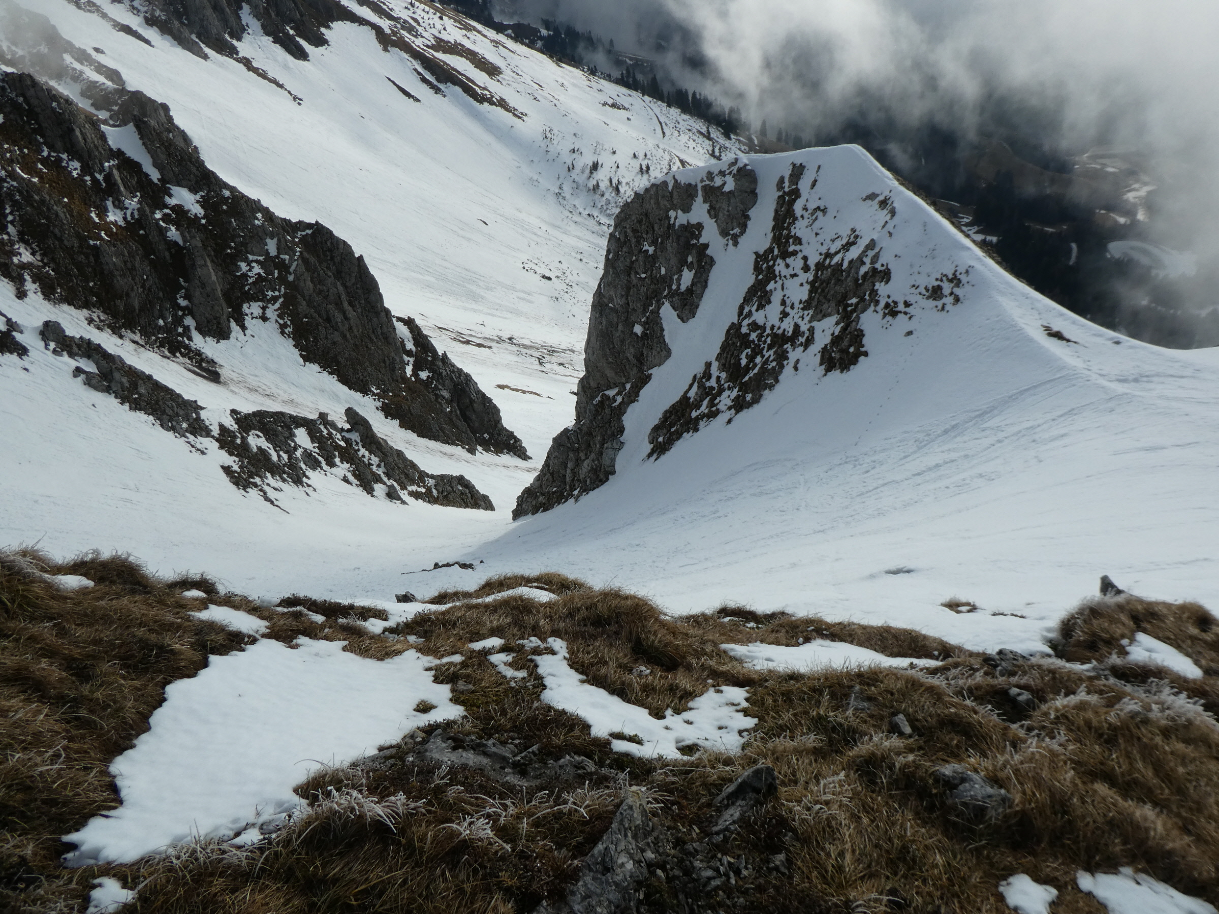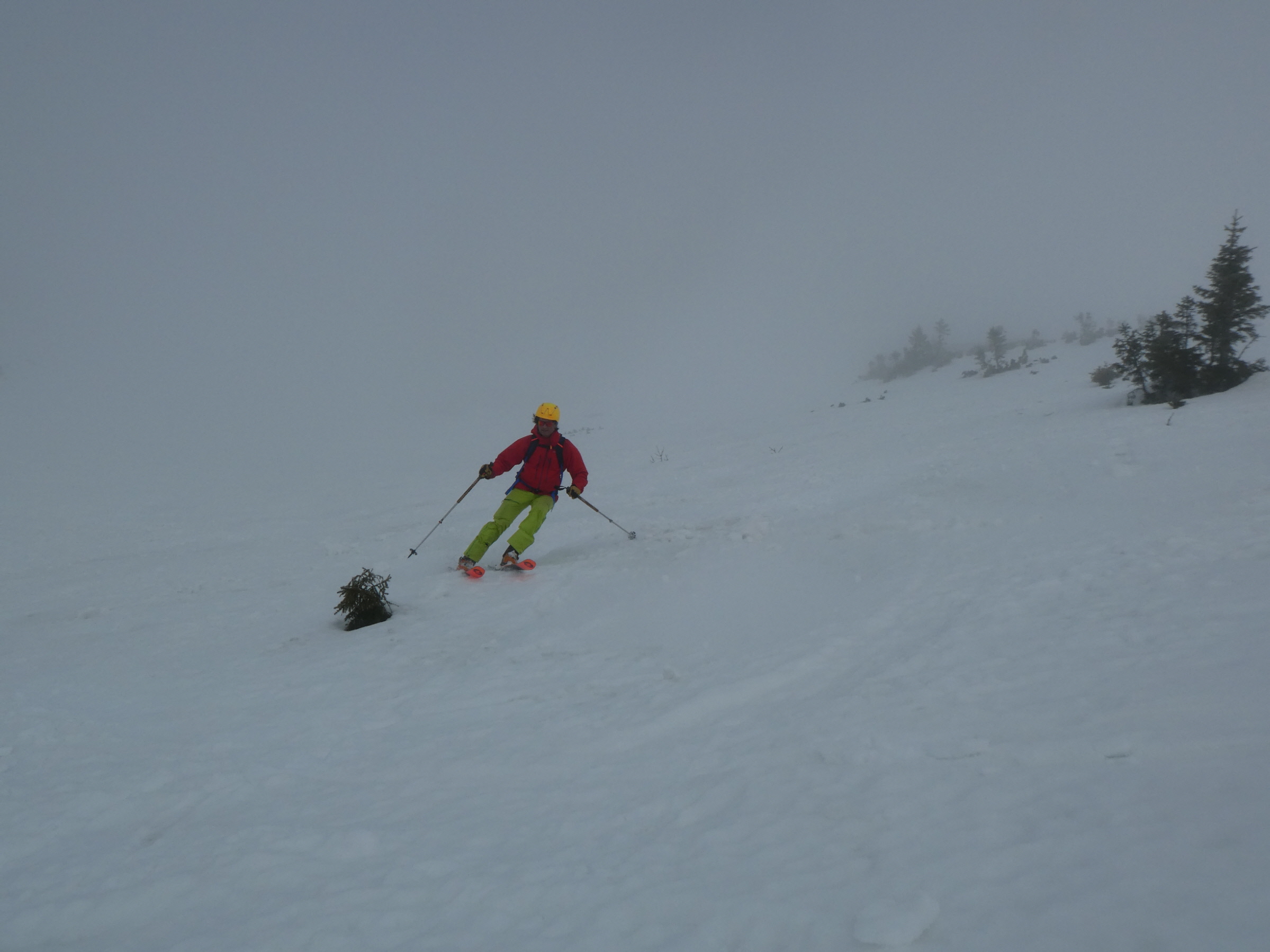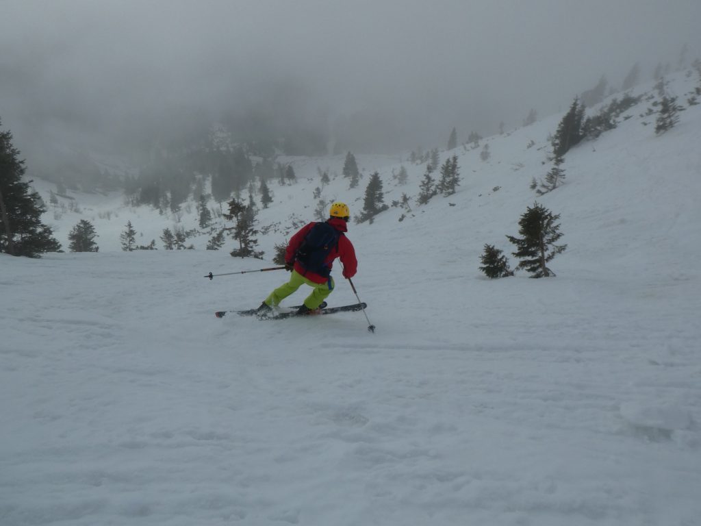 Am Weg dorthin hat es auf der Hochfläche eher wieder zugezogen. Auch in der ruppigen Rinne war die Sicht nicht optimal, der Schnee zwischen den beiden Rinnen aber besser, weil nicht so zerfahren. Daher sind wir dort in der Falllinie abgefahren und haben unterhalb der Rinnen mit einer Querfahrt nach links die erste Abfahrt mit dem Erreichen der Aufstiegsspur beendet.