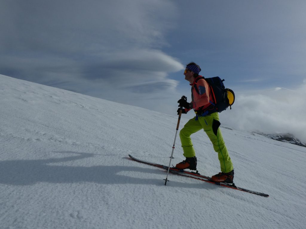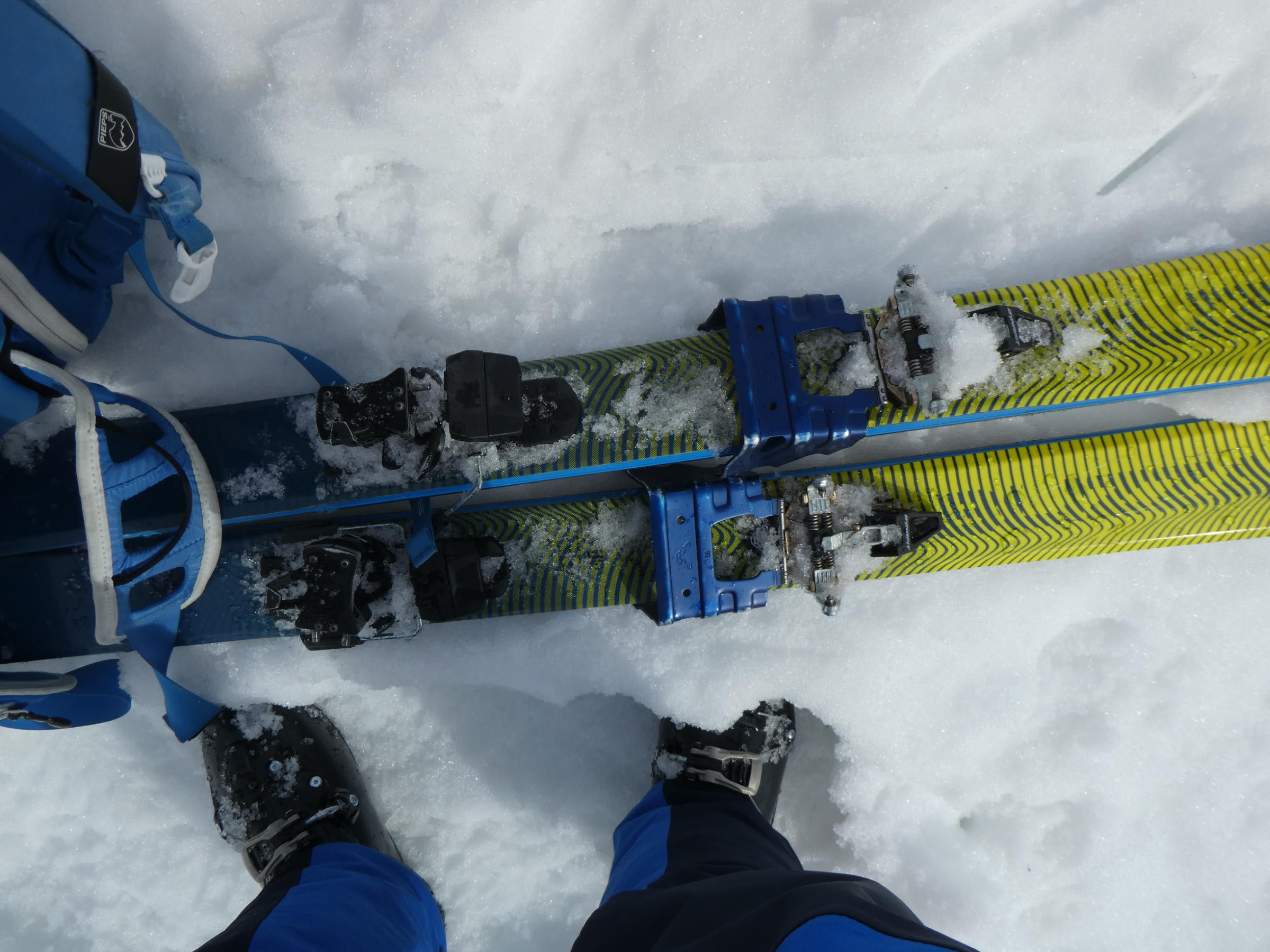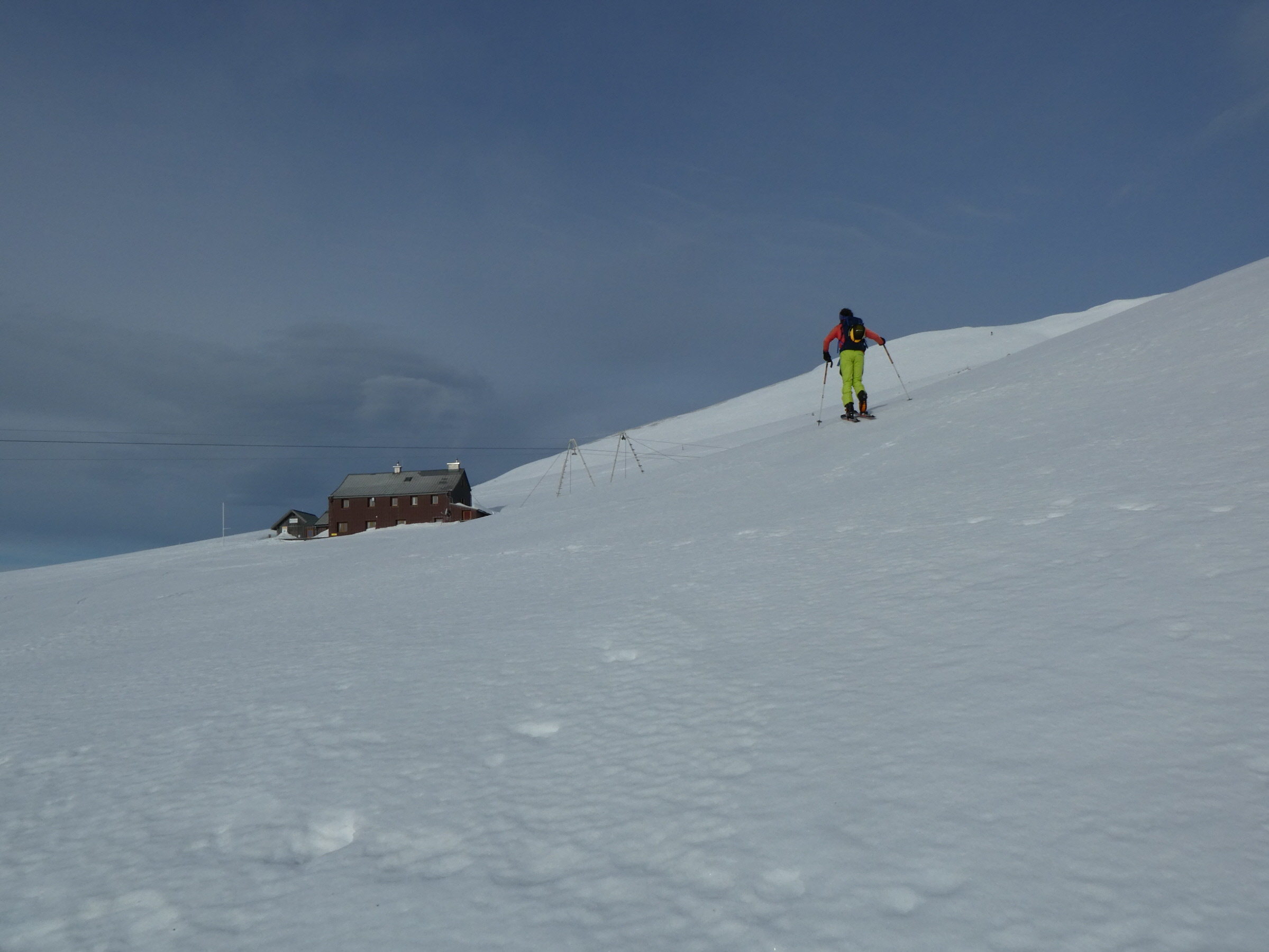 Die Felle kamen wieder drauf, ebenso die Harscheisen und nach einem Schluck aus der Trinkflasche ging es wieder aufwärts. Die Sonne hatte sich jetzt durch die Wolken durchgekämpft und schon während des Anstiegs konnten wir die Auswirkung an der Schneedeckenoberfläche beobachten.