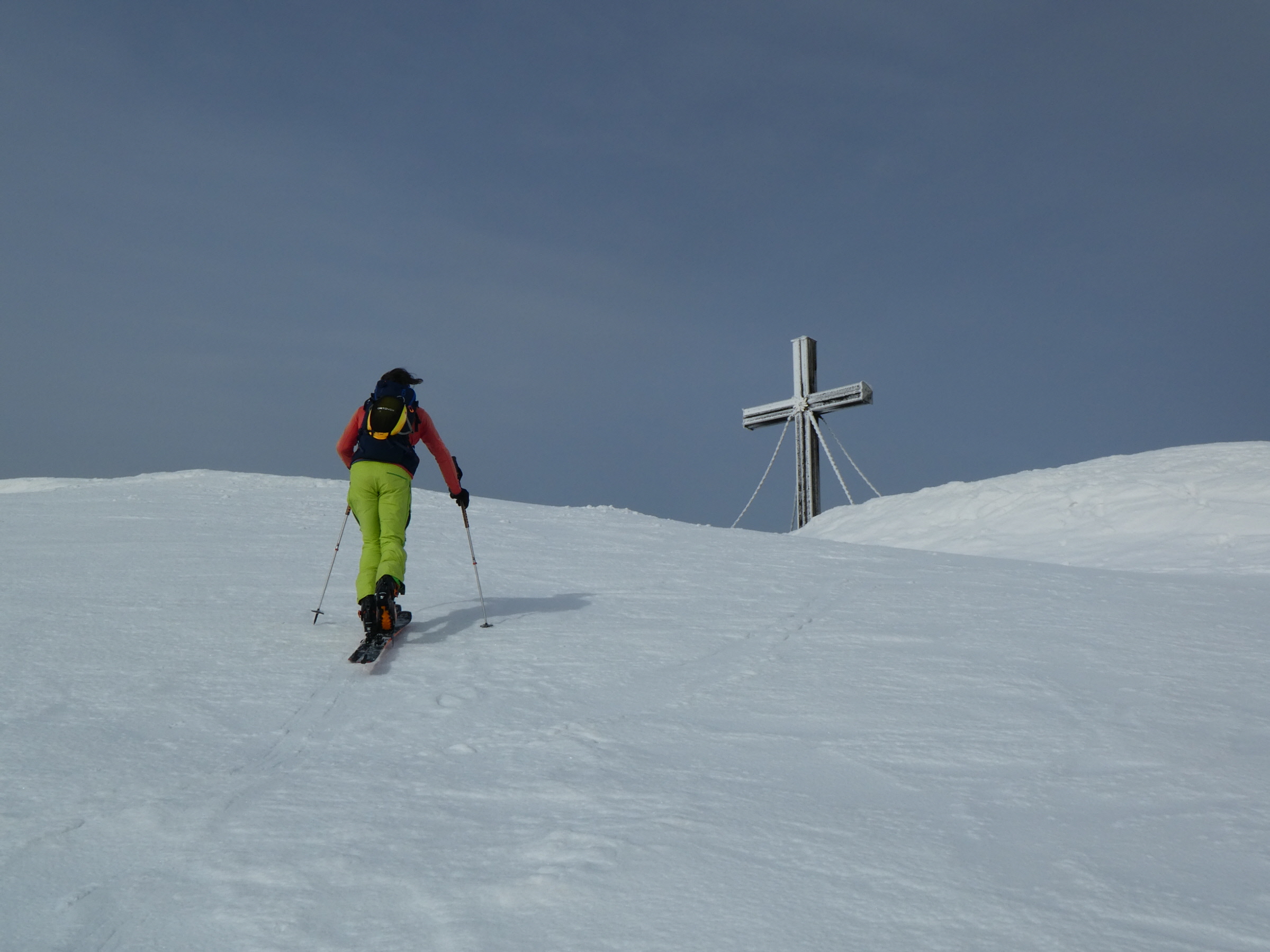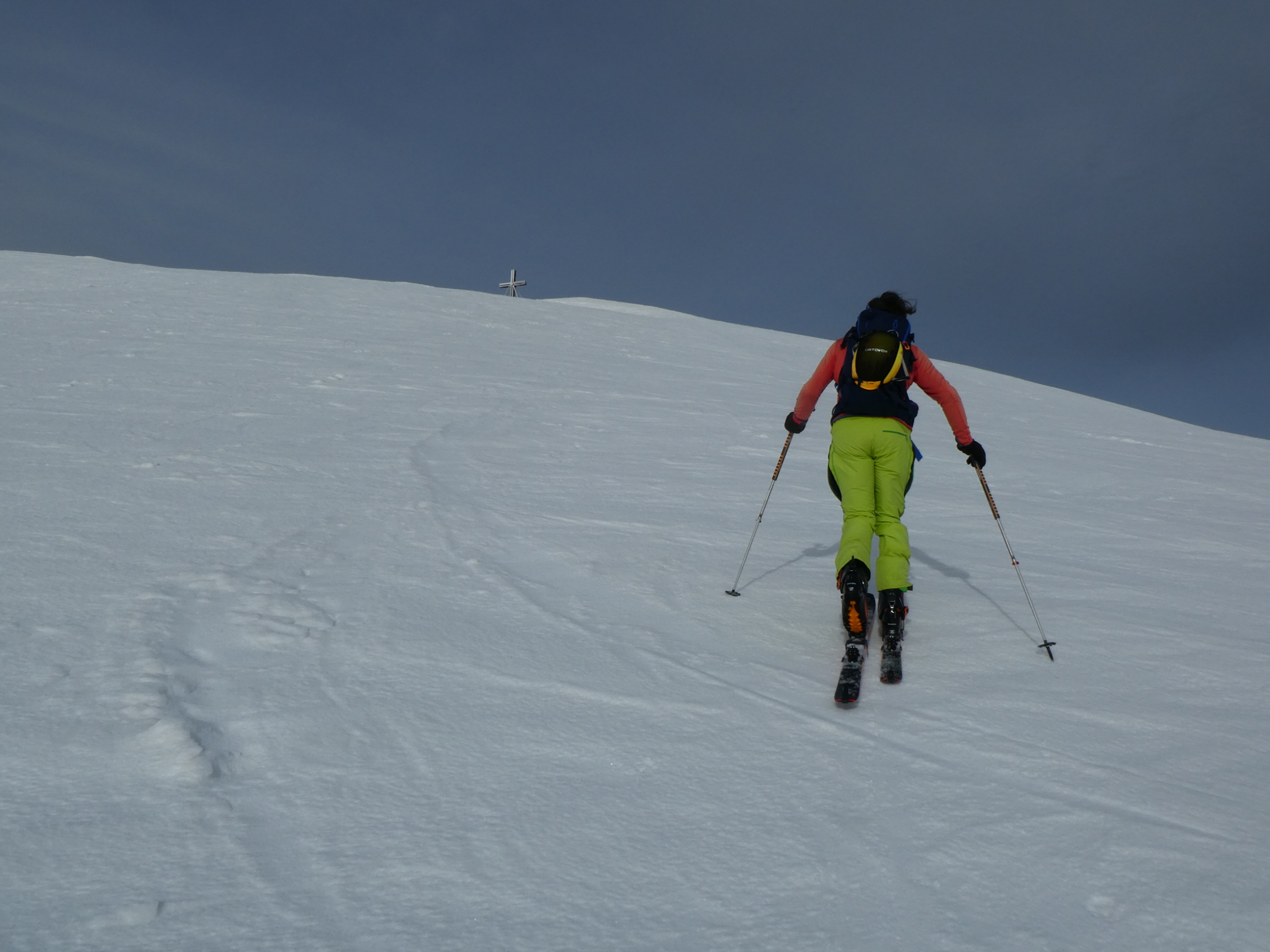 Daher haben wir uns entschlossen zuerst einmal zum Gipfel anzusteigen. Die Sicht auf der Hochfläche war zu diesem Zeitpunkt ganz gut und ist es bis zum Erreichen des Gipfelkreuzes nach einer Aufstiegszeit von 1 Std 40 min (mit Pausen) auch geblieben. Wir haben uns kurz gestärkt und für die Abfahrt umgerüstet. Die haben wir fürs erste einmal in der zweiten Schallerrinne angelegt.