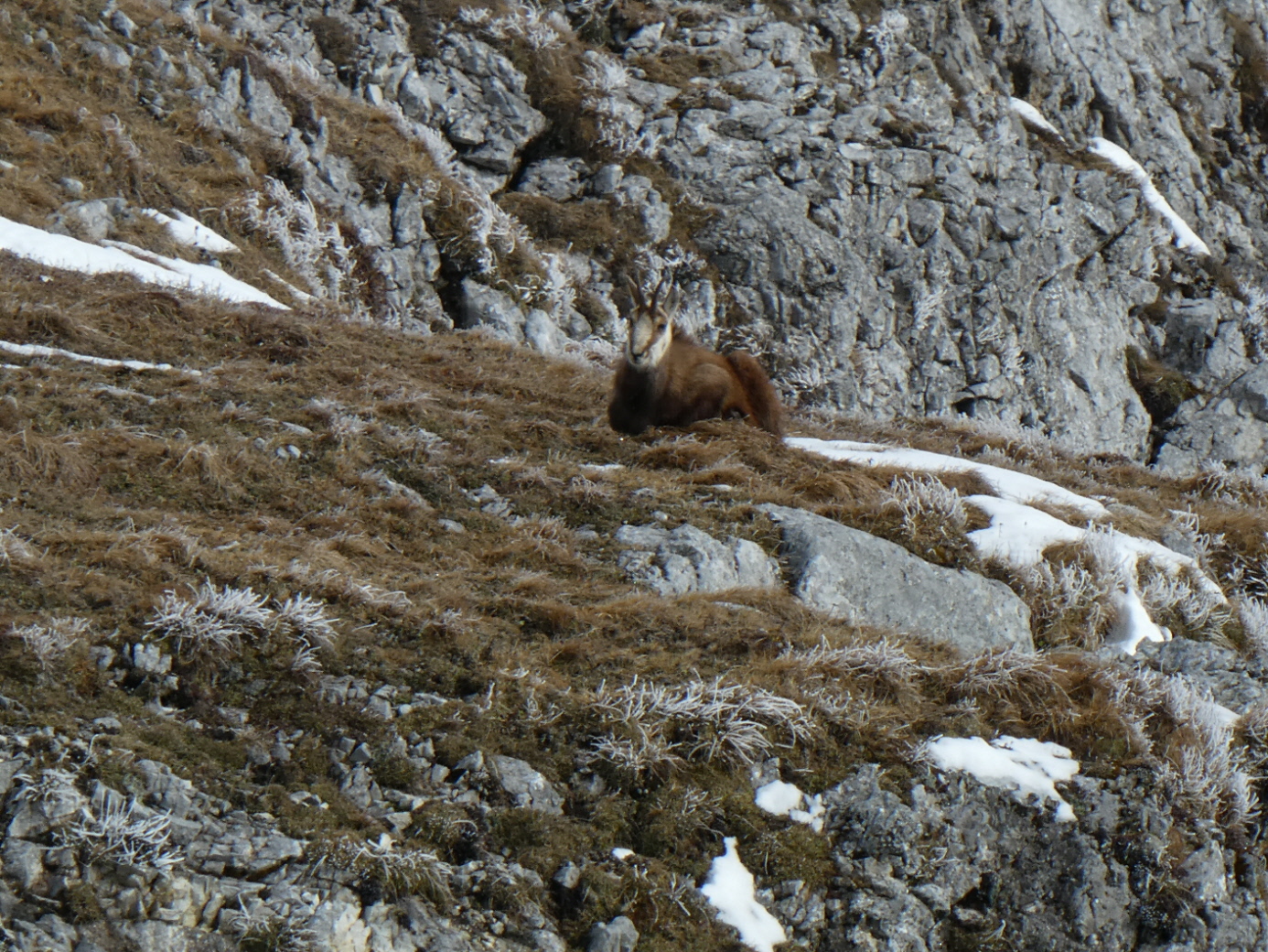Ab dem ersten Meter war Jubeln angesagt. Bestens aufgefirnt war der Schnee im Bereich der Einfahrt. Nach dem Rechtsknick war zwar der enger werdende Schlauch halbseitig abgeschattet, aber trotzdem gut fahrbar. Durch eine kleine Unachtsamkeit bei einem Fotostopp ist mir ein Handschuh entfleucht. Der musste dann etwa 20 Meter weiter unten aus dem zum Glück nicht allzu tiefen Spalt zwischen Felsen und Schneeband geborgen werden.
