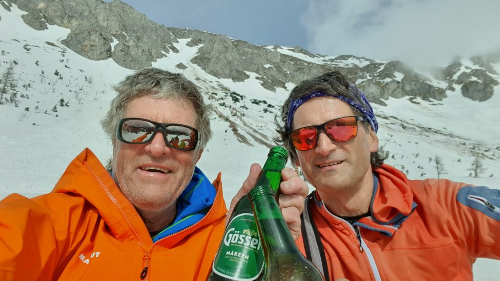 Weil der Einfahrtsbereich in das Hundsschupfenloch durch die südostseitige Ausrichtung noch früher die Sonne abbekommt, haben wir einen weiteren Gipfelanstieg erst gar nicht mehr angedacht und sind nach dem Erreichen der Hochfläche gleich rechts abgebogen und haben etwas unterhalb vom Graf-Meran-Haus für die Abfahrt umgerüstet. Noch eine kleine Stärkung, dann stand dem Abfahrtsvergnügen nichts mehr im Wege.