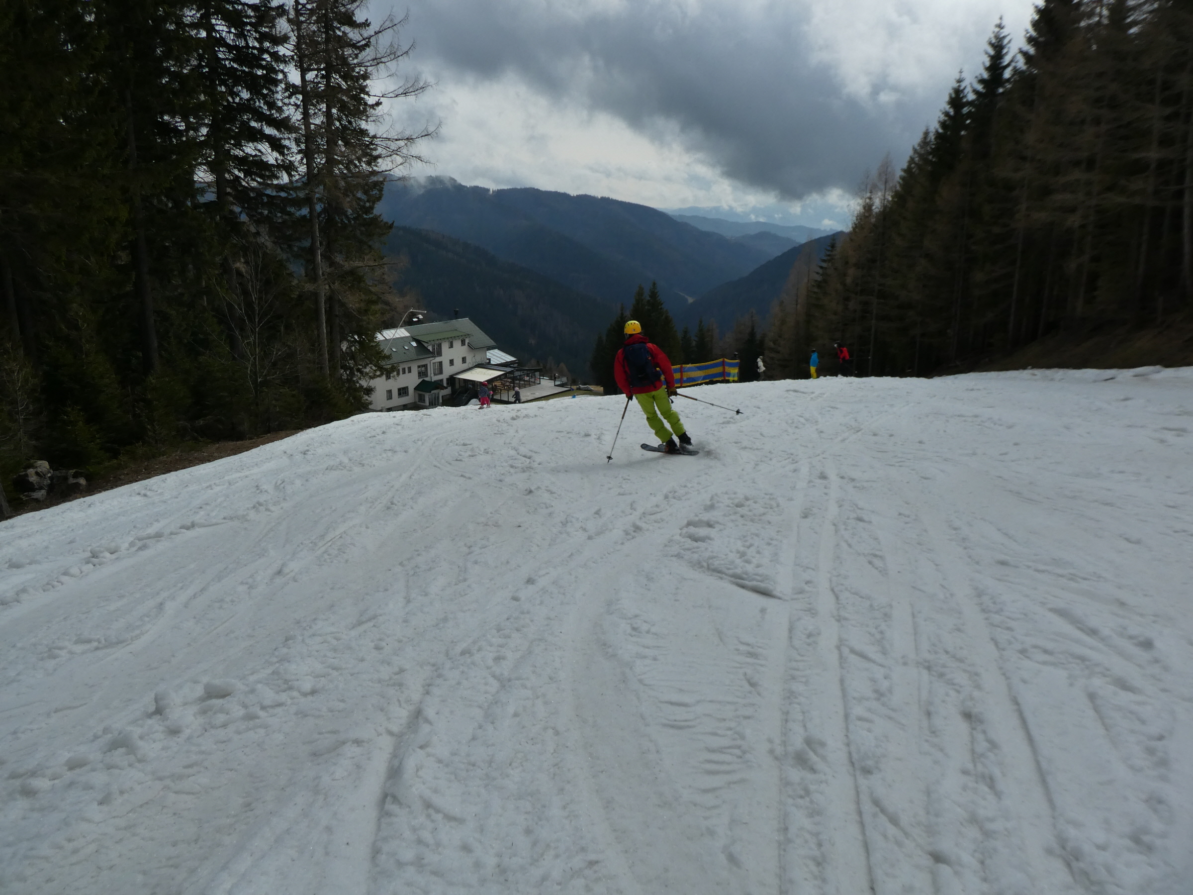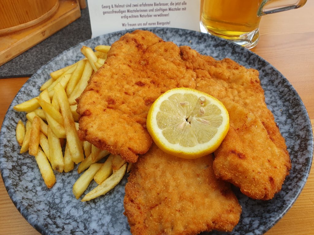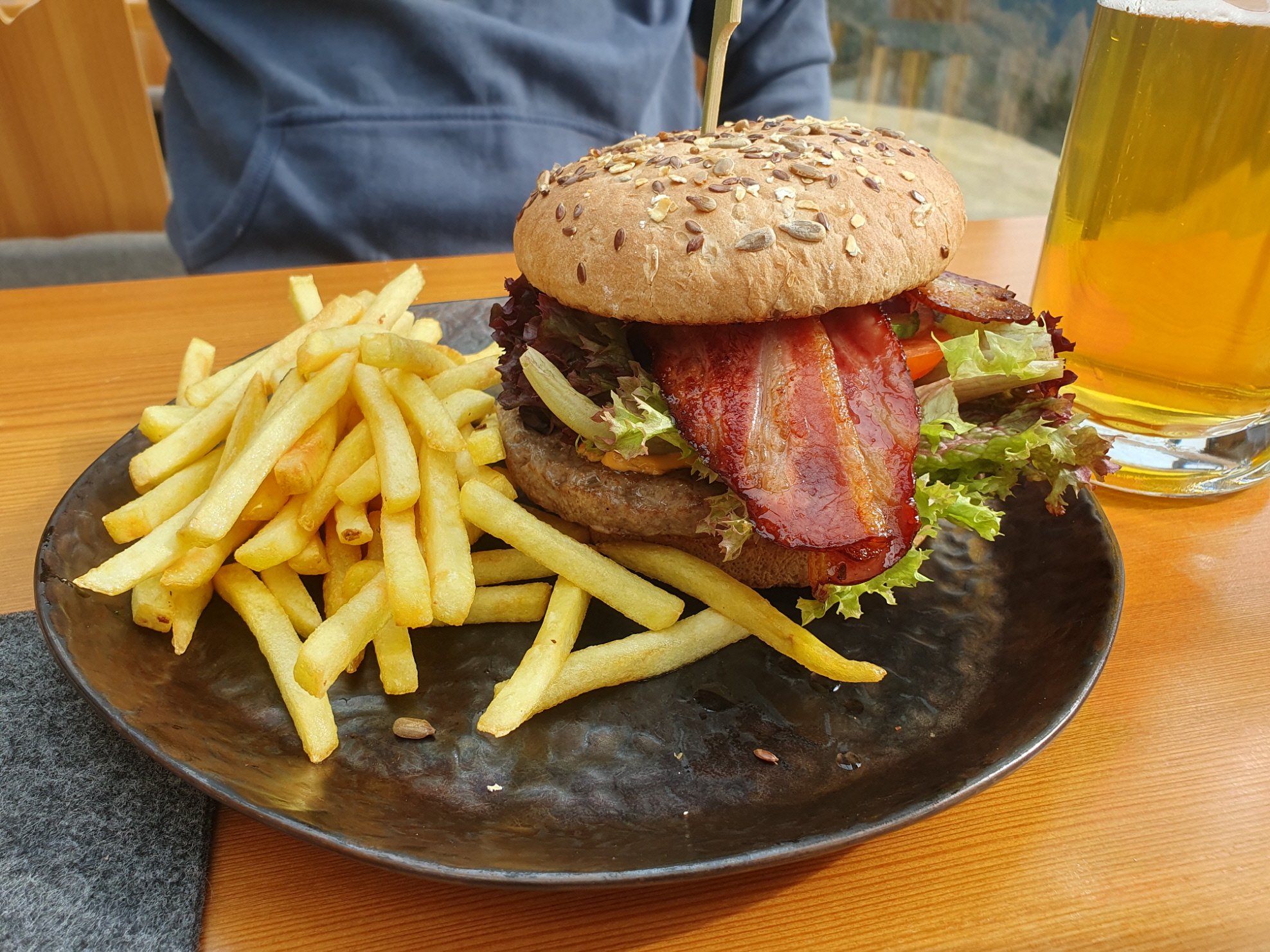 Noch ein kurzes Stück im Gelände, danach über den präparierten Weg kurz nach rechts sind wir anschließend weiter bis zur Piste abgefahren. Dort haben wir dann Fahrt aufgenommen und sind bis zum Ausgangspunkt der Tour beim Scheikl hinunter gecarvt. Nach dem Verstauen der Ausrüstung und dem Umziehen sind wir dort dann auch eingekehrt. Der Heinrich wird sicher nichts dagegen haben, dass er auch heute wieder virtuell an meinem Schnitzel mitknabbern darf. Und dem Andreas wird er an seinem Geburtstag sicher auch den Almburger gönnen.