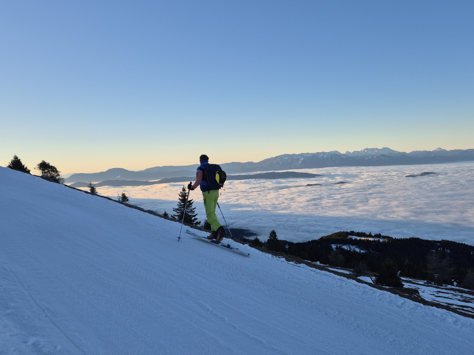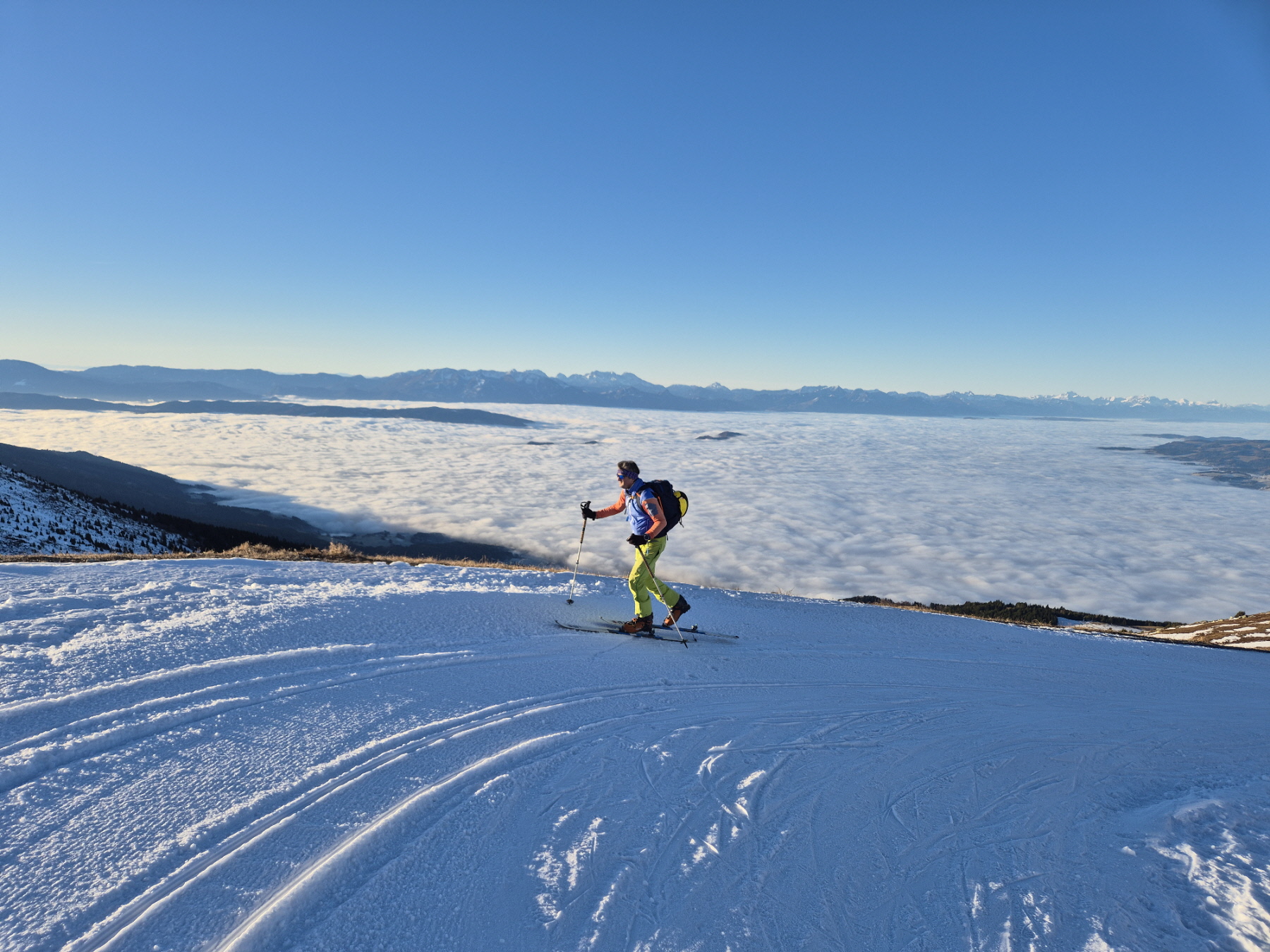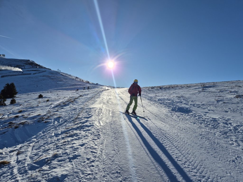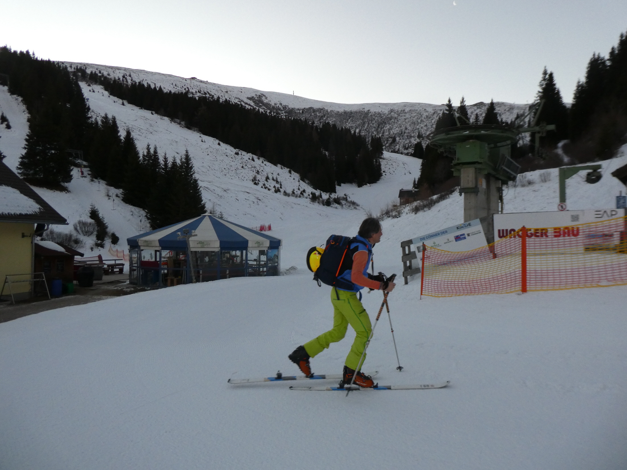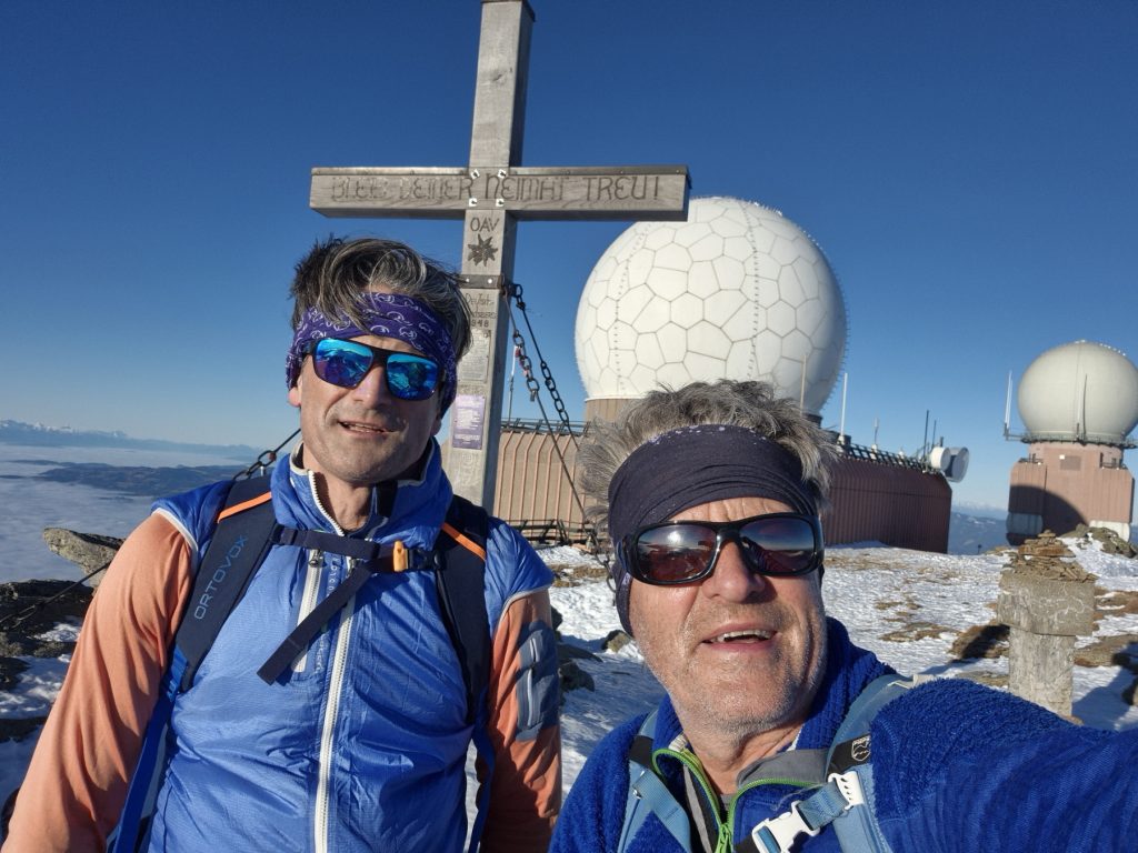 Vor drei Tagen bin ich zusammen mit unserem ältesten Enkel Sebastian im Zuge der Sonderfahrten im Rahmen der Eröffnung der Koralmbahn zweimal durch den längsten Bahntunnel Österreichs mit 230 km/h durchgebraust. Heute ging es viel gemächlicher auf Skiern auf den für den Basistunnel namensgebenden Bergstock, der Steiermark und Kärnten trennt. Weil weit und breit keine nennenswerte Naturschneemenge vorhanden ist, ist es diesmal eine reine Pistenskitour geworden. Und dafür, dass man diese ohne Steinkontakt absolvieren kann, ist der Infrastrukturbeitrag von jeweils € 10,- schon gerechtfertigt.